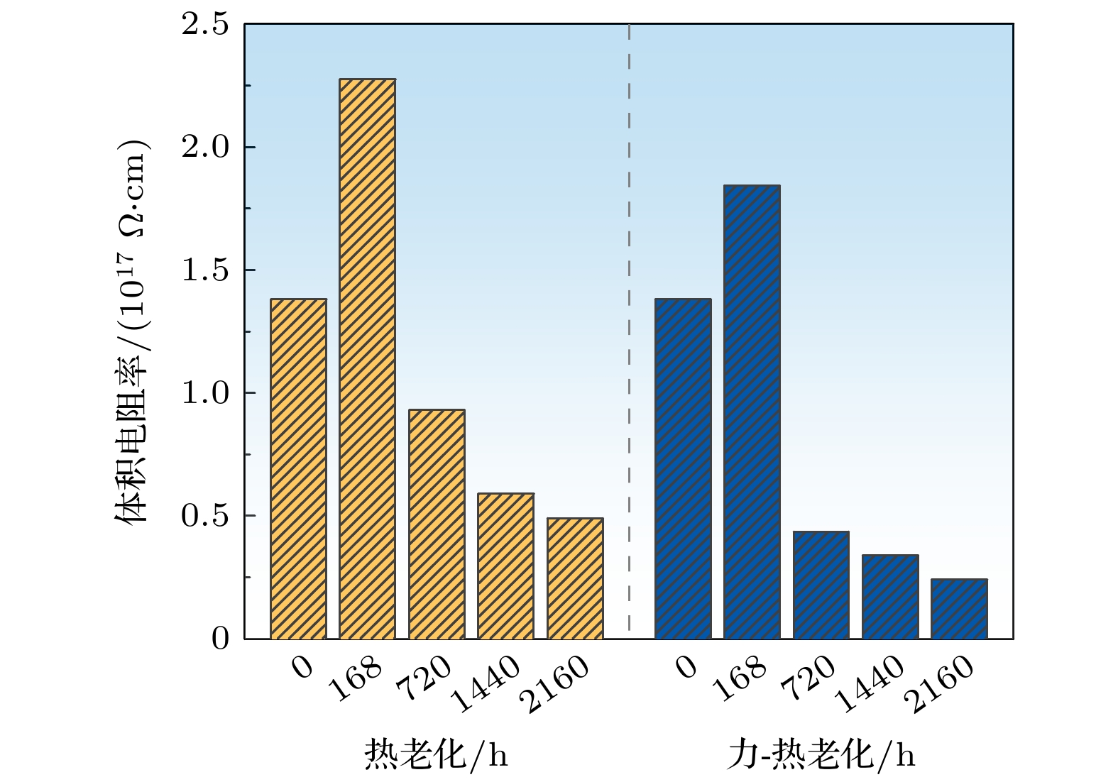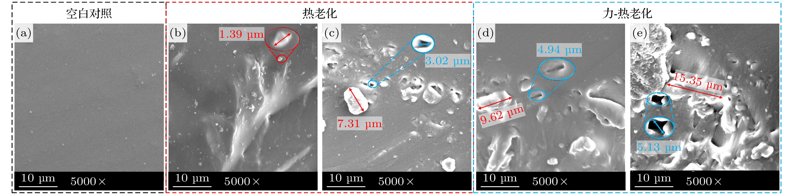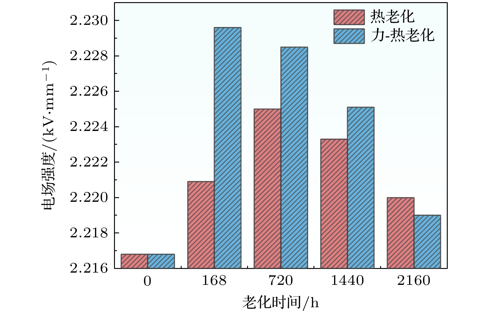 During the long-term operation of a cable, the electrical field, high temperature, and interface stress may age or deteriorate the silicon rubber (SIR) insulation of the cable accessories, affecting the combined electrical-thermal-force performance of the accessories, and easily causing discharge faults. In this work, the electrical-thermal-force properties of silicone rubber for cable accessories under thermal aging and combined force-thermal aging are studied experimentally and numerically. The changes and mechanisms of physical and chemical properties, electrical properties, thermal properties and mechanical properties of silicone rubber are tested and compared before and after aging. The changes of electric, thermal and force field of cable accessories, caused by the change of SIR material parameters under different aging time and aging form, are further simulated. The experimental results show that the crosslinking degree and molecular motion system of SIR will change with the deepening of the aging degree, which will change the electrical-thermal-force properties of the material to different degree. After aging, large agglomeration protrudes and small cavities appear in SIR section, and the damage is more serious under force-thermal aging. The relative dielectric constant first decreases and then increases with the aging time increasing. The volume resistivity, breakdown strength and flashover voltage all first increase and then decrease. The thermal conductivity first increases and then decreases with aging time increasing. In addition, with the increase of aging time, the tensile strength and elongation at break decrease gradually. Considering the change of properties after aging, the destruction of SIR material by force-thermal aging is more serious. The simulation results show that under the two aging modes, the maximum electric field strength at the stress cone root of the cable accessories first increases and then decreases with the increase of time. The electric field strength at the stress cone root of the cable accessories, caused by the force-thermal aging, changes little, maintaining about 2.2 kV/mm. The difference in temperature between the inside and the outside of the insulation layer is obvious under different aging degree, and the temperature difference shows a first decreasing and then increasing trend under both aging modes, and the maximum temperature gradient is 9.15 ℃. The interface stress at the stress cone root decreases from 0.263 to 0.230 MPa, which is about 12.5% lower. This work has guiding significance in evaluating the insulation performance and analyzing the fault of distribution cable accessories.