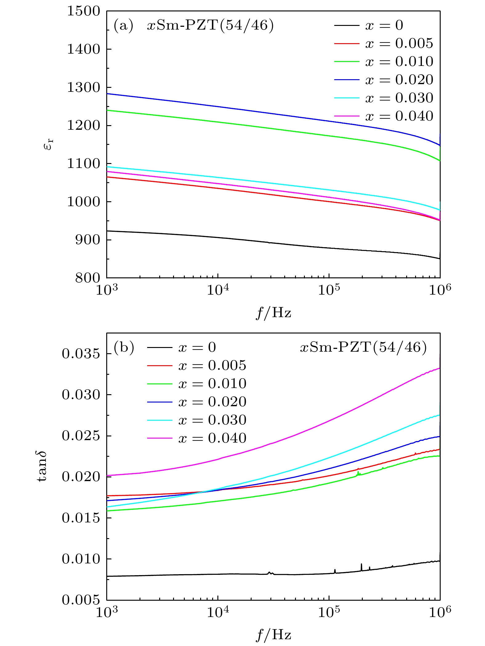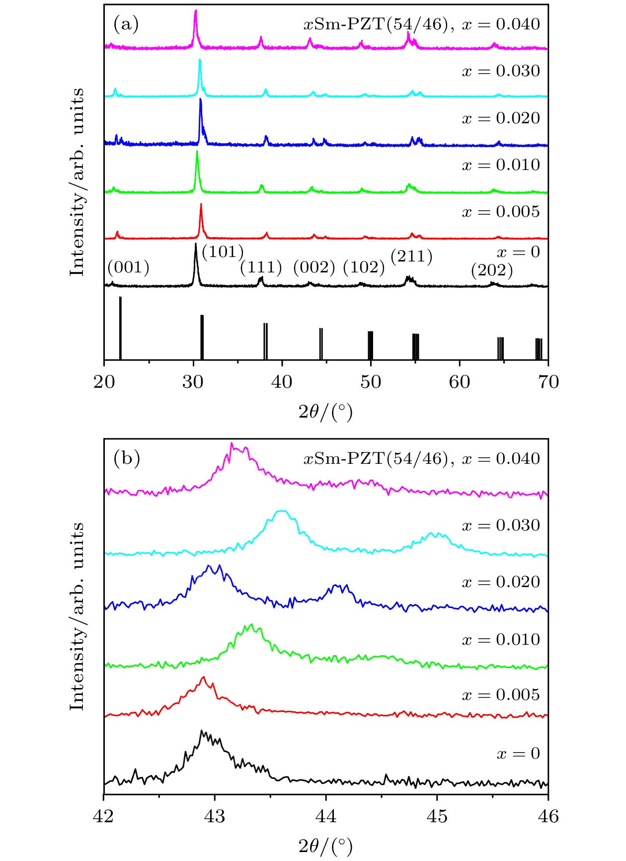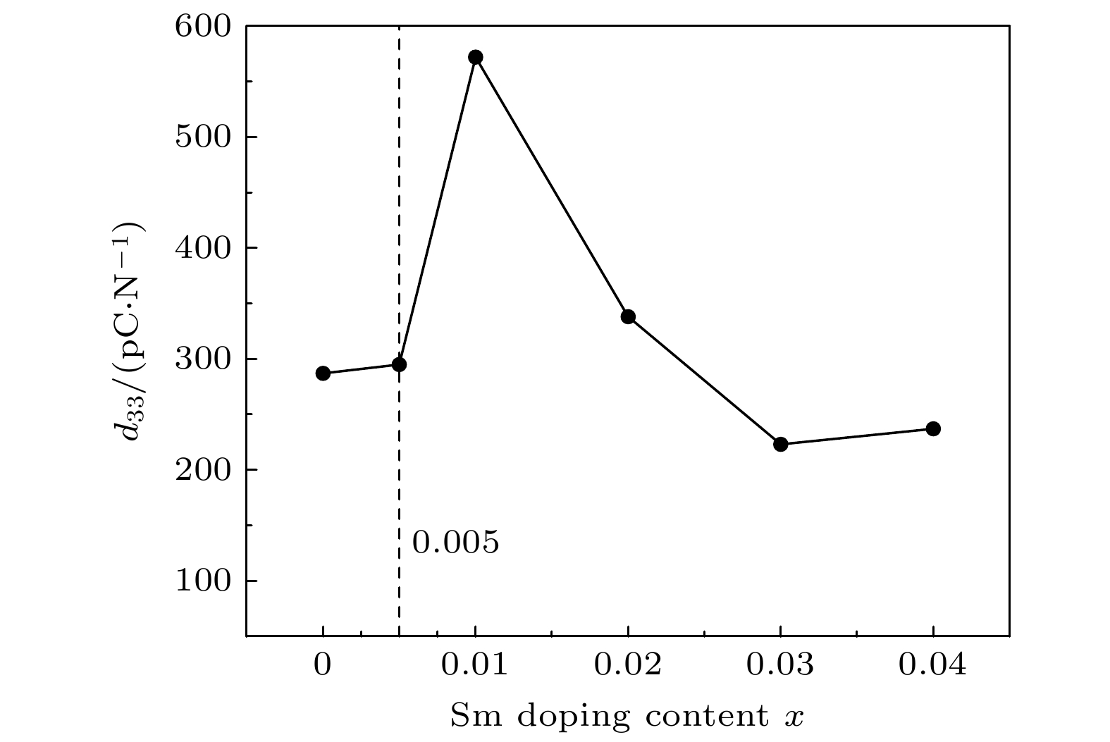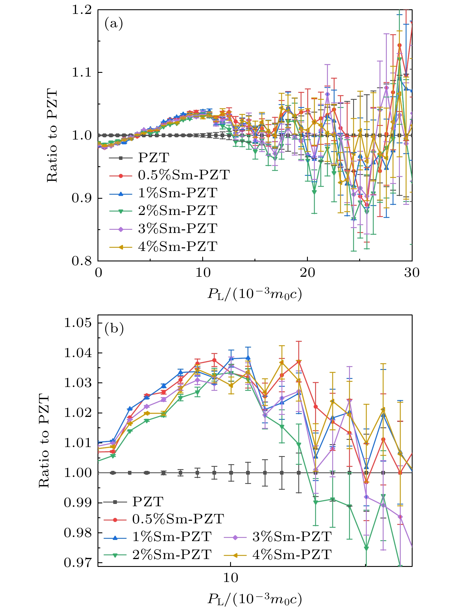 Rare earth dopping, especially samarium (Sm) dopping is considered as an effective way to obtain high piezoelectricity by increasing local structure heterogeneity in Pb-containingABO3perovskite ceramics. Defects play an significant role in determining piezoelectric properties in aliovalent ion doping systems. In order to obtain an insight into the effect of defects, especiallyB-site vacancies on piezoelectricity, Sm-doped PZT(54/46) ceramics compensated byB-site vacancies are fabricated by conventional solid state reaction method. The influence of defects on piezoelectric properties is studied by positron annihilation lifetime spectroscopy (PALS), coincidence Doppler broadening spectroscopy (CDBS), and conventional methods such as X-ray diffraction (XRD), scanning electron microscope (SEM), electrical performance testing on dielectricity, ferroelectricity and pizoelectricity. The XRD results show that all ceramics crystallize in a pure perovskite phase, Sm3+doping causes a transformation from the rhombohedral to tetragonal phase and the morphotropic phase boundary (MPB) lies near Sm3+doping contentx= 0.01–0.02. Electrical performance testing results indicate that with the increase ofx, all of the dielectricity, ferroelectricity and pizoelectricity first increase and then decrease, the sample withx= 0.01 and 0.02 exhibit similar excellent dielectricity and ferroelectricity, while their pizoelectricity differs greatly, the optimal piezoelectric coefficientd33= 572 pC/N (nearly double that of undoped sample) is obtained in the sample withx= 0.01. The PALS results show that Sm doping leads the defect types to change from the coexistence ofA-site andB-site vacancies forx≤ 0.01 to mainlyA-site related defects forx≥ 0.02. The CDBS results further verify that the concentration ofB-site vacancies is highest forx= 0.01 and lowest forx= 0.02. It is inferred that the high pizoelectricity forx= 0.01 is related to its high concentration ofB-site vacancies, which can dilute the number ofA-site vacancies and oxygen vacancies, reducing the chance of forming defect dipoles between anA-site vacancy and an oxygen vacancy, facilitating domain wall motion, and enhancing piezoelectricity. This study indicates thatB-site vacancies can enhance piezoelectricity to some extent, which will provide some guidance for defect engineering.