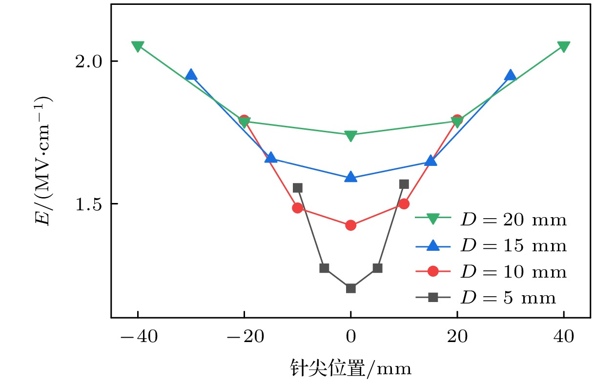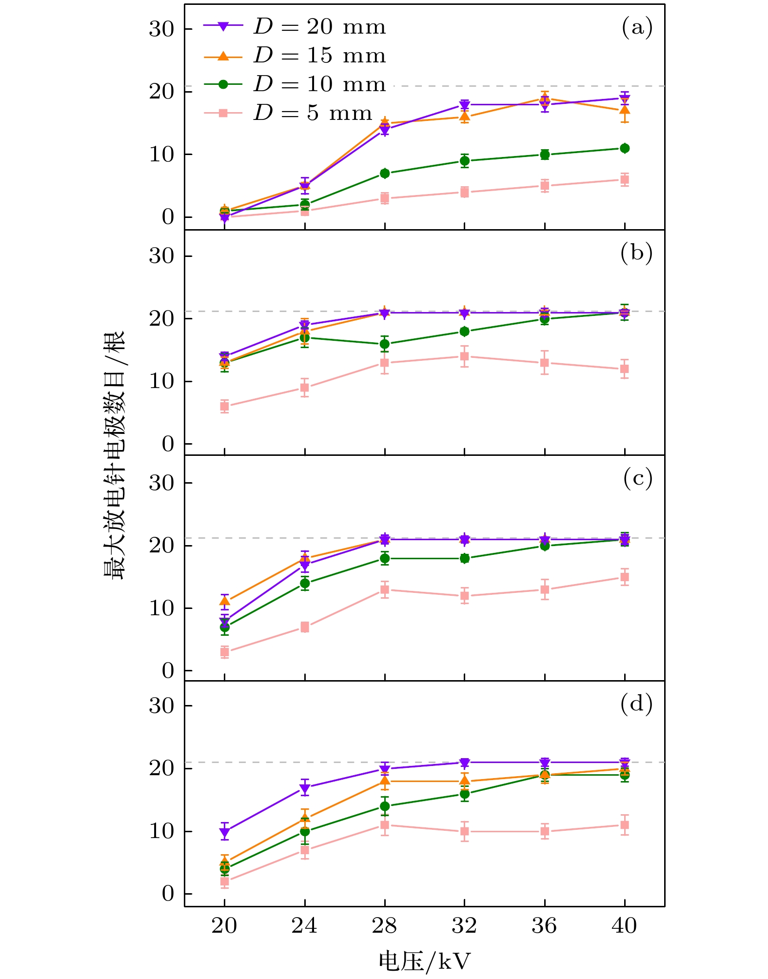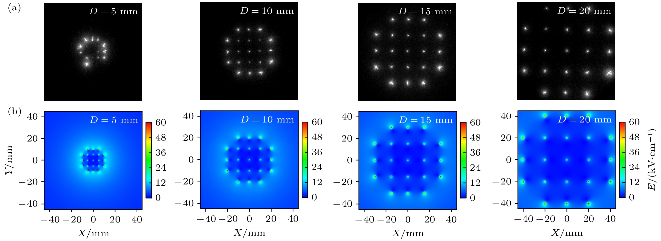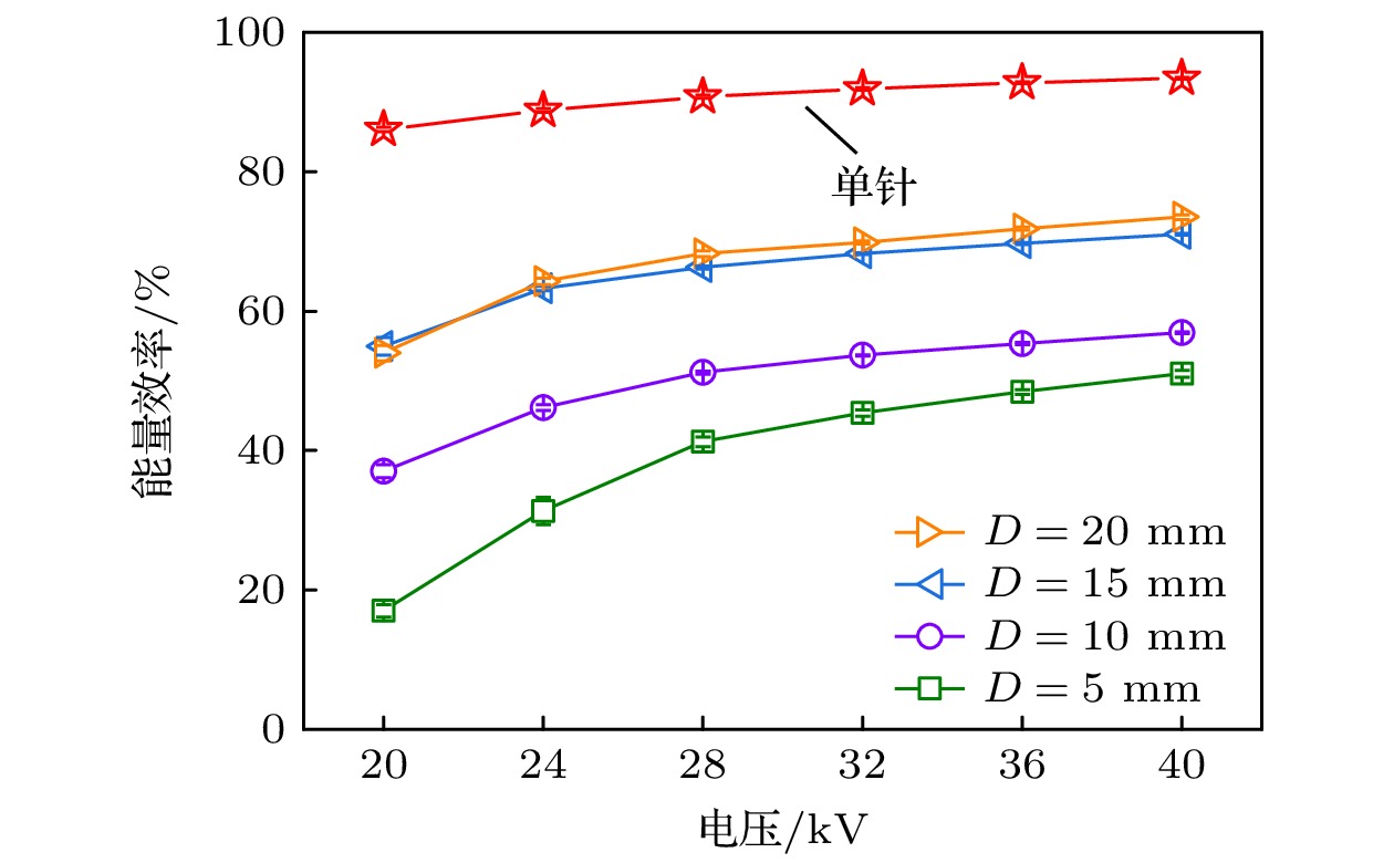 The underwater streamer discharge has received extensive attention in the field of environmental protection, because it can generate free radicals and reactive oxygen species directly in water. The multi-needle electrode is a basic electrode configuration for achieving large-volume underwater streamer discharge. Understanding the discharge characteristics of the multi-needle electrode configuration is important for designing the large-volume discharge reactors. In this work, a multi-needle electrode that can assemble 21 needles is employed. The number of anode needles generating a streamer discharge during a single pulsed discharge and the differences in morphological characteristics between the inside and the edge of the electrode array are investigated by using an ultra-high-speed camera system. The electric field distribution of the multi-needle electrode is simulated by using the COMSOL software, and the effect of the electric field distribution on the discharge of multi-needle electrode is also studied. The discharge energy efficiency of the multi-needle electrode configuration is evaluated. It is found that the 21 needles are not discharged simultaneously during a discharge pulse. The number of discharged anode needles gradually increases and then reaches a maximum value (≤21). The maximum number of discharged anode needles during a single discharge pulse increases as the voltage and needle spacing increases. During a single discharge pulse, the filament generated from the needles at the edge of the electrode array grows longer and deviates more largely from the needle axis than that generated from the needles inside the electrode array. Such characteristics are primarily due to the disturbance of the electric field among the 21 needles. As the needle spacing decreases, the disturbance of the electric field among the 21 needles gets stronger, consequently, the discharge morphology differences between the needles at the edge and needles at the inner of the needle array become more significant, and the energy efficiency of the discharge drops remarkably.