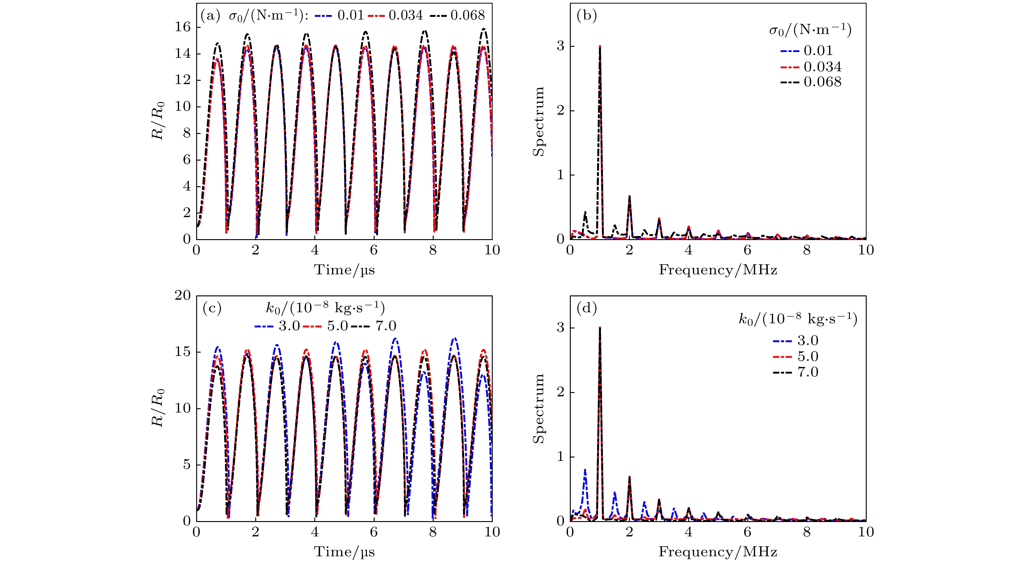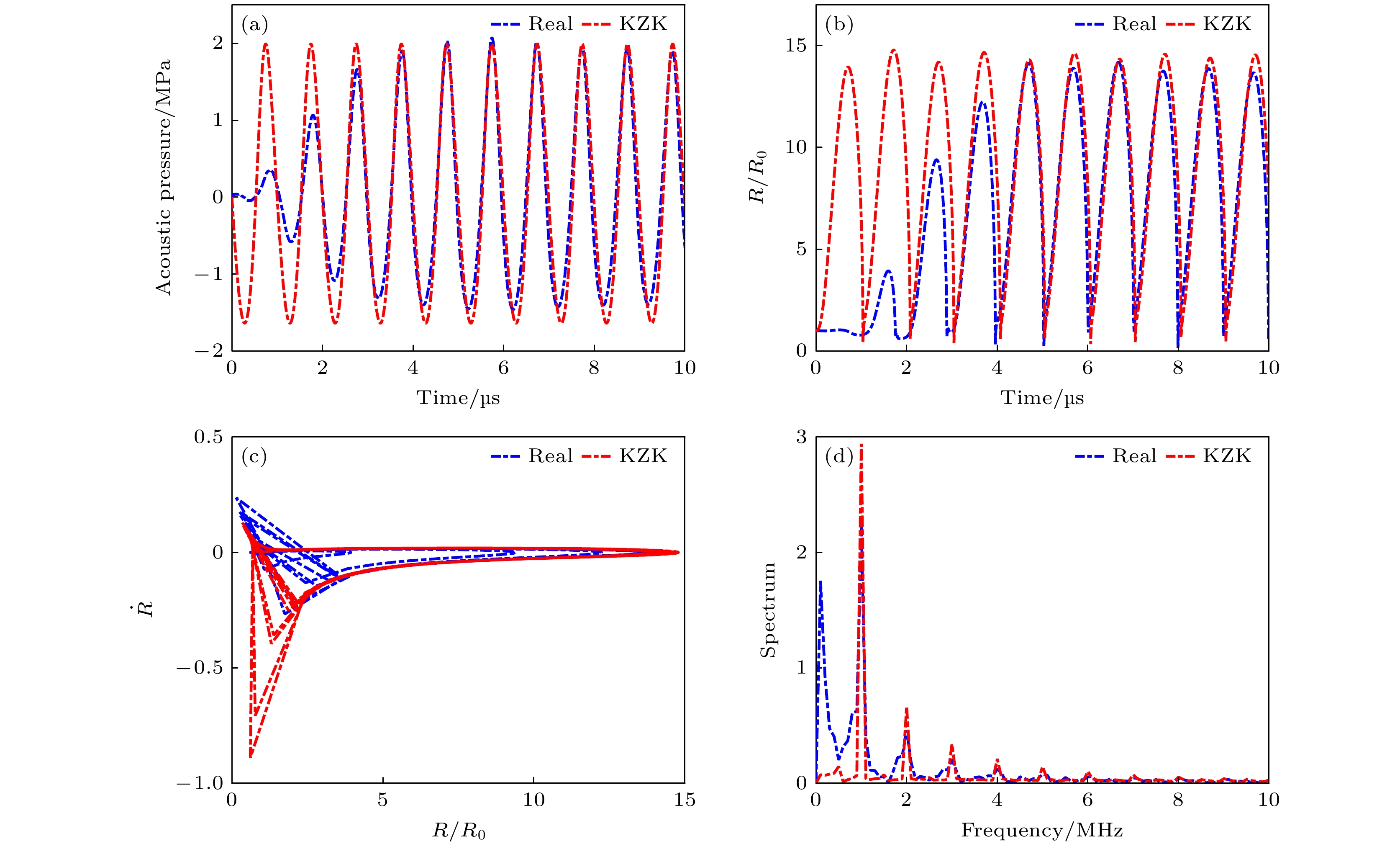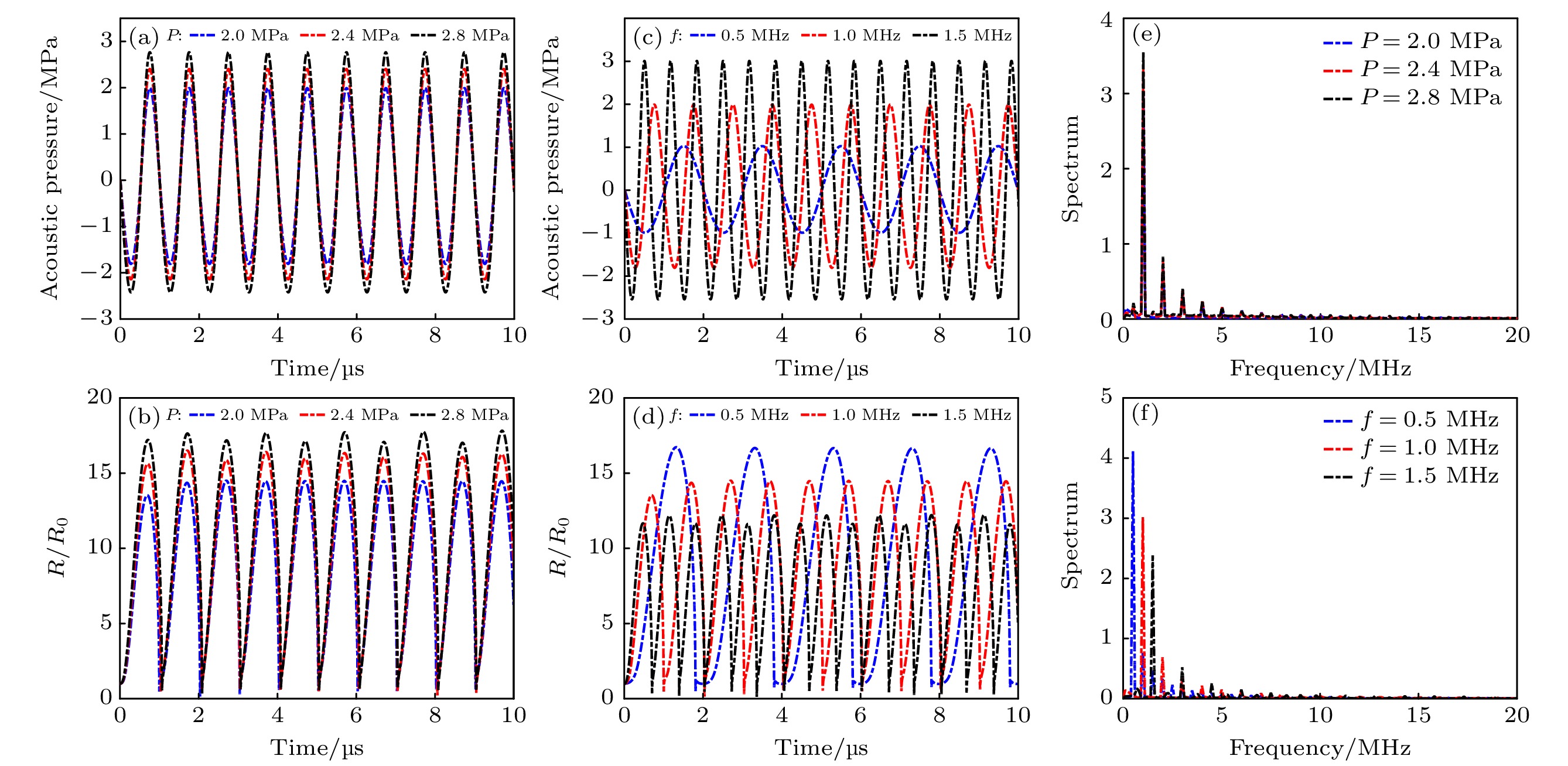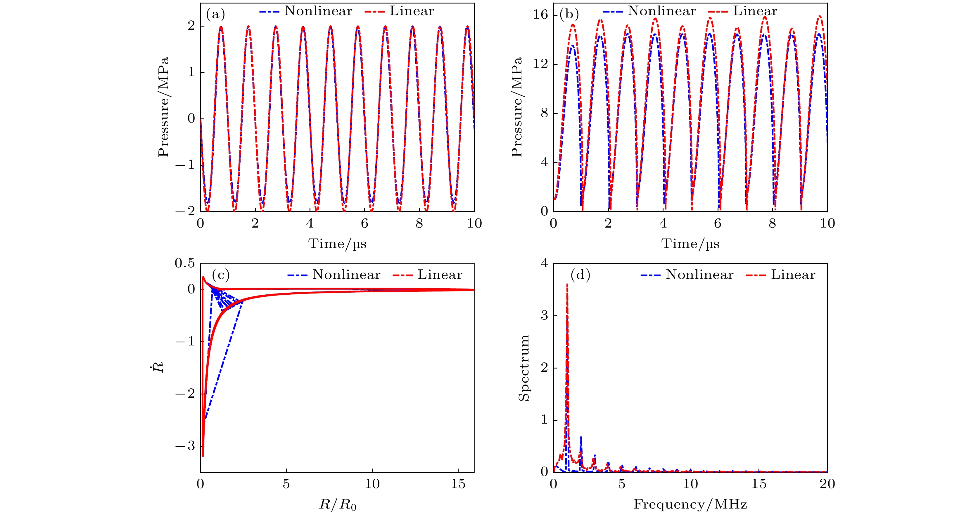 Bubble dynamic behavior and frequency response of encapsulated microbubbles in nonlinear acoustic field is significant in applications such as tumor therapy, thrombolysis, tissue destruction, and ultrasonic lithotripsy. The acoustic cavitation effect includes stable cavitation and transient cavitation. The transformation from stable cavitation to transient cavitation requires a certain threshold, which is also called the transient cavitation threshold. Phospholipid-coated microbubbles are commonly used to enhance acoustic cavitation. However, the acoustic effects of different coating materials are not very clear, especially when considering the nonlinear effects caused by diffraction, scattering, and reflection during ultrasonic propagation. In this paper, the bubble dynamic behaviors and frequency responses of microbubbles under different frequencies, acoustic pressures, and viscoelastic properties of different shell materials are analyzed by coupling the Gilmore-Akulichev-Zener model with the nonlinear model of a lipid envelope and using the KZK equation to simulate the nonlinear acoustic field. At the same time, the influence of the coated material and nonlinear acoustic effects are considered. The bubble dynamic behavior and frequency response under the actually measured sound field are compared with those simulated by the KZK equation. The results show that the nonlinearity will lead the velocity of the microbubble wall to decrease, and when the pressure of ultrasound increases, the main frequency component of the microbubble oscillation increases, making the radial motion of the microbubble more violent. When the frequency changes, the closer the oscillation frequency of the microbubble is to the resonant frequency, the stronger the radial motion of the microbubble is. The coating material can change the harmonic component in the oscillation frequency. When the harmonic is close to the resonance frequency, the radial motion of the microbubble is enhanced. The elasticity of the coated material has almost no effect on the microbubble's frequency response, and the initial viscosity and surface tension of encapsulated microbubble will change the oscillation frequency distribution of encapsulated microbubble. When the initial viscosity of the coated microbubble is smaller, the subharmonic component of the microbubble oscillation increases. When the frequency of the subharmonic is closer to the resonance frequency than the main frequency, the acoustic cavitation effect is significantly enhanced. On the other hand, when the initial surface tension of the encapsulated microbubble increases, the main frequency and subharmonic component of the microbubble oscillation are enhanced, so that the acoustic cavitation effect is also enhanced. Therefore, this study can further elucidate the bubble dynamics of encapsulated microbubbles, stimulated by nonlinear ultrasound, benefiting the frequency response analysis of coated microbubbles under nonlinear acoustic fields.
