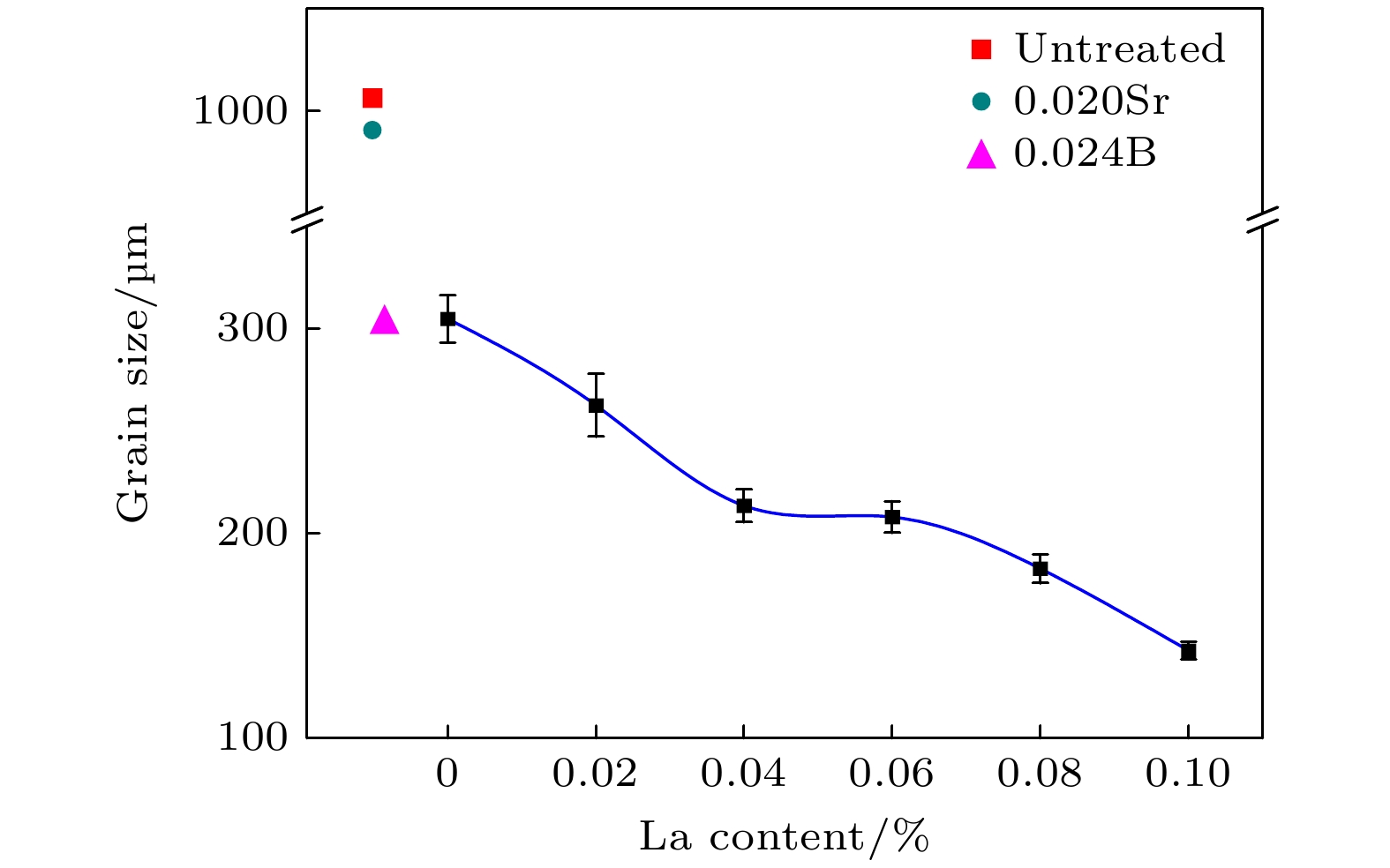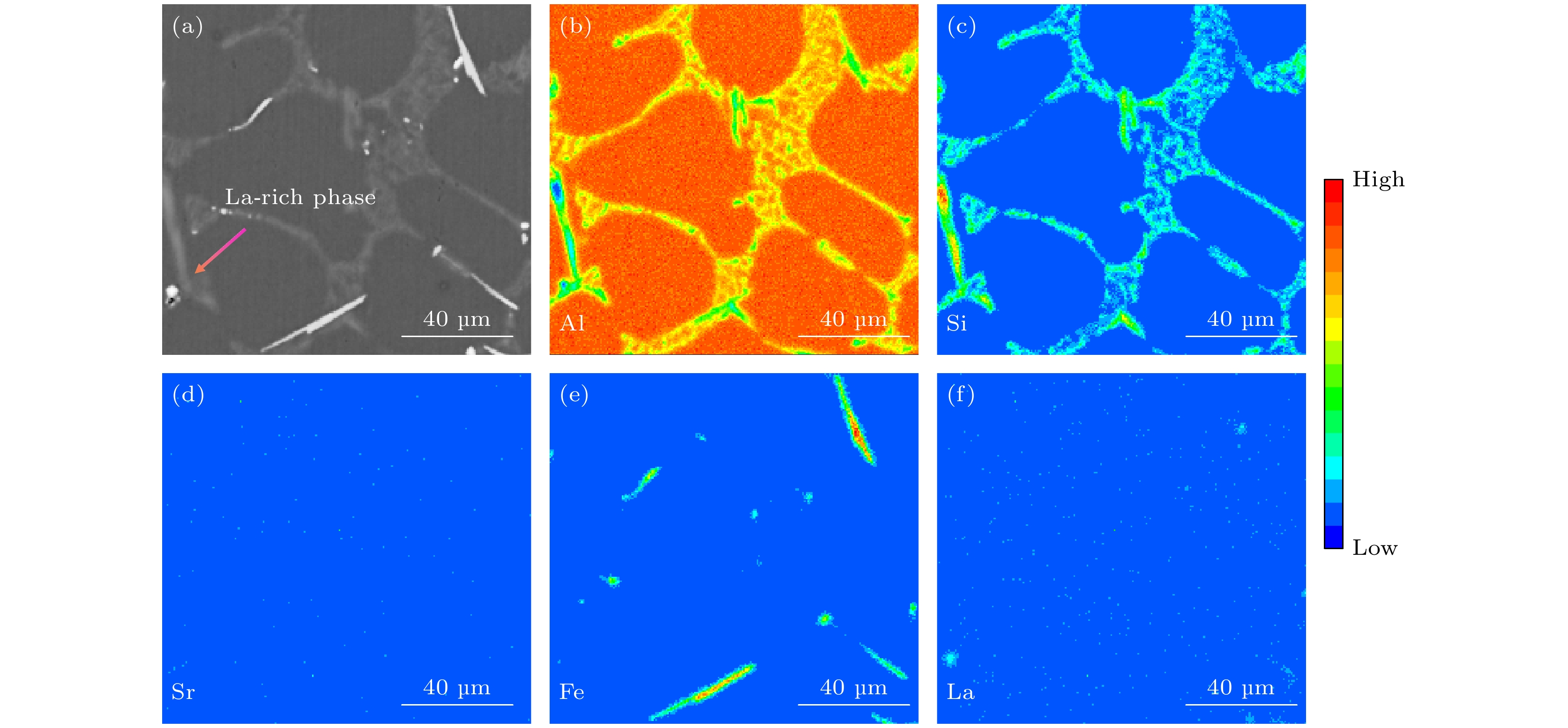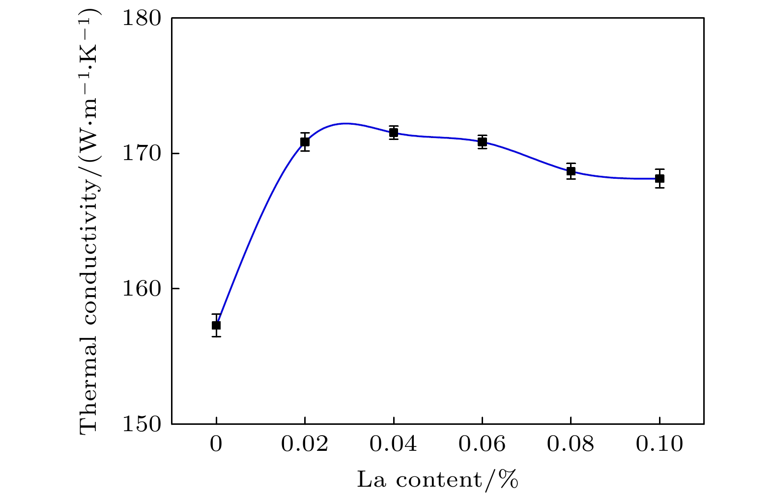 α-Al grains. The thermal conductivity of the alloy is significantly improved when the addition of La ranges from 0.02% to 0.06%; with the further increase of La addition, LaAlSi intermetallic compounds are formed in the alloy, leading the thermal conductivity of the alloy to decrease.