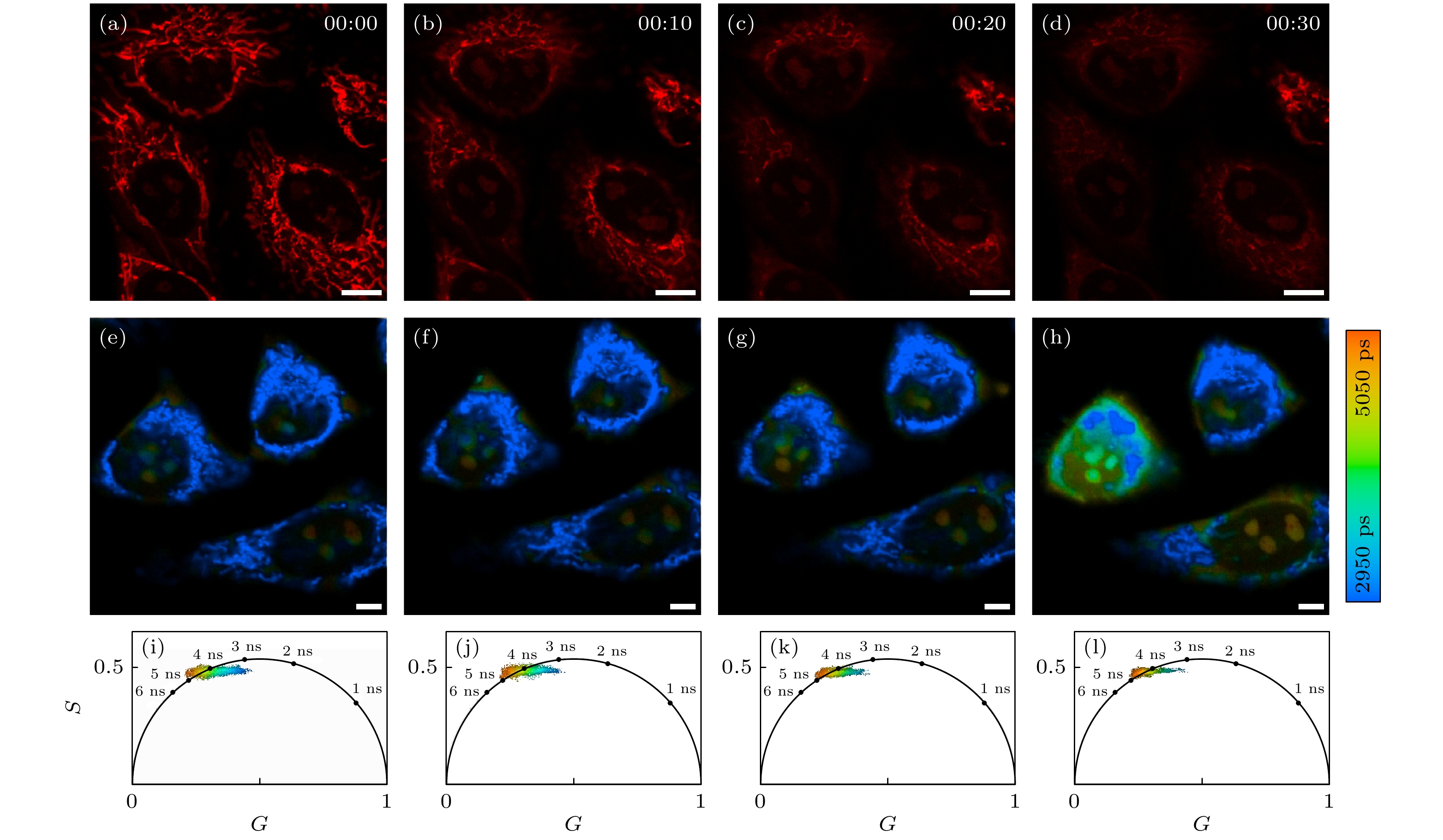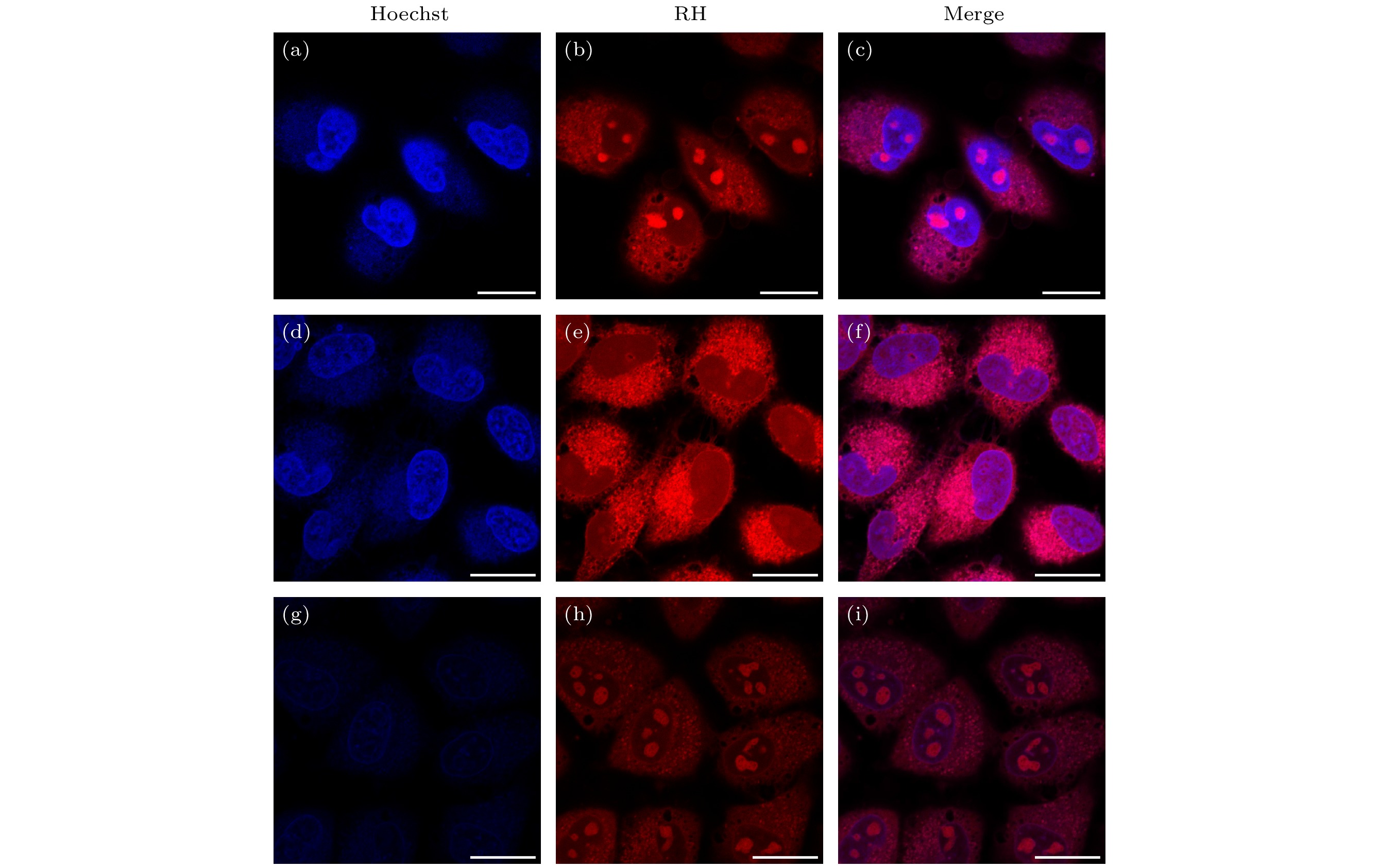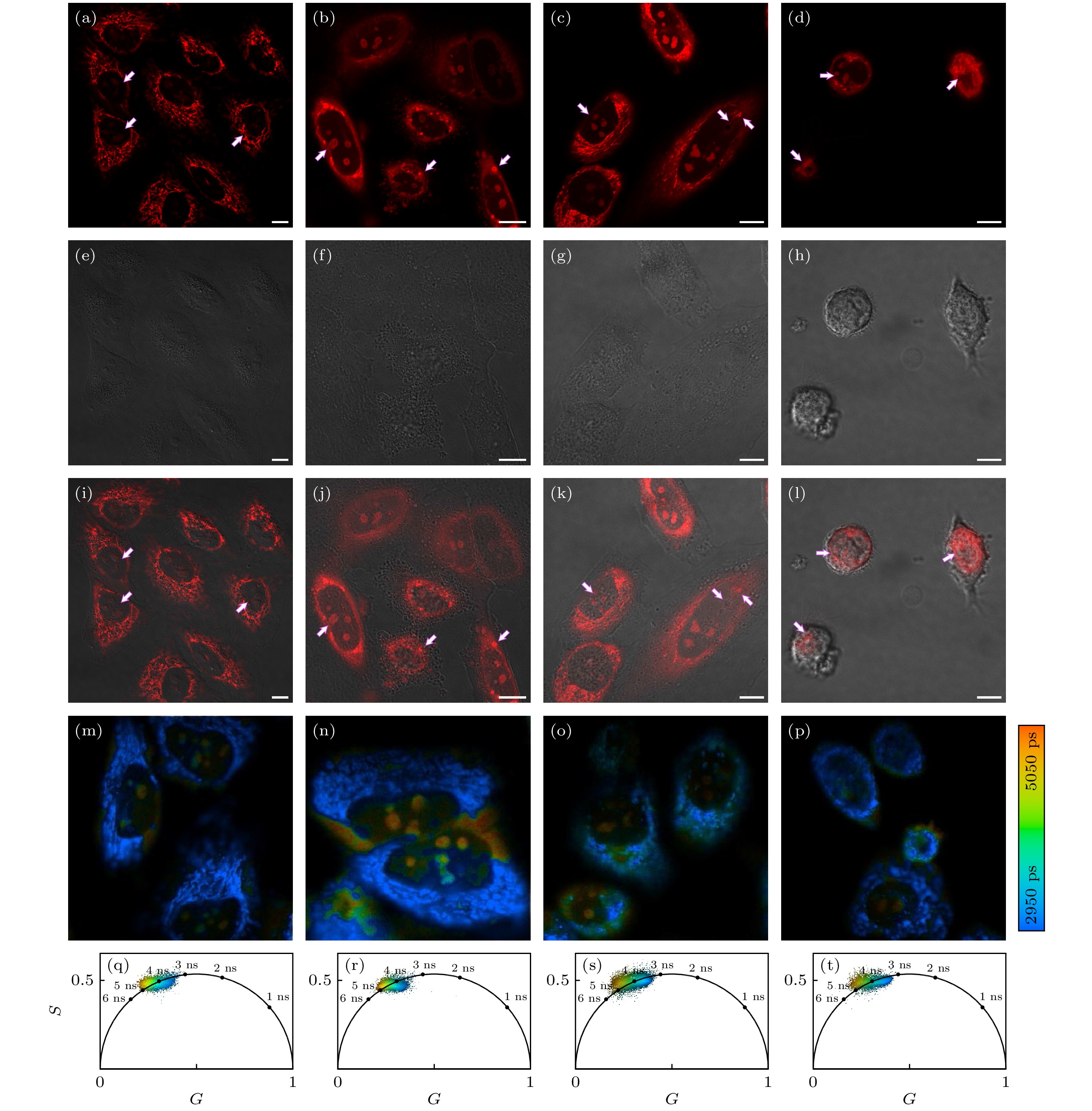 Nucleolus and mitochondria play an important role in maintaining cell balance, and studying their physiological processes is helpful in understanding the biological functions. In this work, a red fluorescent pyrene rhodamine probe is used to target and label cell mitochondria and nucleolus under different conditions, and the binding mode of probe and RNA is also clarified by bio-computational simulation results. Confocal laser scanning microscopy is used to analyze the morphological changes of apoptosis in HeLa cells under the action of laser light, paclitaxel and colchicine, and the changes of microenvironment between mitochondria and nucleolus are quantitatively analyzed by fluorescence lifetime imaging phase map. It is determined that the average fluorescence lifetime of the probe labeled mitochondria in steady-state HeLa cells is about 3.65 ns. The mitochondrial viscosity is about 66×10–3Pa·s. After laser irradiation, mitochondrial fracture and fusion occur, the fluorescence lifetime of the probe decreases to 3.61 ns and the mitochondrial viscosity increases to about 131×10–3Pa·s. The mean fluorescence lifetime of the probe labeled nucleolus of HeLa cells increases from 4.23 ns to 4.32 ns, indicating that the changes of the nucleolus microenvironment is induced by prolonging laser irradiation. Apoptosis is induced by paclitaxel and colchicine, and the nucleolus moves out of the nucleus and into the cytoplasm. Meanwhile, the fluorescence lifetime of the probe labeled nucleolus first increases and then decreases. The treatment time of paclitaxel increases from 0.5 h to 4 h, and the average lifetime of the probe labeled nucleolus of HeLa cells increases from 4.19 ns to 4.47 ns, and finally decreases to 4.42 ns, reflecting the differences in nucleolar microenvironment of HeLa cells induced by different treatment times of paclitaxel. Comparing with the blank HeLa cell, the average lifetime of the probe increases from 4.10 ns to 4.34 ns after 1 h treatment with colchicine at low concentration (10 nmol/L), and continuously increases to 4.47 ns after 1 h treatment with high concentration (100 nmol/L) colchicine. The microenvironments of nucleolus and mitochondria induced by apoptosis induced by colchicine at different concentrations are shown. The above three ways of inducing injury or apoptosis, i.e. by laser light, paclitaxel and colchicine, prove that the changes of nucleolar and mitochondrial microenvironment and functional changes of HeLa cells under the condition of cell instability provide a new method of studying the dynamic process of apoptosis induced by different pathways and the diseases related to nucleolar and mitochondrial dysfunction as well.