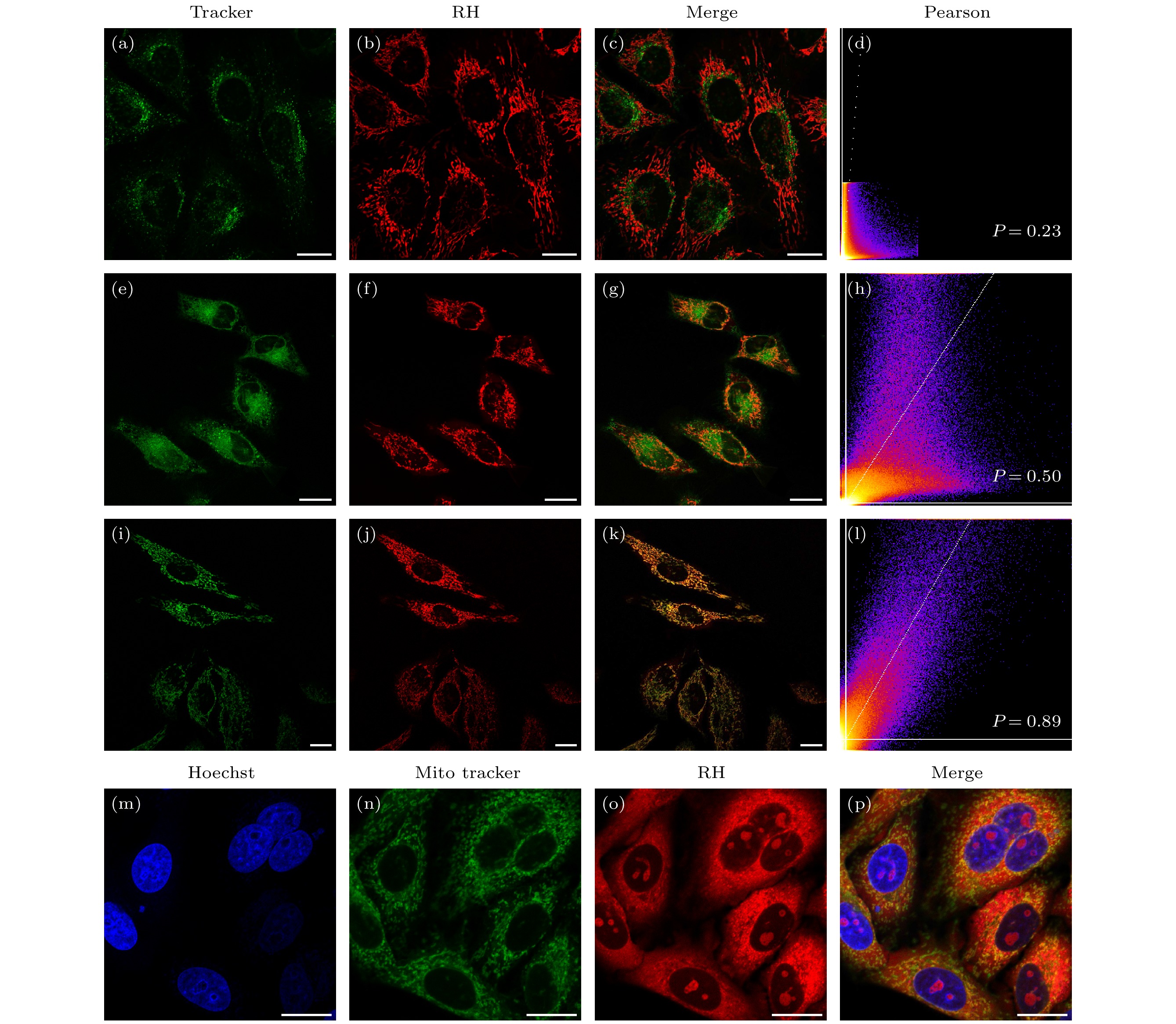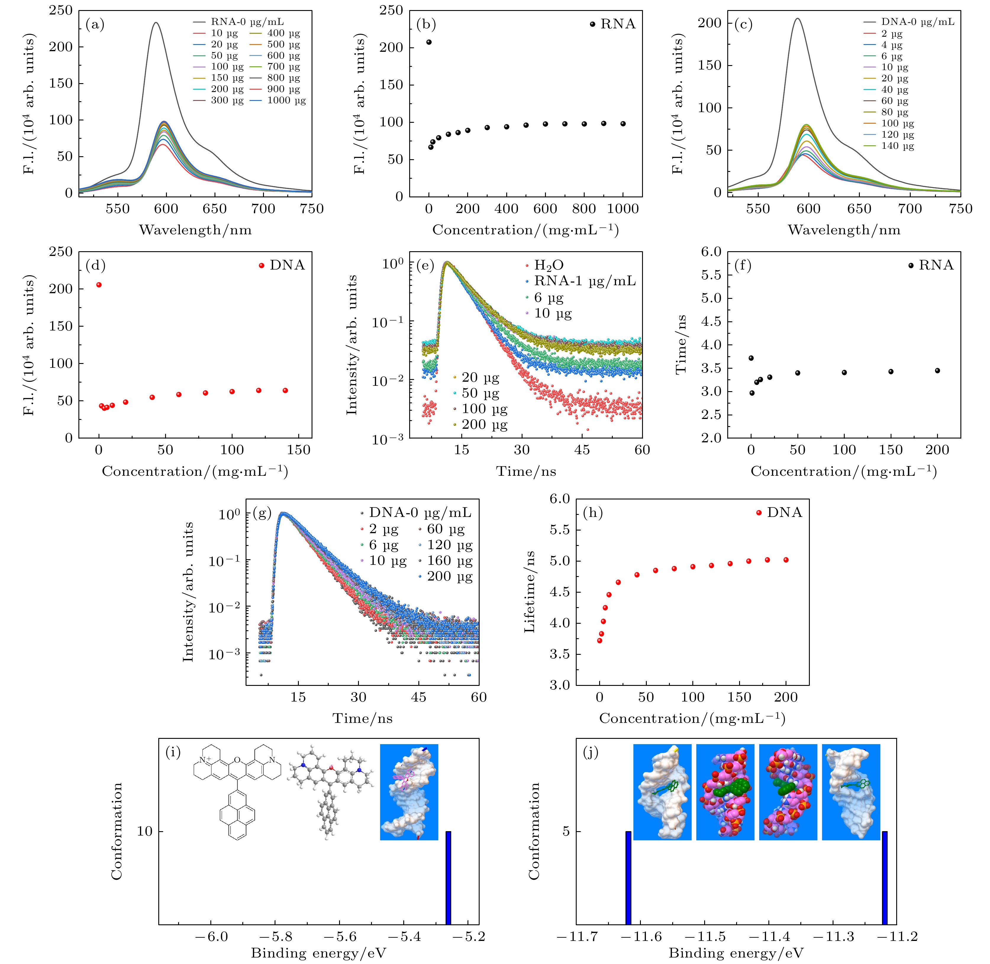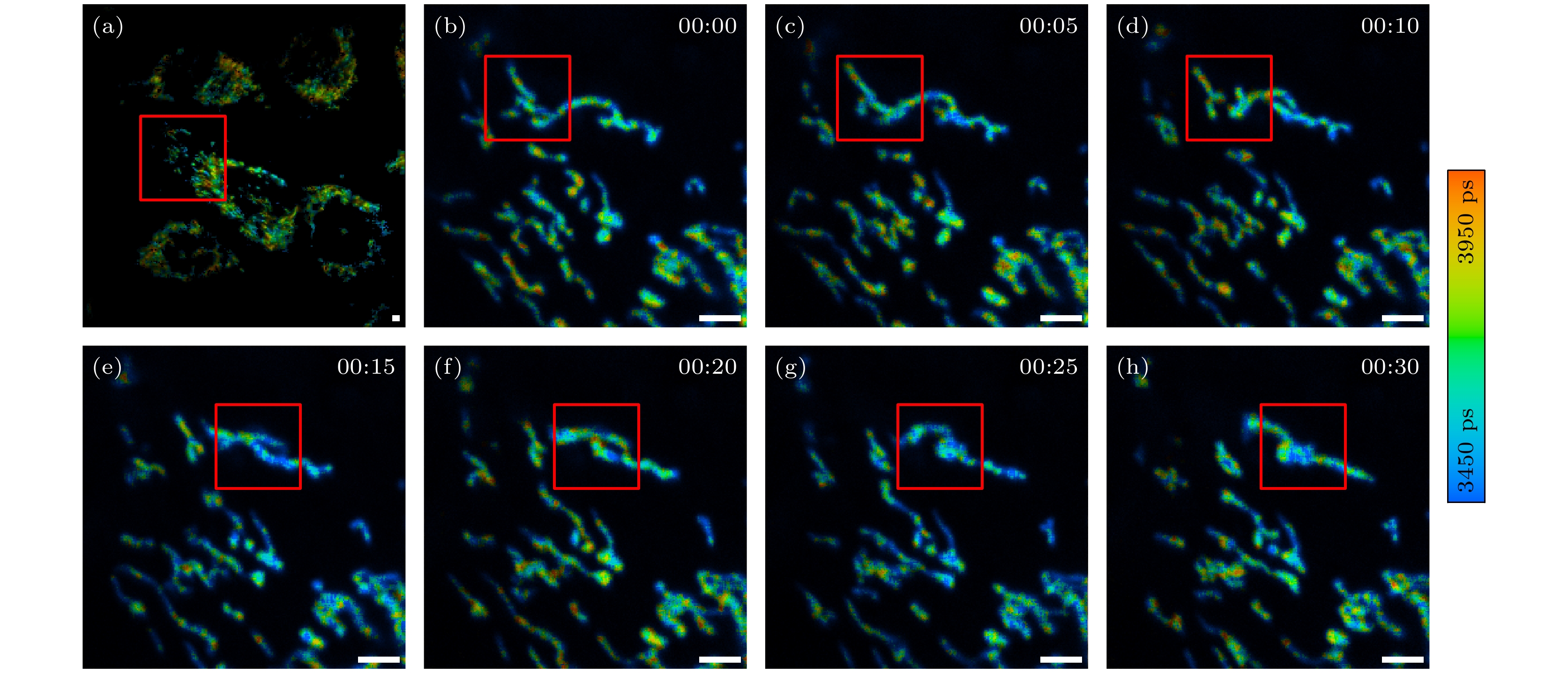 Nucleolus and mitochondria play an important role in maintaining cell balance, and studying their physiological processes is helpful in understanding the biological functions. In this work, a red fluorescent pyrene rhodamine probe is used to target and label cell mitochondria and nucleolus under different conditions, and the binding mode of probe and RNA is also clarified by bio-computational simulation results. Confocal laser scanning microscopy is used to analyze the morphological changes of apoptosis in HeLa cells under the action of laser light, paclitaxel and colchicine, and the changes of microenvironment between mitochondria and nucleolus are quantitatively analyzed by fluorescence lifetime imaging phase map. It is determined that the average fluorescence lifetime of the probe labeled mitochondria in steady-state HeLa cells is about 3.65 ns. The mitochondrial viscosity is about 66×10–3Pa·s. After laser irradiation, mitochondrial fracture and fusion occur, the fluorescence lifetime of the probe decreases to 3.61 ns and the mitochondrial viscosity increases to about 131×10–3Pa·s. The mean fluorescence lifetime of the probe labeled nucleolus of HeLa cells increases from 4.23 ns to 4.32 ns, indicating that the changes of the nucleolus microenvironment is induced by prolonging laser irradiation. Apoptosis is induced by paclitaxel and colchicine, and the nucleolus moves out of the nucleus and into the cytoplasm. Meanwhile, the fluorescence lifetime of the probe labeled nucleolus first increases and then decreases. The treatment time of paclitaxel increases from 0.5 h to 4 h, and the average lifetime of the probe labeled nucleolus of HeLa cells increases from 4.19 ns to 4.47 ns, and finally decreases to 4.42 ns, reflecting the differences in nucleolar microenvironment of HeLa cells induced by different treatment times of paclitaxel. Comparing with the blank HeLa cell, the average lifetime of the probe increases from 4.10 ns to 4.34 ns after 1 h treatment with colchicine at low concentration (10 nmol/L), and continuously increases to 4.47 ns after 1 h treatment with high concentration (100 nmol/L) colchicine. The microenvironments of nucleolus and mitochondria induced by apoptosis induced by colchicine at different concentrations are shown. The above three ways of inducing injury or apoptosis, i.e. by laser light, paclitaxel and colchicine, prove that the changes of nucleolar and mitochondrial microenvironment and functional changes of HeLa cells under the condition of cell instability provide a new method of studying the dynamic process of apoptosis induced by different pathways and the diseases related to nucleolar and mitochondrial dysfunction as well.