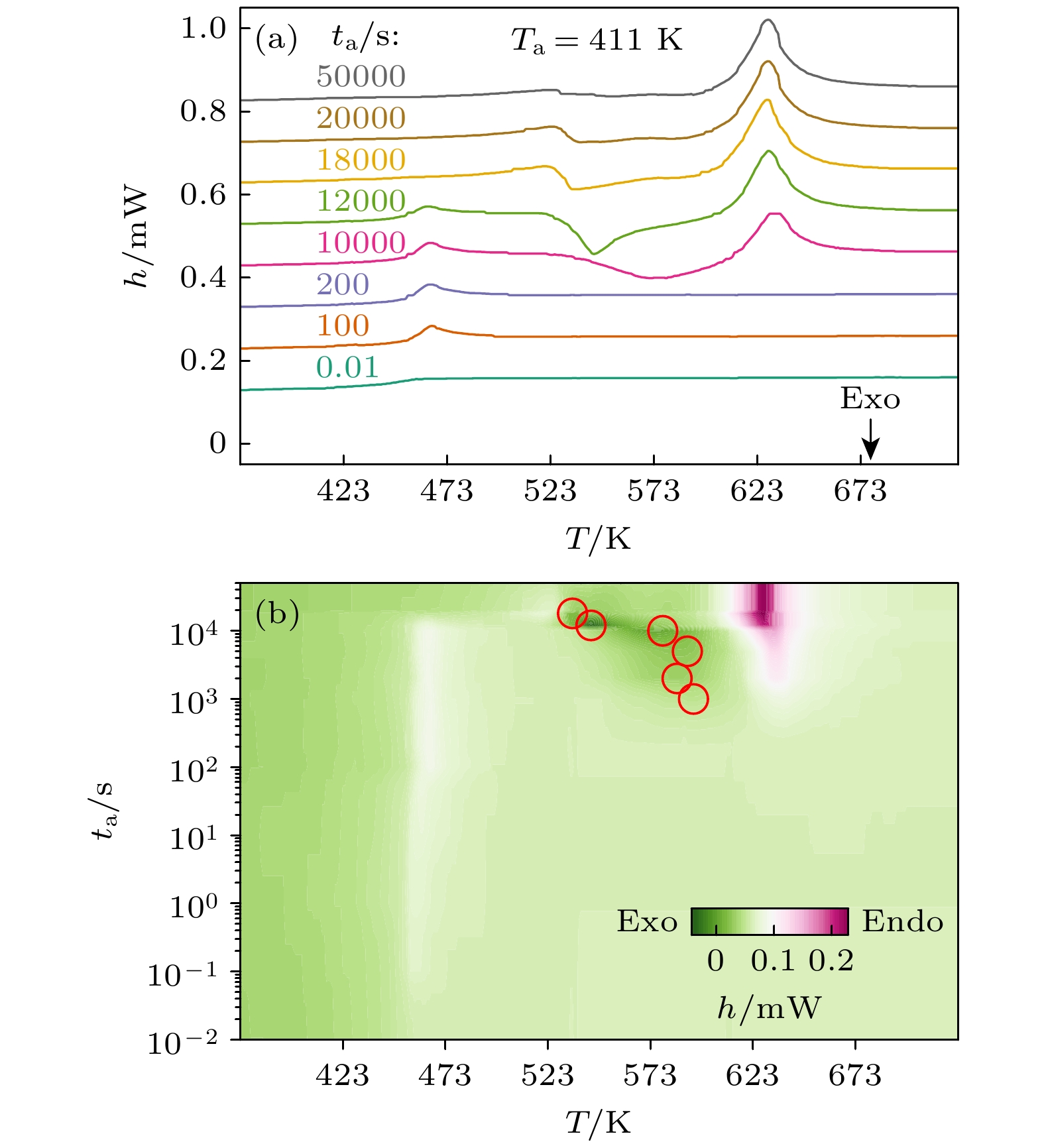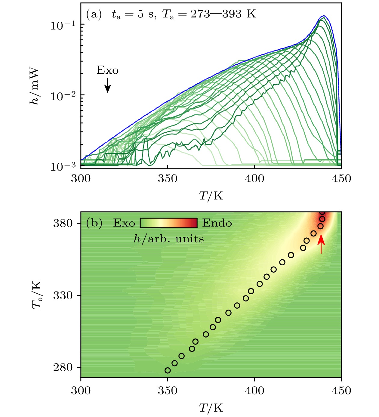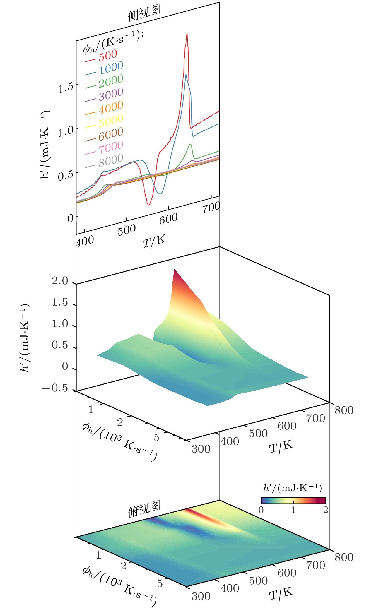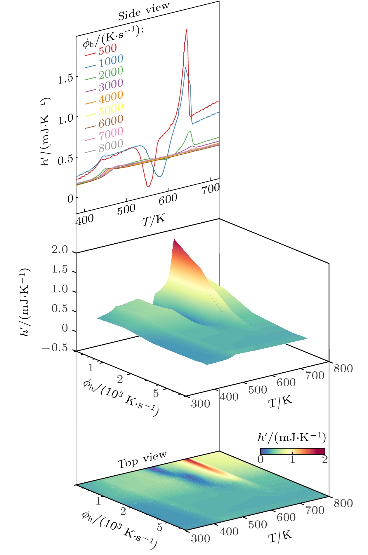 Ultrafast differential scanning calorimetry is the third-generation technique of differential thermal-analysis. It can fast heat up to 60000 K/s or fast cool down to 40000 K/s, so its temperature-changing rate spans five orders of magnitude, and permit repeating experiments on compounds or materials with a melting point lower than 1000 ℃. The unique rate of temperature change allows it to record structural changes of sample in milliseconds, producing a significant number of data. A “top-view” graph is suggested in this study for data analysis. It basically projects the heat flow onto a plane of variables such as temperature, rate or time and uses color contrast to describe the intensity change of heat flow. The issues with “side-view” graphs, where it is a challenge to discern rate or time from several curves, are successfully resolved by this novel technique. It can also realize a comparison of the kinetics among several co-existing physical events. Using an Au-based metallic glass as an example material, this work collects the data from four “side-view” graphs in literature, replots the data on “top-view” graphs, and compares pros and cons. Any substance or material to be examined by utilizing fast differential scanning calorimetry can be examined through using the “top-view” approach. It is useful not only for data analysis but also for constructing processing maps for novel materials, finding new structural transitions, and examining the kinetic behaviors of physical phenomena. All the data presented in this paper are openly available at https://doi.org/ 10.57760/sciencedb.j00213.00012.