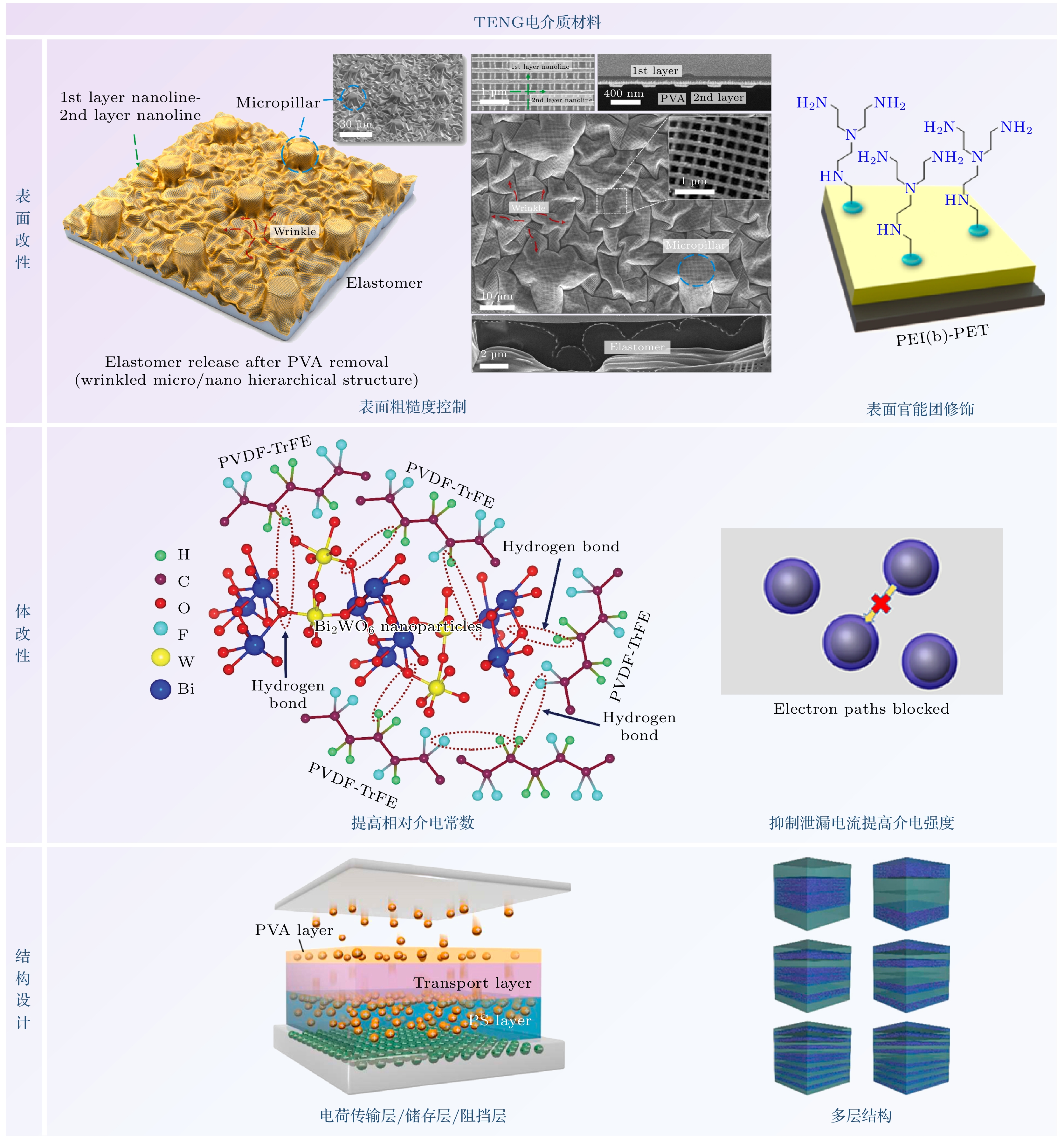 Triboelectric nanogenerator (TENG), as a micro-nano power source or self-powered sensor, has shown great prospects in various industries in recent years. The TENG output performance is closely related to the contact electrification characteristics of the triboelectric dielectric material. Herein, we first introduce the relevant fundamental theory and models of TENG and tribo-dielectrics. Then, we introduce the material selection, modification method (including surface modification and bulk modification) and structural design strategy of TENG dielectric material. Surface and bulk modification mainly involve surface roughness control, surface functional group regulation, and optimization of dielectric parameters. In terms of dielectric structural design, the principle of charge transport, trapping, and blocking layers as well as typical techniques to improve the dielectric properties of TENGs through multi-layer structures are highlighted. Finally, challenges and directions for future research are discussed, which is conducive to the fabricating of high-performance TENG dielectric materials.