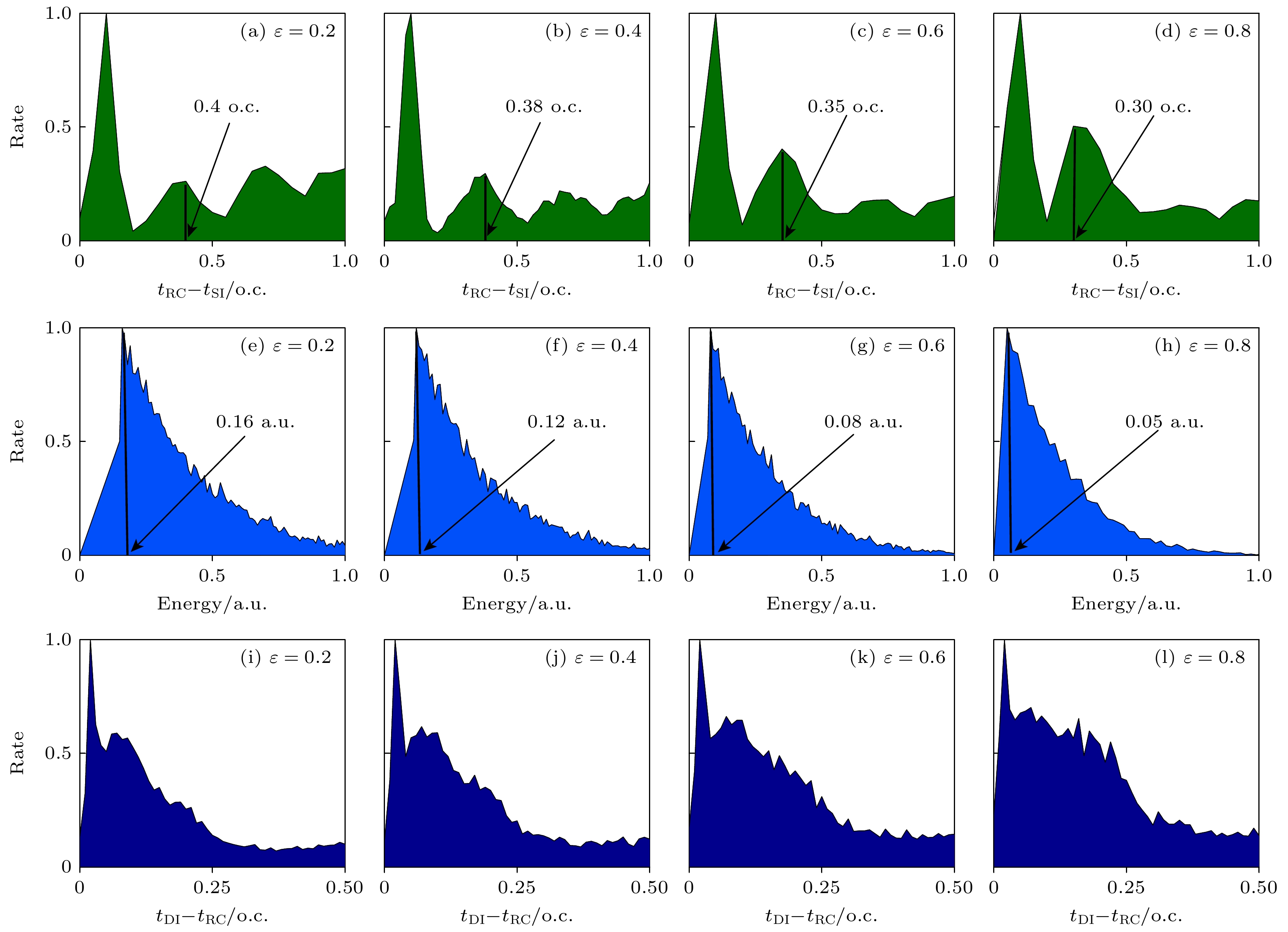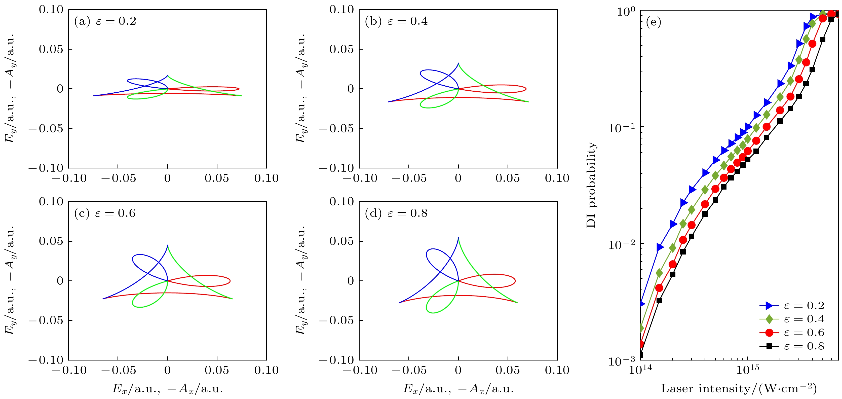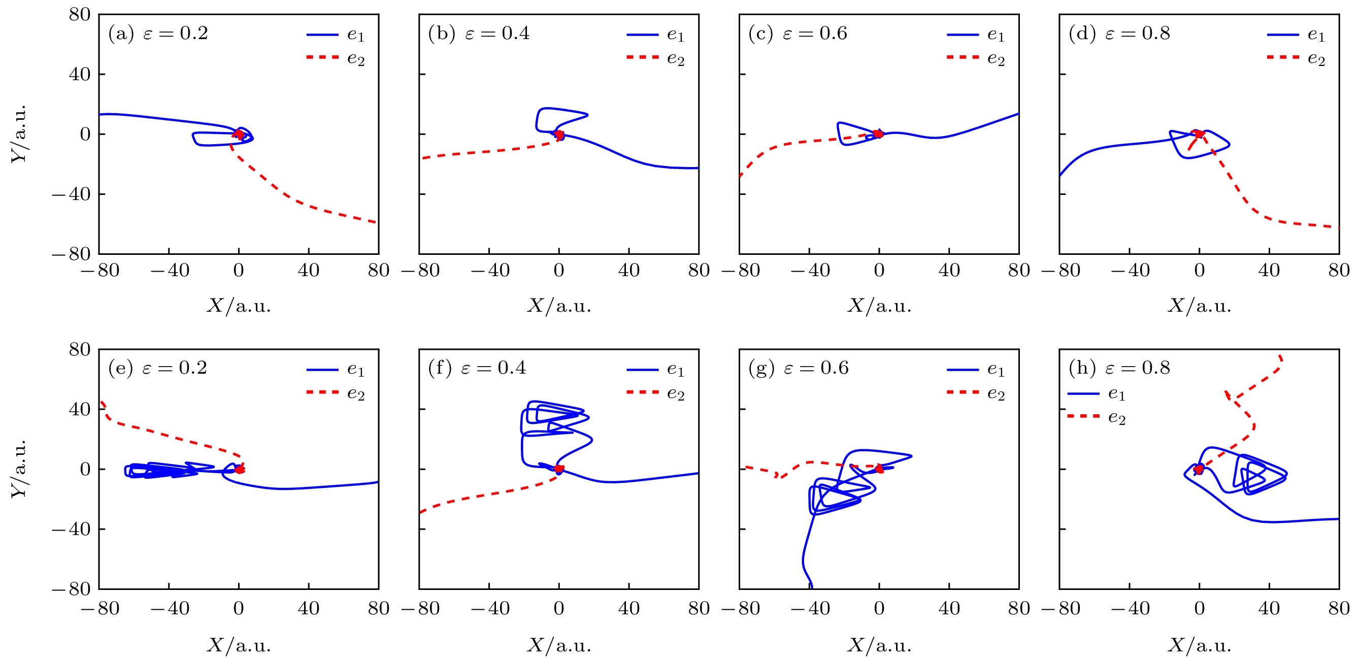 Electron correlation behaviors and recollision dynamics in nonsequential double ionization (NSDI) of Ar atoms in counter-rotating two-color elliptically polarized (TCEP) laser fields are investigated by using the classical ensemble model. The combined electric field in counter-rotating TCEP laser pulses traces out a trefoil pattern, i.e. the waveform in a period shows three leaves in different directions, and each leaf is called a lobe. Unlike counter-rotating two-color circularly polarized laser field, the combined electric field has no spatial symmetry. The amplitudes of the three field lobes and the angles between them are different. Thus, the returning electron mainly returns to the parent ion from one direction, and the electron momentum distributions show strong asymmetry. Numerical results show that the NSDI yield gradually decreases as the ellipticity increases, and the correlated behavior of the correlated electron momentum along the long axis of the laser polarization plane gradually evolves from correlation behavior mainly located in the first quadrant and the third quadrant to anti-correlation behavior mainly located in the second quadrant and fourth quadrant. In order to further understand the correlation behaviors of electron pairs, different characteristic times in the NSDI processes are discussed, respectively. It is found that single ionization events and recollision events gradually decrease, but single ionization time and recollision time change slightly. This may be the main reason for the decrease in NSDI yield. And as the ellipticity increases, the traveling time and the recollision energy gradually decrease, while the delay time increases. Therefore, we can conclude that ellipticity may be responsible for the NSDI process. In addition, further analysis finds that the shape of the trajectory becomes more and more triangular as the ellipticity increases due to the counter-rotating TCEP laser fields of the specific dynamical symmetries of the total net electric field. And it is found that whether it is a “short trajectory” or a “long trajectory”, more populations move to the second quadrant and the fourth quadrant as the ellipticity increases. The results show that increasing the ellipticity will gradually change the two electrons from emitting in the same direction to emitting in the opposite direction. This well demonstrates that both ellipticity and travelling time are responsible for the formation of the electron momentum distribution at the recollision time, meaning that both of them affect the emitted directions of both electrons.