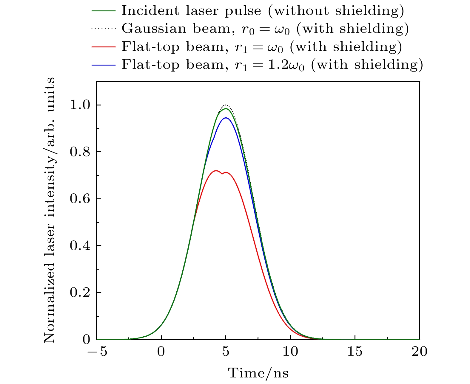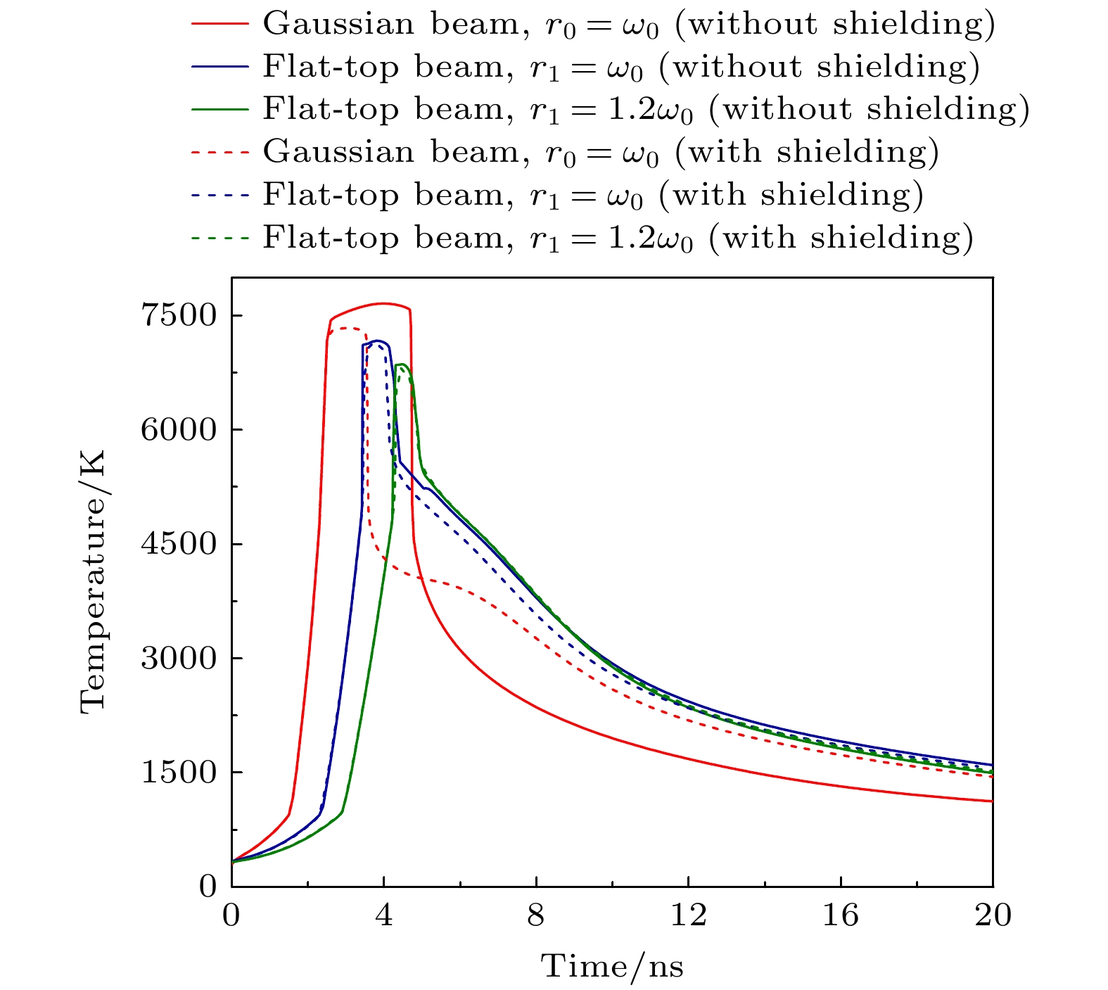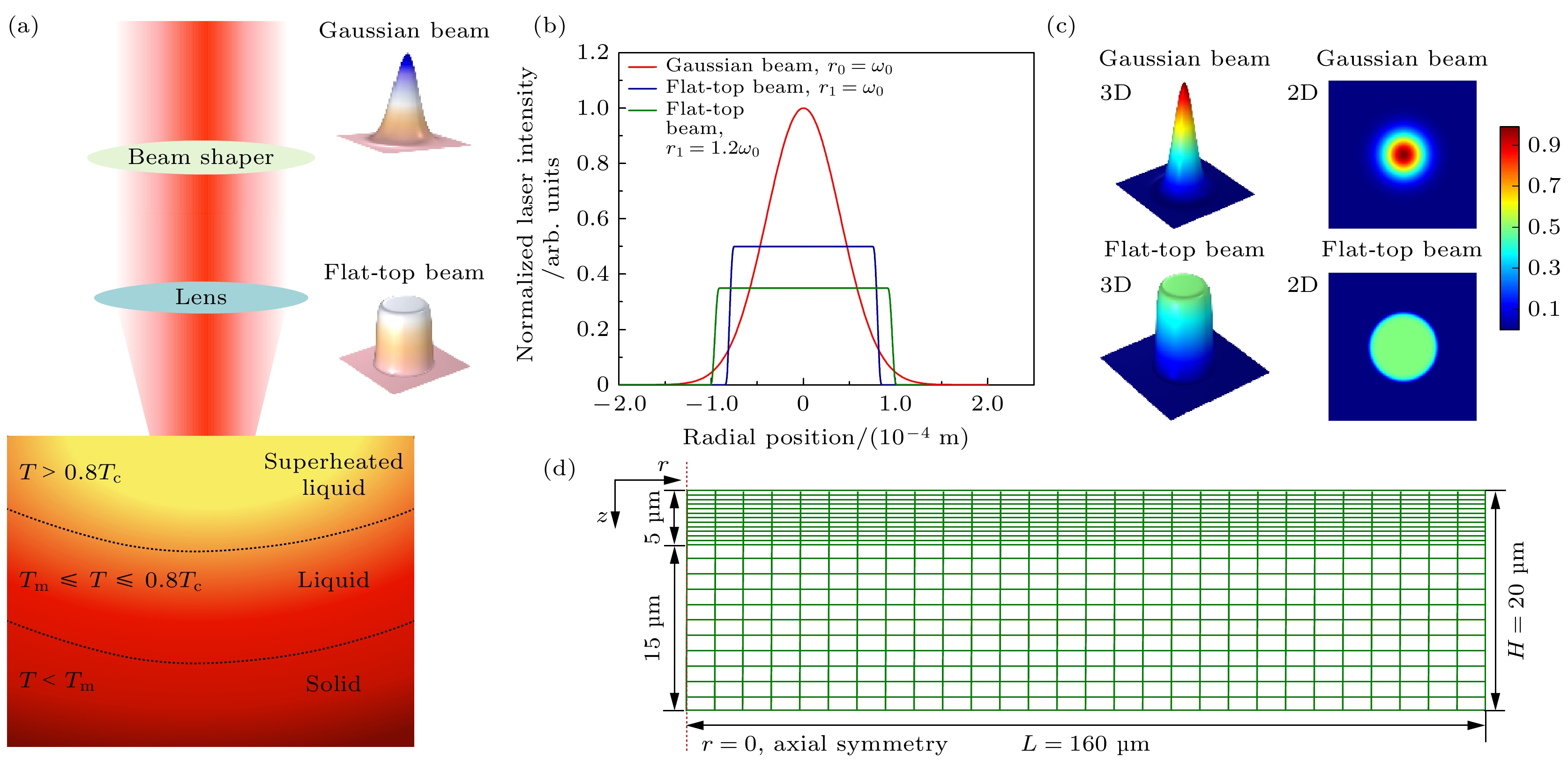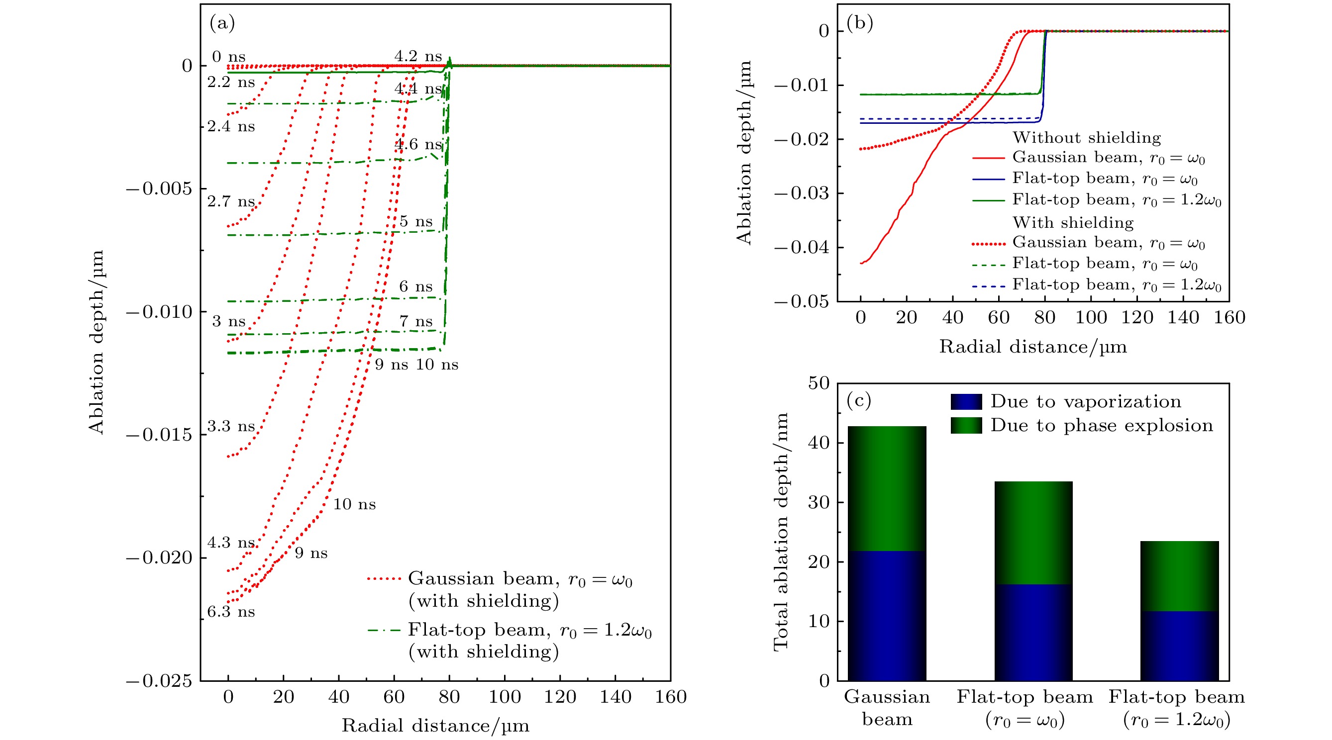 Based on the established two-dimensional asymmetric model of the interaction between a nanosecond pulse laser and metallic aluminum, the effect of beam shaping on the evaporation ablation dynamics during the ablation of metallic aluminum by a nanosecond pulse laser is simulated. The results show that plasma shielding, which has a significant influence on the ablation properties of the target, occurs mainly in the middle phase and late phase of the pulse. Among the three laser profiles, the Gaussian beam has the strongest shielding effect. As the diameter of the reshaped flat-top beam increases, the shielding effect gradually weakens. The two-dimensional spatial distribution of target temperature is relatively different between ablation by a Gaussian beam and that by a flat-top beam. For the Gaussian beam, the center of the target is first heated, and then the temperature spreads in radial direction and axial direction. For the flat-top beam, due to the uniform energy distribution, the target is heated within a certain radial range simultaneously. Beam shaping has a great influence on the evaporation ablation dynamics of the target. For the Gaussian beam, the center of the target is first ablated, followed by the radial ablation. For the flat-top beam, the evaporation time of the target surface is delayed due to the lower energy density after the beam has been shaped. In addition, the target evaporates simultaneously in a certain radial range due to the more uniform distribution of laser energy. For each of the three laser profiles, the evaporation morphology of the target resembles the intensity distribution of the laser beam. The crater produced by the Gaussian beam is deep in the center and shallow on both sides, while it becomes relatively flat by the flat-top beam.