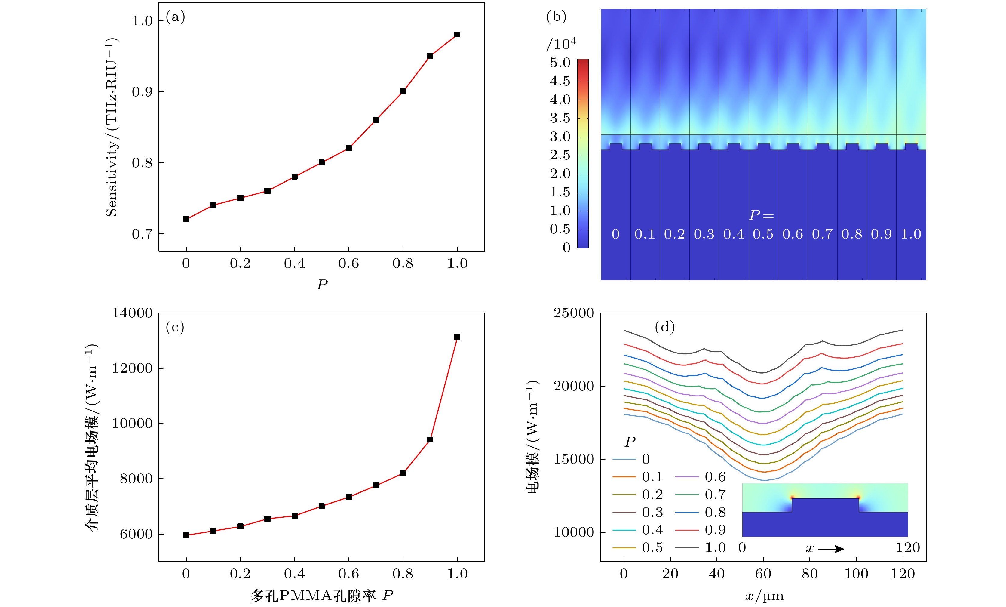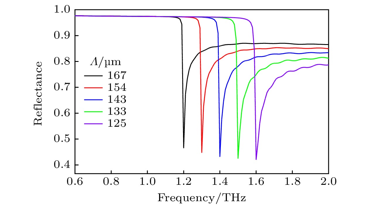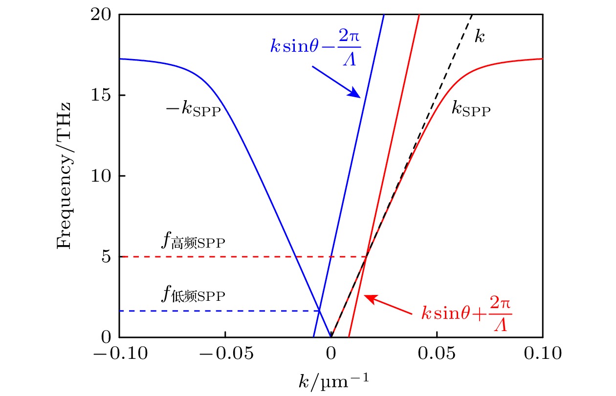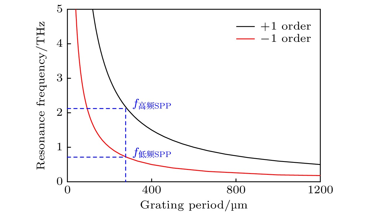 A grating-coupled terahertz (THz) surface plasmon polariton (SPP) resonant biochemical sensing structure is designed with simulation, which can be easily prepared by etching a submillimeter grating on the surface of indium antimonide (InSb) substrate. The simulation results based on the phase matching equation show that when the TM-polarized broadband terahertz collimated beam is incident on the InSb grating at a 30° angle, the low-frequency SPP and high-frequency SPP with opposite propagation directions can be simultaneously excited by the –1st and +1st order diffraction beams of the grating, respectively. Since the low-frequency SPP is easy to accurately measure with a commercial THz time-domain spectroscopy devices, the dependence of the resonance characteristics and sensing characteristics of low-frequency SPP on the grating structure parameters is systematically simulated in this paper. The simulation results show that the refractive-index sensitivity of the InSb grating-coupled THz-SPP resonant sensor chip decreases with the increase of the grating period, and is 1.05 THz/RIU at a grating period of 120 μm and an incident angle of 30°. Under these conditions, the sensor chip cannot make a detectable response to the monolayer adsorption of biomolecules, because the evanescent field penetration depth of the low-frequency SPP is much greater than the biomolecular size, resulting in insufficient field-biomolecular interaction at the surface. In order to detect biomolecules, a sensitivity enhancement method based on porous thin films is proposed and analyzed with simulation. The porous films enable not only to enrich biomolecules, but also to extend the interaction between THz-SPP and biomolecules from the molecular size to the entire film thickness, thereby improving the sensitivity of the sensor to biomolecular adsorption. Taking tyrosine adsorption as an example, the simulation results show that when the InSb grating is covered with a porous polymethyl methacrylate (PMMA) film with a thickness of 120 μm and a porosity of 0.4, the sensor sensitivity to tyrosine adsorption is 0.39 THz/unit volume fraction.