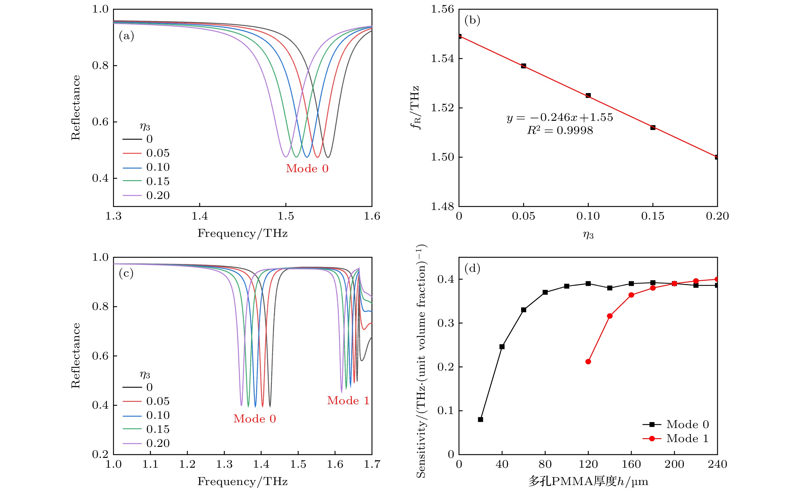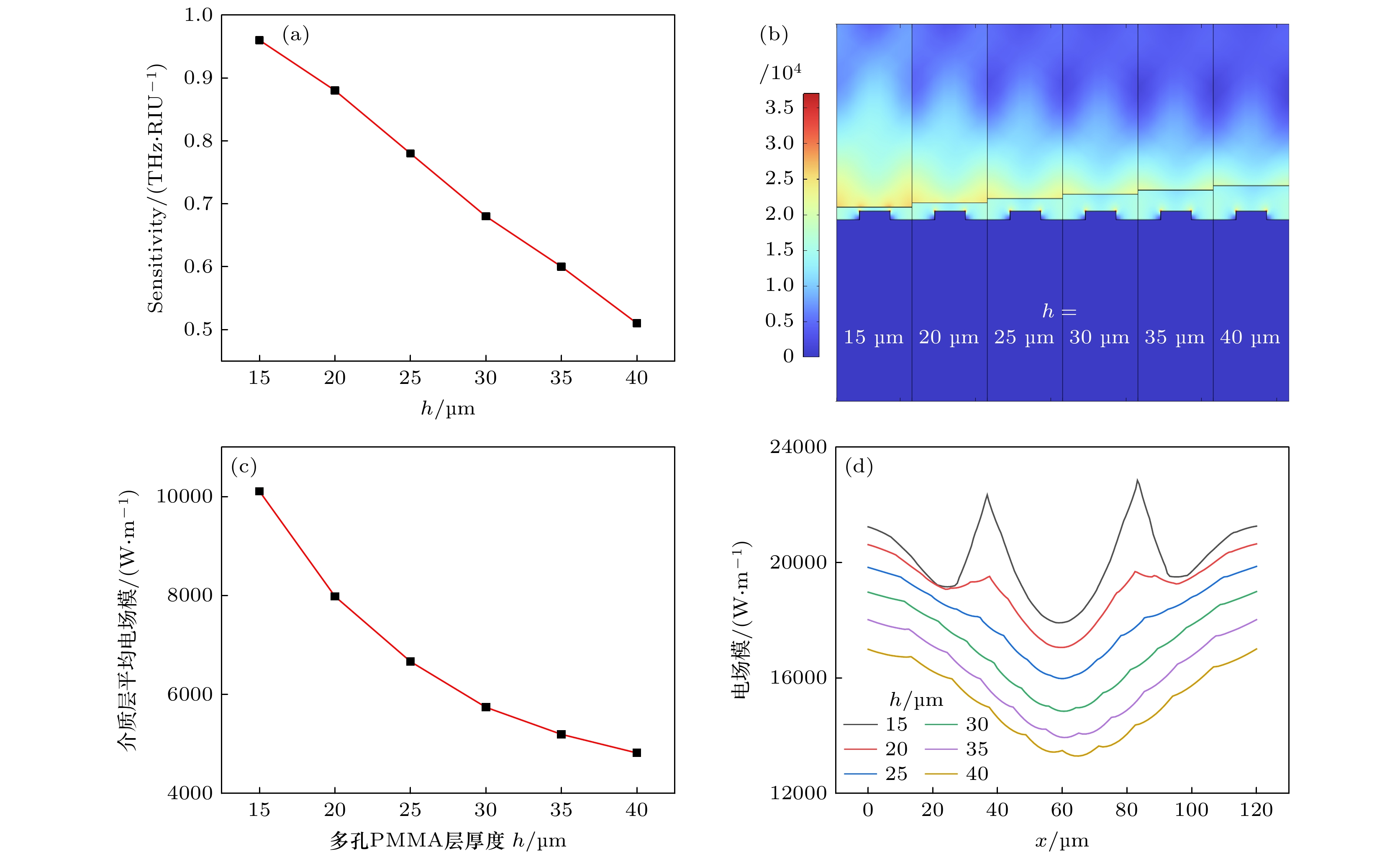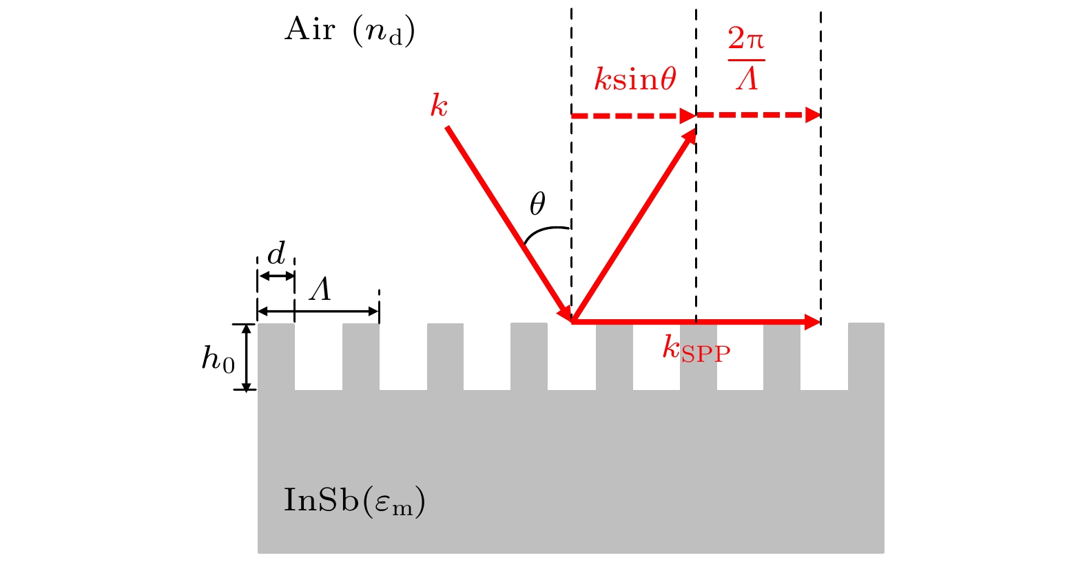A grating-coupled terahertz (THz) surface plasmon polariton (SPP) resonant biochemical sensing structure is designed with simulation, which can be easily prepared by etching a submillimeter grating on the surface of indium antimonide (InSb) substrate. The simulation results based on the phase matching equation show that when the TM-polarized broadband terahertz collimated beam is incident on the InSb grating at a 30° angle, the low-frequency SPP and high-frequency SPP with opposite propagation directions can be simultaneously excited by the –1st and +1st order diffraction beams of the grating, respectively. Since the low-frequency SPP is easy to accurately measure with a commercial THz time-domain spectroscopy devices, the dependence of the resonance characteristics and sensing characteristics of low-frequency SPP on the grating structure parameters is systematically simulated in this paper. The simulation results show that the refractive-index sensitivity of the InSb grating-coupled THz-SPP resonant sensor chip decreases with the increase of the grating period, and is 1.05 THz/RIU at a grating period of 120 μm and an incident angle of 30°. Under these conditions, the sensor chip cannot make a detectable response to the monolayer adsorption of biomolecules, because the evanescent field penetration depth of the low-frequency SPP is much greater than the biomolecular size, resulting in insufficient field-biomolecular interaction at the surface. In order to detect biomolecules, a sensitivity enhancement method based on porous thin films is proposed and analyzed with simulation. The porous films enable not only to enrich biomolecules, but also to extend the interaction between THz-SPP and biomolecules from the molecular size to the entire film thickness, thereby improving the sensitivity of the sensor to biomolecular adsorption. Taking tyrosine adsorption as an example, the simulation results show that when the InSb grating is covered with a porous polymethyl methacrylate (PMMA) film with a thickness of 120 μm and a porosity of 0.4, the sensor sensitivity to tyrosine adsorption is 0.39 THz/unit volume fraction.