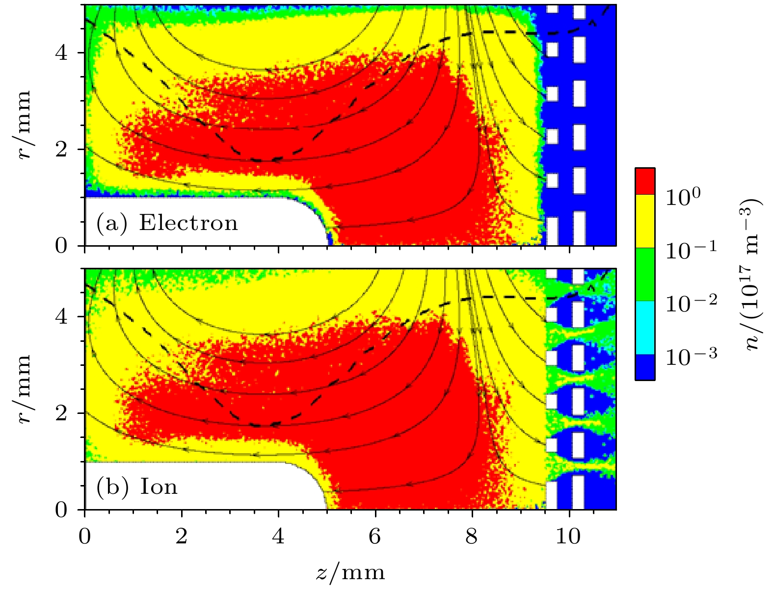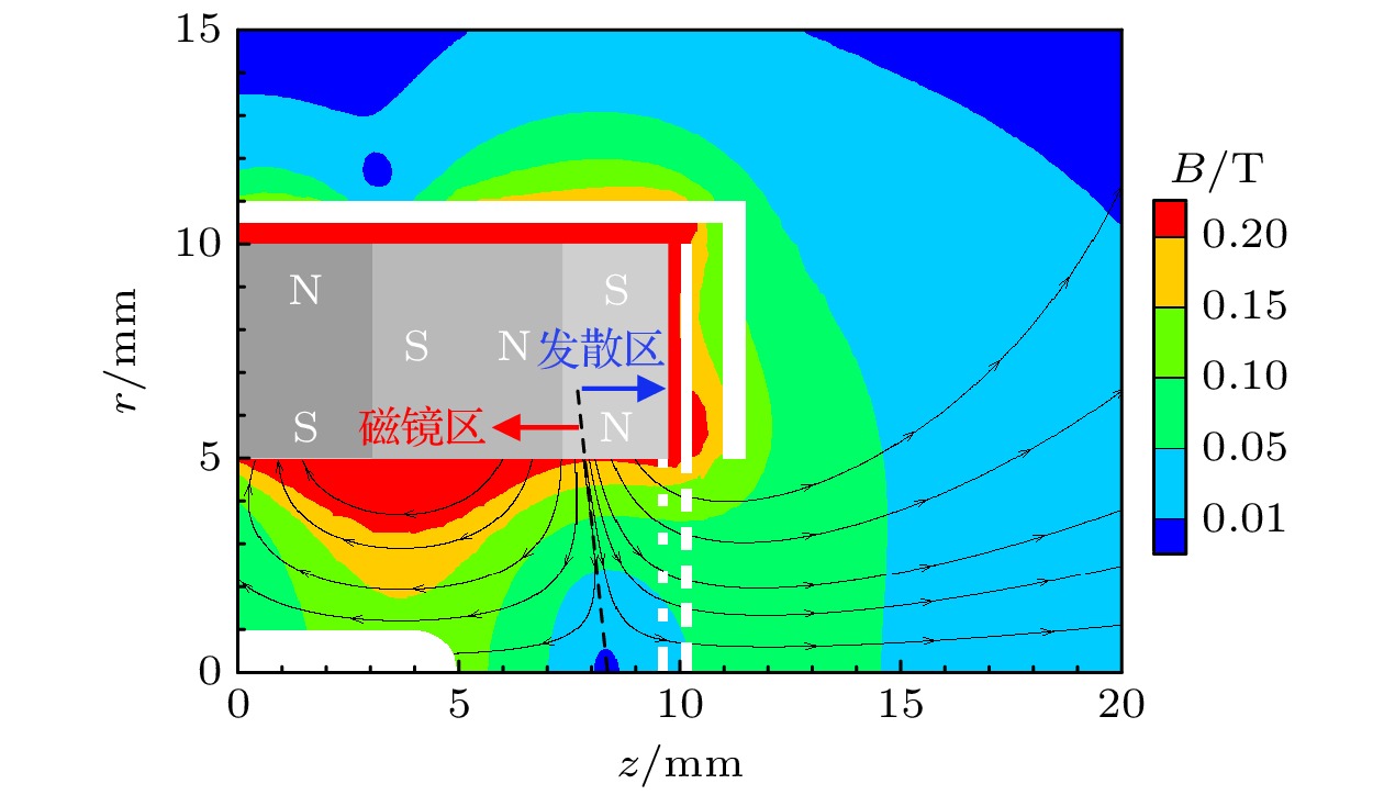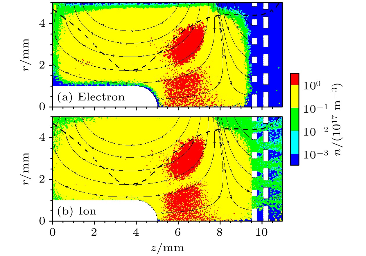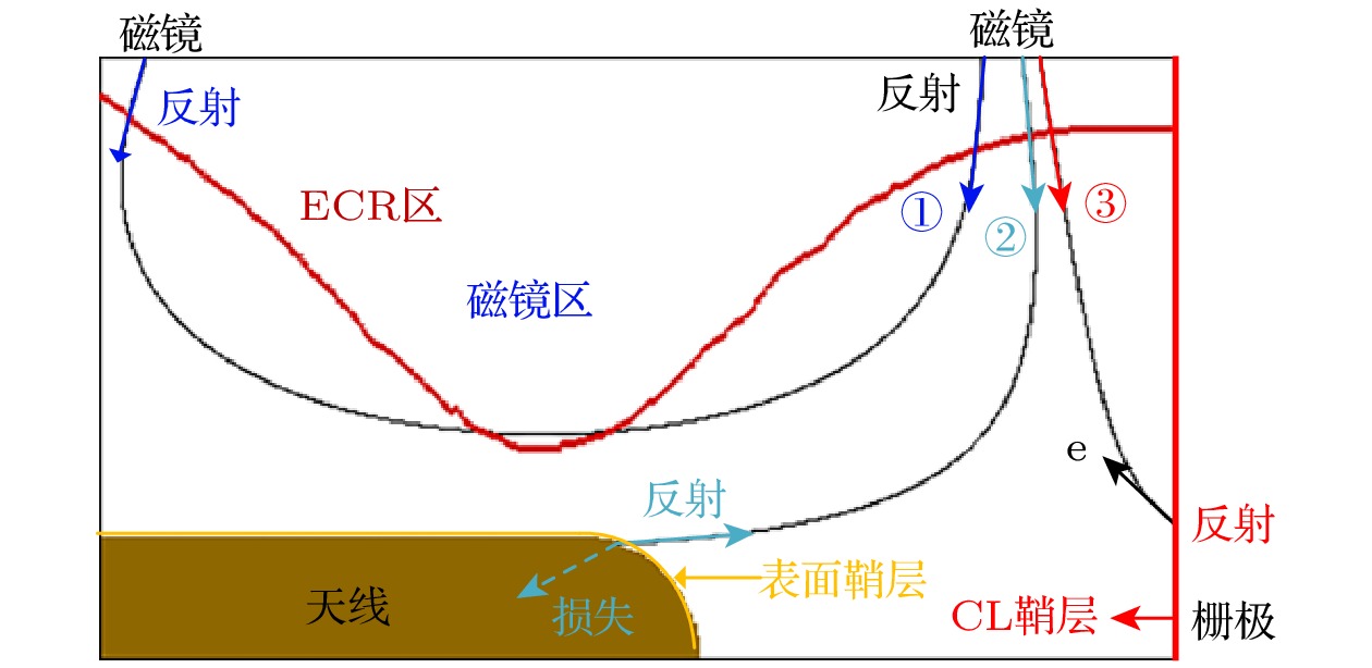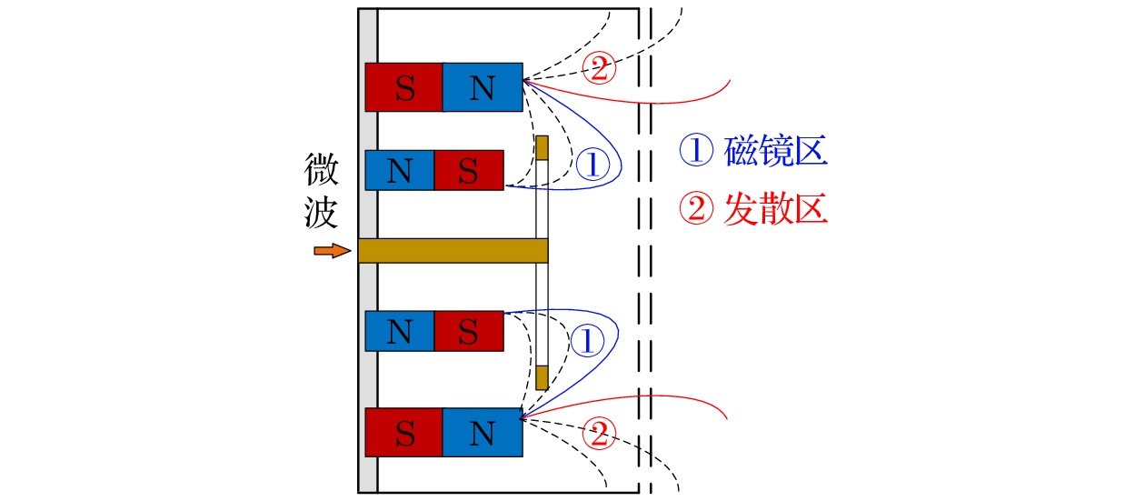 In magnetic field design principle of microwave discharge ion thruster, it is universally received that enlarging the magnetic mirror region can confine more electrons to acquire better energy utilization rate, while reducing the magnetic field diffusion region can prevent electrons from losing at wall to reduce the discharge loss. However, recently the integrated simulation proposes a hypothesis that electrons can also be heated in the magnetic field diffusion region when the Child-Langmuir sheath is considered as a constraint condition for electrons. Therefore, herein a magnetic field structure for the magnet array microwave discharge ion thruster is designed to verify the hypothesis, in which the magnetic field diffusion region is located near the screen grid. Then, an integrated simulation is conducted for studying the initial discharge and ion beam extraction stages of the thruster. The simulation results show that in the magnetic field diffusion region, the electron temperature is 4–8 eV when the grid system voltage is not applied, while the electron temperature is 4–12 eV when the the grid system voltage is applied. And the plasma density in the latter case has one order of magnitude higher than that in the former case. It means that electrons are obviously heated in the magnetic field diffusion region when they are confined among the Child-Langmuir sheath, the plasma sheath at antenna surface, and magnetic mirror. This electron heating mode produces more high-energy electrons outside the magnetic mirror region to generate plasma in front of the grid system, which can significantly increase the plasma density and ion beam current density. The result shows that under the conditions of 0.3 sccm (1 sccm = 1 mL/min) xenon gas flow, 1 W input microwave power, 300 V screen grid voltage and –50 V acceleration grid voltage, the ion beam current and its density are 0.47 mA and 0.60 mA/cm2for the magnet array microwave discharge ion thruster, while the ion beam current and its density are 1.2 mA and 0.38 mA/cm2for the 2-cm microwave discharge ion thruster. The ion beam current density increases by 57.9%. Through the integrated simulation, a new electron heating mode in the magnetic field diffusion region is proved theoretically, which provides a theoretical basis for the magnetic field structure optimization of microwave discharge ion thruster.