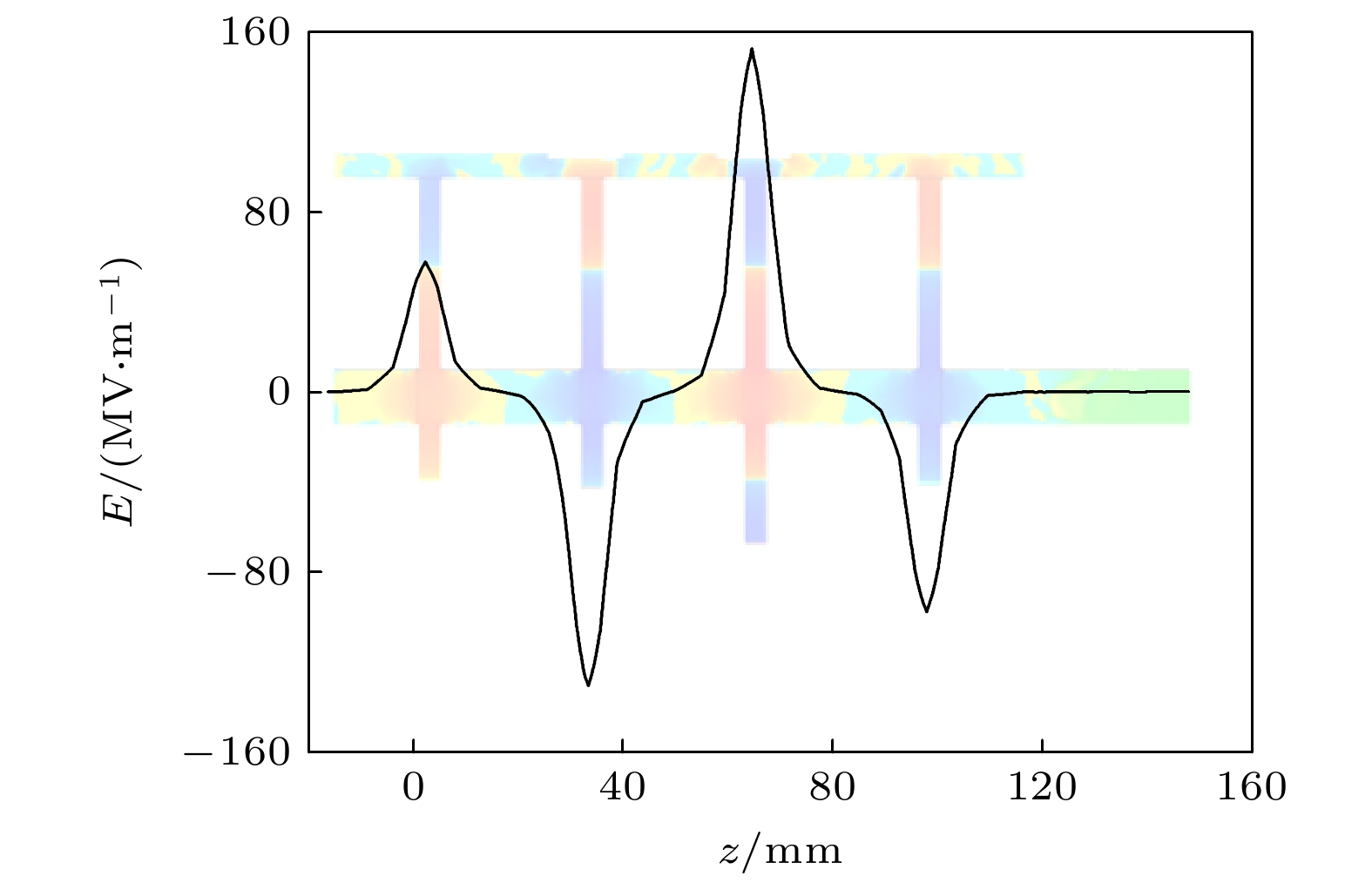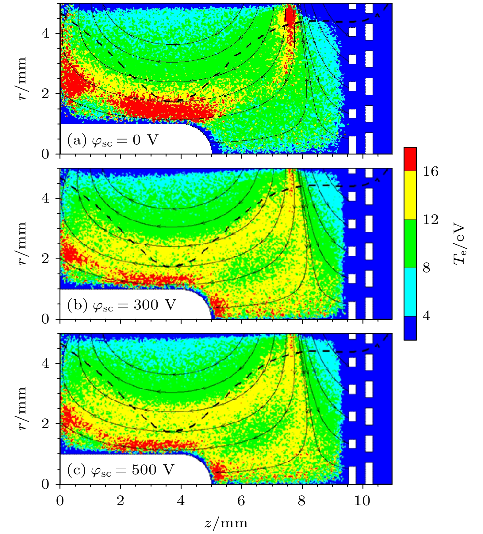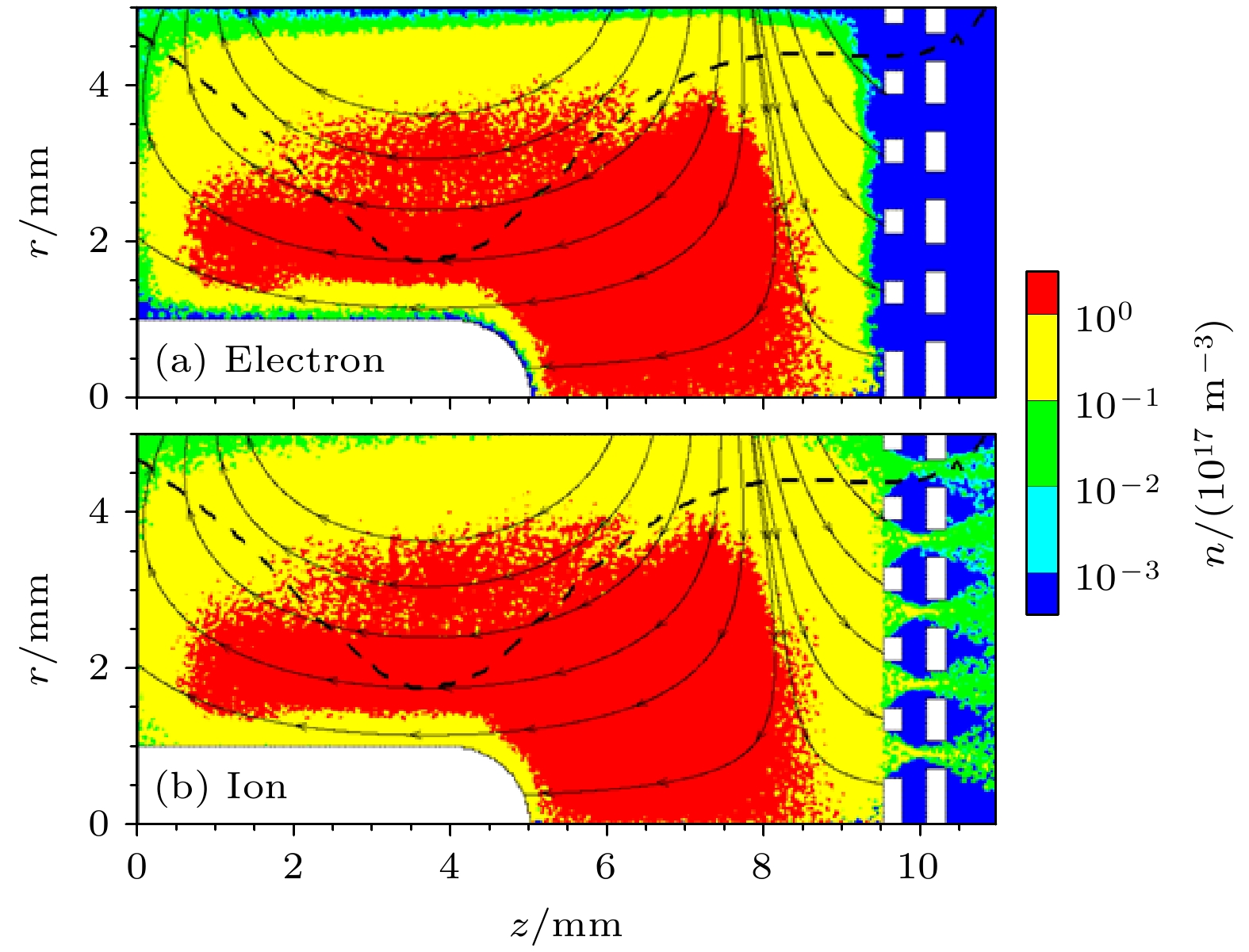 In magnetic field design principle of microwave discharge ion thruster, it is universally received that enlarging the magnetic mirror region can confine more electrons to acquire better energy utilization rate, while reducing the magnetic field diffusion region can prevent electrons from losing at wall to reduce the discharge loss. However, recently the integrated simulation proposes a hypothesis that electrons can also be heated in the magnetic field diffusion region when the Child-Langmuir sheath is considered as a constraint condition for electrons. Therefore, herein a magnetic field structure for the magnet array microwave discharge ion thruster is designed to verify the hypothesis, in which the magnetic field diffusion region is located near the screen grid. Then, an integrated simulation is conducted for studying the initial discharge and ion beam extraction stages of the thruster. The simulation results show that in the magnetic field diffusion region, the electron temperature is 4–8 eV when the grid system voltage is not applied, while the electron temperature is 4–12 eV when the the grid system voltage is applied. And the plasma density in the latter case has one order of magnitude higher than that in the former case. It means that electrons are obviously heated in the magnetic field diffusion region when they are confined among the Child-Langmuir sheath, the plasma sheath at antenna surface, and magnetic mirror. This electron heating mode produces more high-energy electrons outside the magnetic mirror region to generate plasma in front of the grid system, which can significantly increase the plasma density and ion beam current density. The result shows that under the conditions of 0.3 sccm (1 sccm = 1 mL/min) xenon gas flow, 1 W input microwave power, 300 V screen grid voltage and –50 V acceleration grid voltage, the ion beam current and its density are 0.47 mA and 0.60 mA/cm2for the magnet array microwave discharge ion thruster, while the ion beam current and its density are 1.2 mA and 0.38 mA/cm2for the 2-cm microwave discharge ion thruster. The ion beam current density increases by 57.9%. Through the integrated simulation, a new electron heating mode in the magnetic field diffusion region is proved theoretically, which provides a theoretical basis for the magnetic field structure optimization of microwave discharge ion thruster.