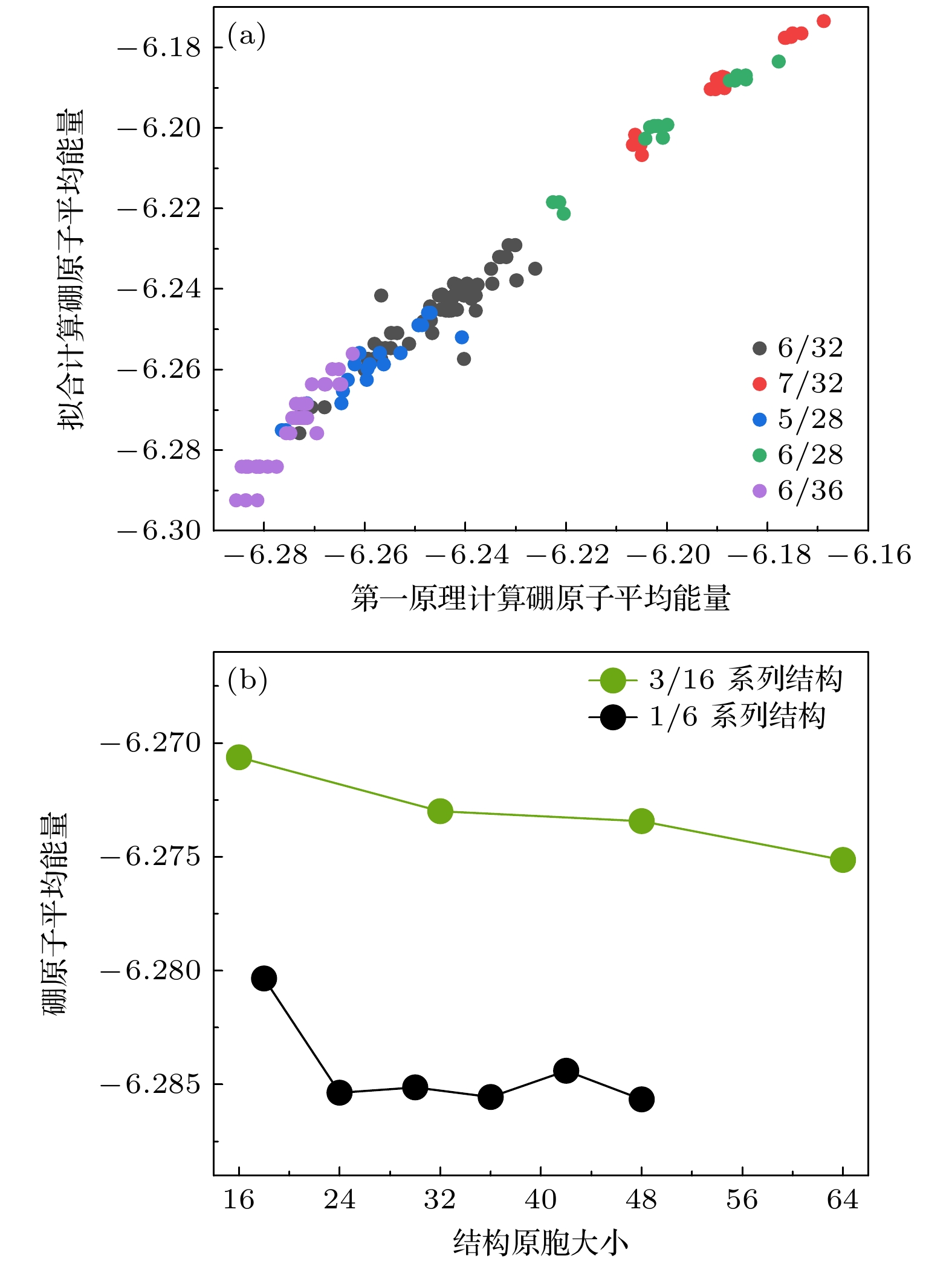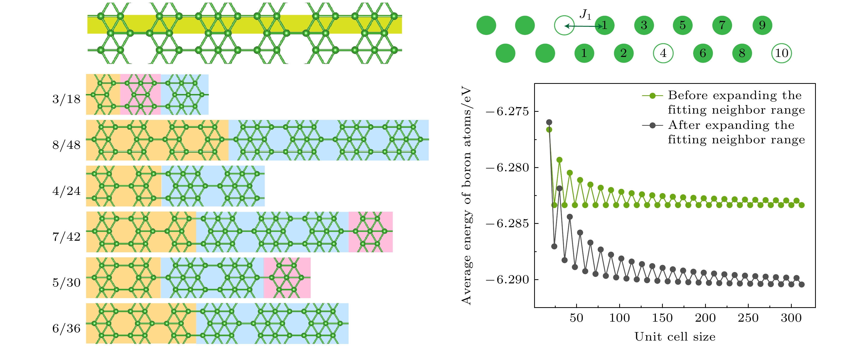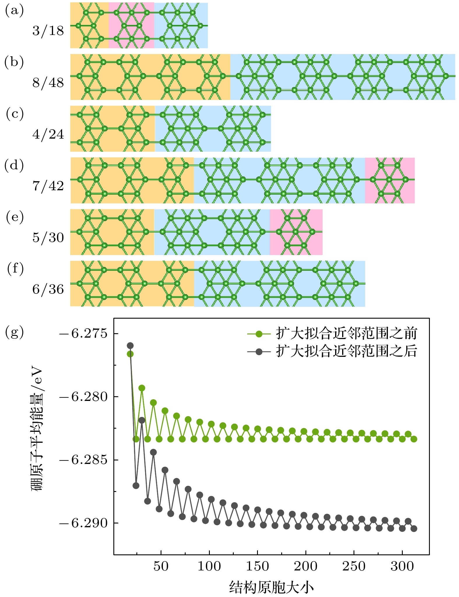 Interestingly, under the same vacancy concentration, stable boron structures with different cell sizes exhibit distinct vacancy distributions, indicating a trend of long-period distribution for ground state structures. To address this phenomenon, when the stable candidate structures from the 1/6 series are dominant in number within the computable range and the changes in neighbor statistics can be clearly seen, we select the structures from this concentration series for detailed calculations.