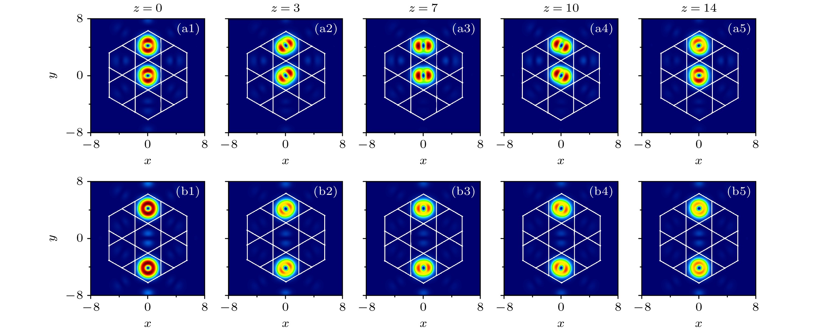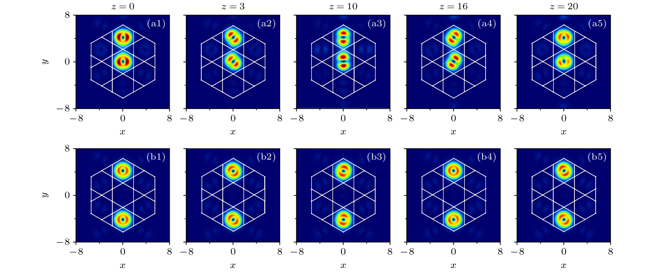 index, the longer the stable transmission distance and the lower the power of the bandgap vortex soliton. When multiple vortex solitons transmit in the lattice, the interaction between them is influenced by the lattice position and phase. Two vortex solitons that are in phase and located at adjacent lattices, are superimposed with sidelobe energy, while two vortex solitonsthat are out of phase are cancelled with sidelobe energy. These vortex solitons will gradually lose ring structure and evolve into dipole modes in the transmission process. And they are periodic rotation under the azimuth angle modulating. When two vortex solitons located at non-adjacent lattice, vortex solitons can maintain a ring-shaped structure due to the small influence of sidelobes. When three gap vortex solitons are located at non-adjacent lattices, the solitons can also maintain their ring-like structures. However, when there are more than three gap vortex solitons, the intensity distribution of vortex solitons are uneven due to the sidelobe energy superimposed. These vortex solitons will form dipole modes and rotate under the azimuthal angle modulating in the transmission process. These results can offer theoretical guidance for transmitting and controlling the gap vortex solitons in the lattice.