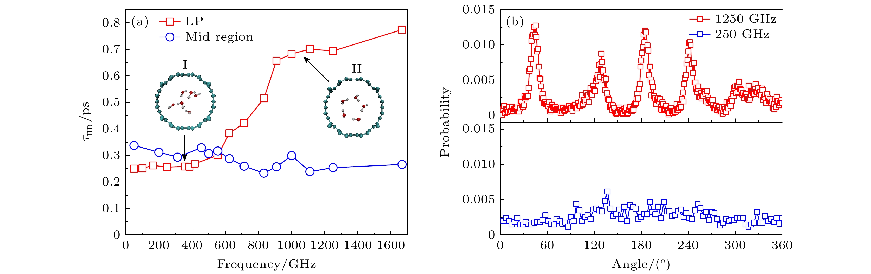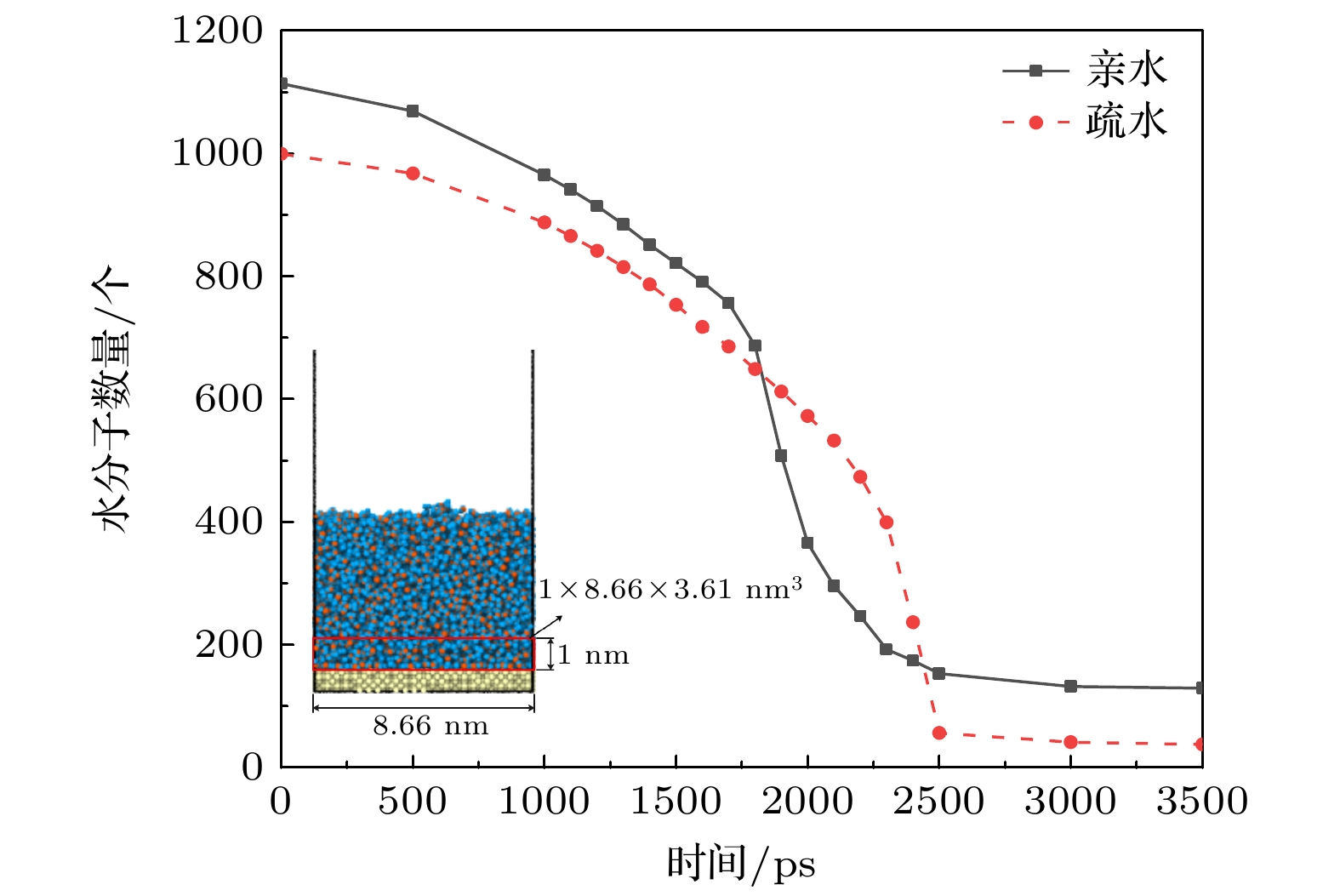 In the narrow orifice of a cone-shaped channel, blockage can occur for granular matter. However, water molecules can enter into and even permeate through carbon nanotubes of diameters down to 0.8 nm at ultrafast rates. Here we demonstrate by molecular dynamics simulations that clogging can also emerge unexpectedly in the water flowing through a nanoscale valve-less pump. The designed pump features two truncated carbon nanocones, with the narrowest region having a diameter of 1.2 nm (larger than that of (6, 6) carbon nanotube), linked to a fluid cavity volume, and is powered by the vibration of a graphene sheet. In the low frequency range, water molecules can be driven through the nanocones effectively by the vibration of the graphene sheet. The maximum flux reaches 83 ns–1, which is approximately 20 times the measured value of (3.9 ± 0.6) ns–1for aquaporin-1. However, at higher frequencies, water molecules suffer blockage at the narrow exits. Much unlike granular matter, high-frequency vibration cannot restore water flow. The key to this phenomenon is that in the narrow exits of two nanocones acting as diffuser/nozzle, the number density of water molecules rapidly increases with frequency increasing, the tight hydrogen-bonding network is formed, and the mean lifetime of hydrogen bonds increases dramatically under high-frequency vibrations. High frequency fluctuations in the middle chamber make H-bond network between water molecules in the narrow exits more stable. The probability density distribution of water exhibits a non-equilibrium transition from a disordered state to ordered state. This work reveals a new mechanism of water flowing/blocking in a nanoscale valve-less pump based on two asymmetrical nanocones, offers valuable insights into understanding nonequilibrium jamming transition in nanoscale fluid.