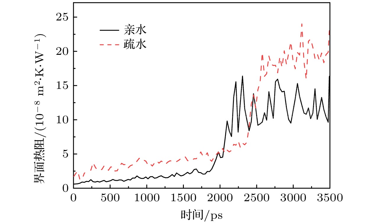 How surface wettability affects boiling heat transfer of thin liquid film on a nanoscale remains a challenging research topic. In this work, the effects of wettability on the nanoscale boiling heat transfer for a thin liquid film on hydrophilic surface and hydrophobic surface are investigated by molecular dynamics simulation. Results demonstrate that the hydrophilic surface has better heat transfer performance than the hydrophobic surface. It has a shorter boiling onset time, higher temperature, heat flux, interfacial thermal conductance, and weakened interfacial thermal resistance. The hydrophilic surface throughout has higher critical heat flux than the hydrophobic surface in both macro-system and nanoscale system. Besides, a two-dimensional surface potential energy is proposed to reveal the mechanism of wettability affecting the boiling heat transfer. The absolute value of potential energy in one regular unit of hydrophilicity (–0.34 eV) is much higher than that of hydrophobicity (–0.09 eV). That is the crucial reason why the heat transfer enhancement via improving surface wettability should be primarily the powerful surface potential energy. In addition, the interaction energy is calculated to further address the nucleation mechanism and heat transfer performance for liquid film on different wettability surfaces. The interaction energy values are ordered asIphi(1.57 eV/nm2) >Iwater(0.48 eV/nm2) >Ipho(0.26 eV/nm2), indicating that the better heat transfer performance of hydrophilic surface is because of the large interaction energy at the solid/liquid interface. Besides, the bubble nucleation on a hydrophilic surface needs absorbing more energy and occurs inside the thin liquid film, while it needs absorbing less energy and triggering off at the solid/liquid interface with hydrophobicity. Those uncover the principal mechanisms of how wettability influences the bubble nucleation and boiling heat transfer performance on a nanoscale.