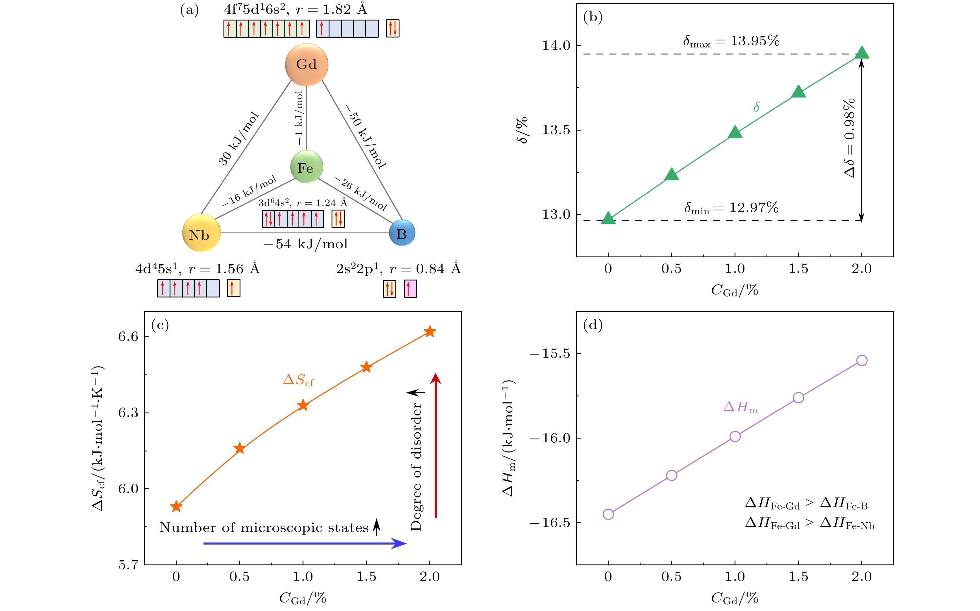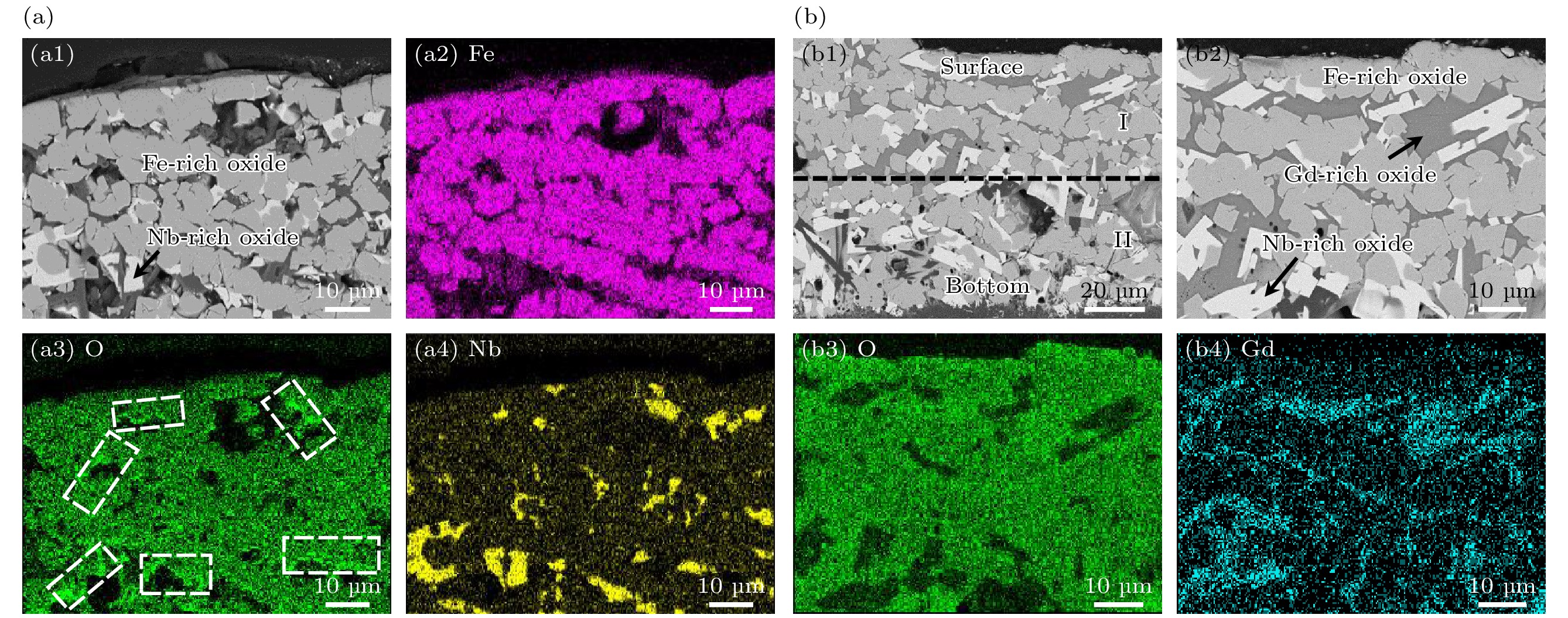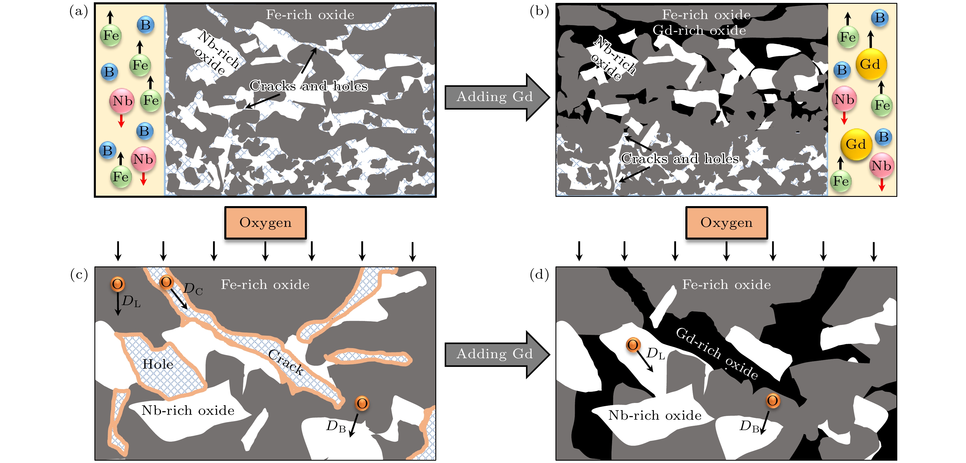 In this work, we use the rapid solidification technique to prepare five kinds of metallic glasses with different Gd content, and investigate in depth the influences of Gd content on the amorphous formation capability, thermal stability, and magnetic properties of (Fe73B22Nb5)100–xGdx(x= 0, 0.5, 1.0, 1.5, 2.0) alloys. By comparing the microstructural morphology and solute distribution of oxidation products before adding Gd and those after adding Gd, the amorphous oxidation mechanism is analyzed systematically. With the addition of Gd, the atomic size difference of the alloys exceeds 13%, and the configuration entropy increases from 7.27 kJ/(mol·K) to 9.44 kJ/(mol·K). The glass-forming ability of the alloy is significantly improved. The increase of Gd content can increase the glass transition temperature of the alloy to 864 K, and the undercooled liquid region can reach 73 K, significantly enhancing the thermal stability of the metallic glasses. The Gd limits the local anisotropy of the alloy and reduces the density of quasi-dislocation dipole defects. This can effectively reduce the pinning sites that hinder the rotation of magnetic domain walls, thereby improving the soft magnetic property. By comparing with the metallic glasses without Gd, only 2% (atomic percentage) Gd can reduce the coercivity by 8%. Moreover, the Gd makes the metallic glasses more sensitive to temperature variation in the oxidation process, and the temperature of the maximum oxidation rate is reduced by 15 K. However, their antioxidant performance does not deteriorate. The Gd atoms are influenced by binding energy and migrate to the surface, forming Gd-rich oxides. They fill surface defects and occupy a large part of the top space, leading to the structure becoming more compact near the surface. This structure reduces the channels for oxygen atoms to diffuse through the microstructure interface, which helps to improve antioxidant capability. This work provides a new approach for designing high performance Fe-based metallic glasses.