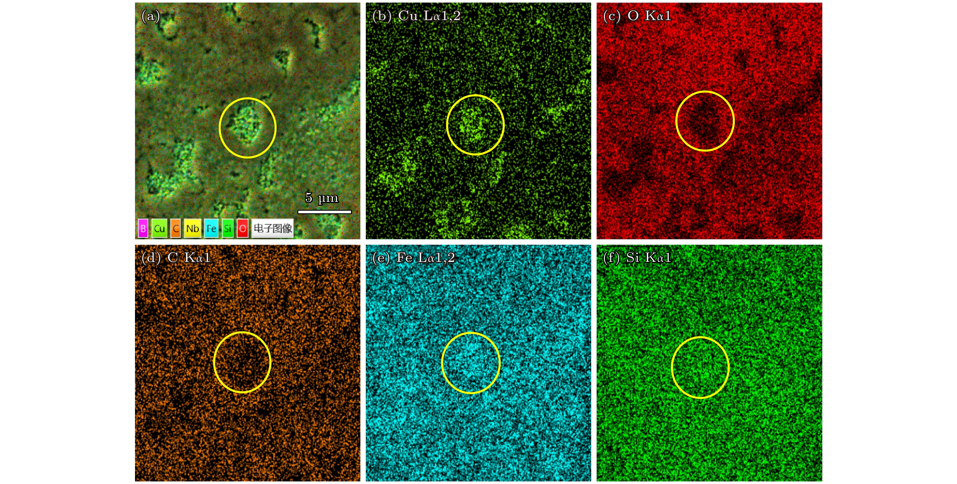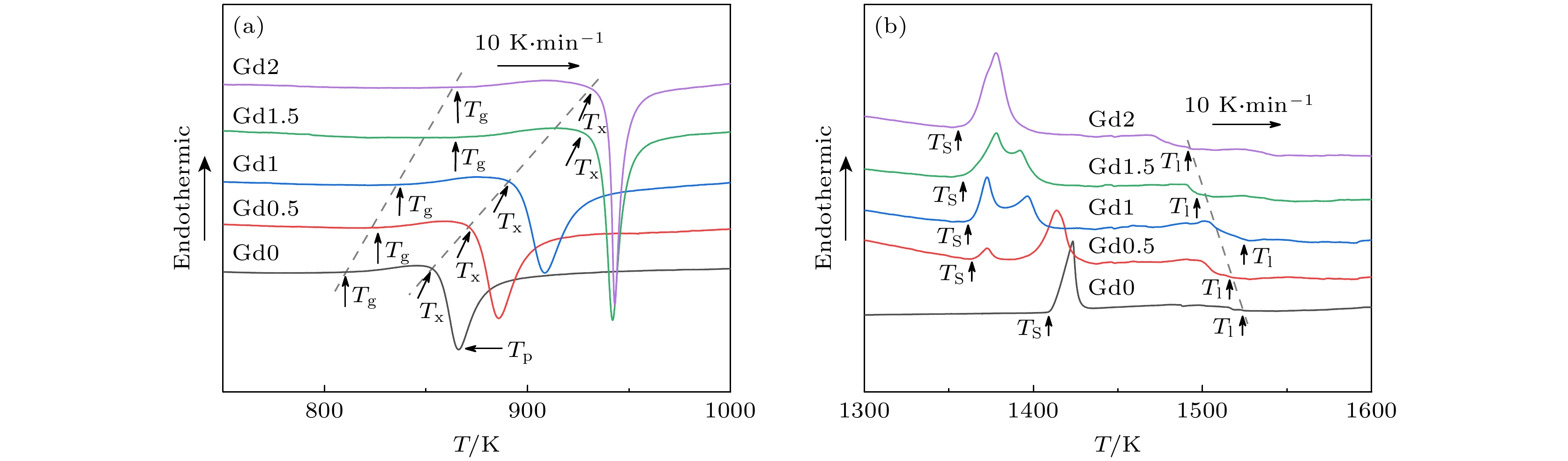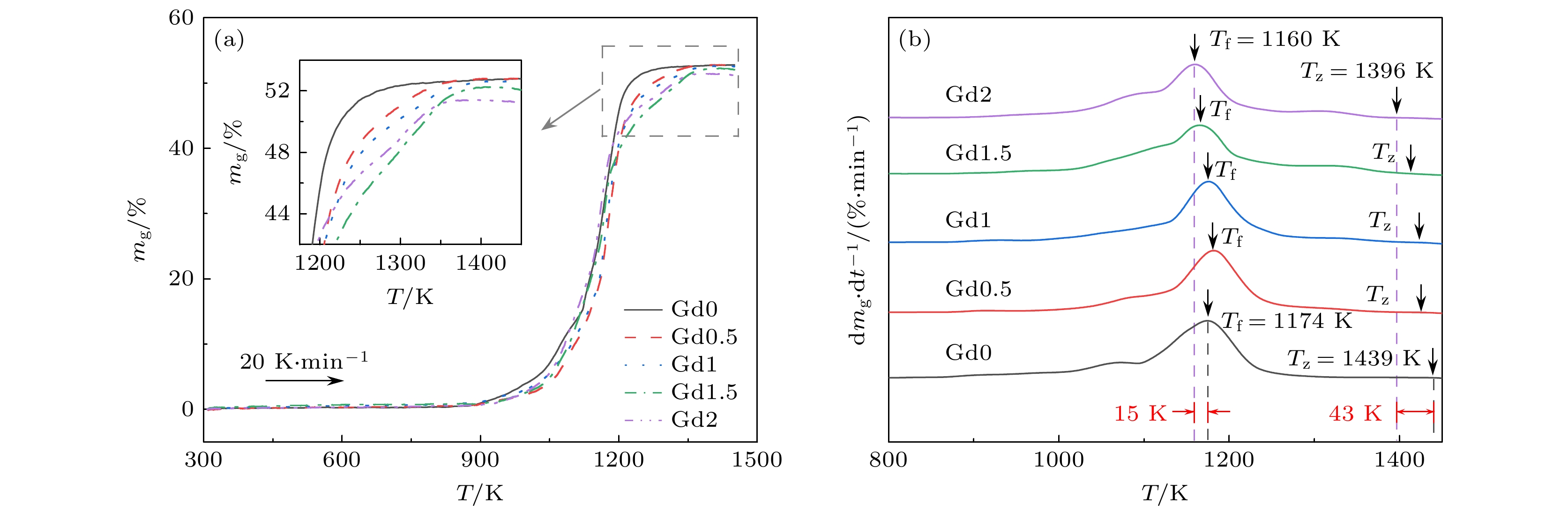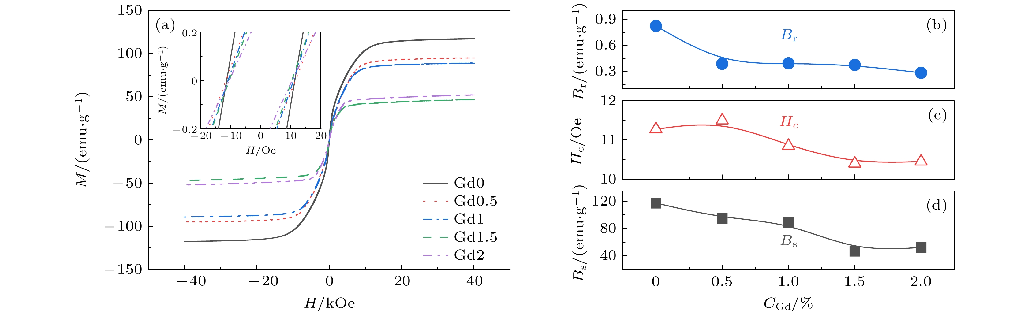 In this work, we use the rapid solidification technique to prepare five kinds of metallic glasses with different Gd content, and investigate in depth the influences of Gd content on the amorphous formation capability, thermal stability, and magnetic properties of (Fe73B22Nb5)100–xGdx(x= 0, 0.5, 1.0, 1.5, 2.0) alloys. By comparing the microstructural morphology and solute distribution of oxidation products before adding Gd and those after adding Gd, the amorphous oxidation mechanism is analyzed systematically. With the addition of Gd, the atomic size difference of the alloys exceeds 13%, and the configuration entropy increases from 7.27 kJ/(mol·K) to 9.44 kJ/(mol·K). The glass-forming ability of the alloy is significantly improved. The increase of Gd content can increase the glass transition temperature of the alloy to 864 K, and the undercooled liquid region can reach 73 K, significantly enhancing the thermal stability of the metallic glasses. The Gd limits the local anisotropy of the alloy and reduces the density of quasi-dislocation dipole defects. This can effectively reduce the pinning sites that hinder the rotation of magnetic domain walls, thereby improving the soft magnetic property. By comparing with the metallic glasses without Gd, only 2% (atomic percentage) Gd can reduce the coercivity by 8%. Moreover, the Gd makes the metallic glasses more sensitive to temperature variation in the oxidation process, and the temperature of the maximum oxidation rate is reduced by 15 K. However, their antioxidant performance does not deteriorate. The Gd atoms are influenced by binding energy and migrate to the surface, forming Gd-rich oxides. They fill surface defects and occupy a large part of the top space, leading to the structure becoming more compact near the surface. This structure reduces the channels for oxygen atoms to diffuse through the microstructure interface, which helps to improve antioxidant capability. This work provides a new approach for designing high performance Fe-based metallic glasses.