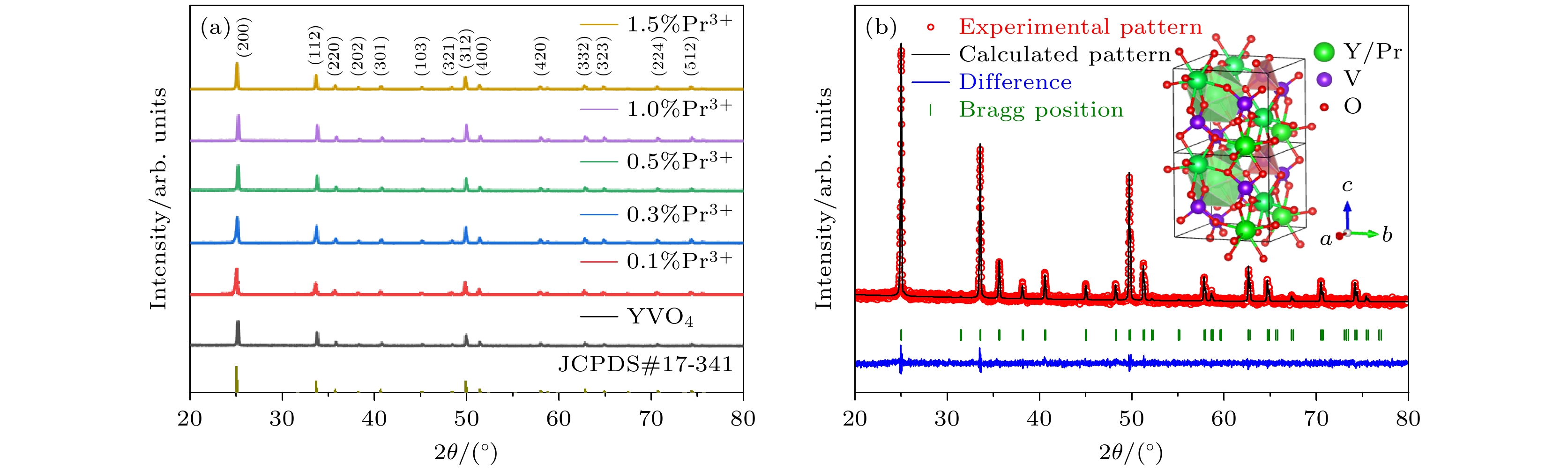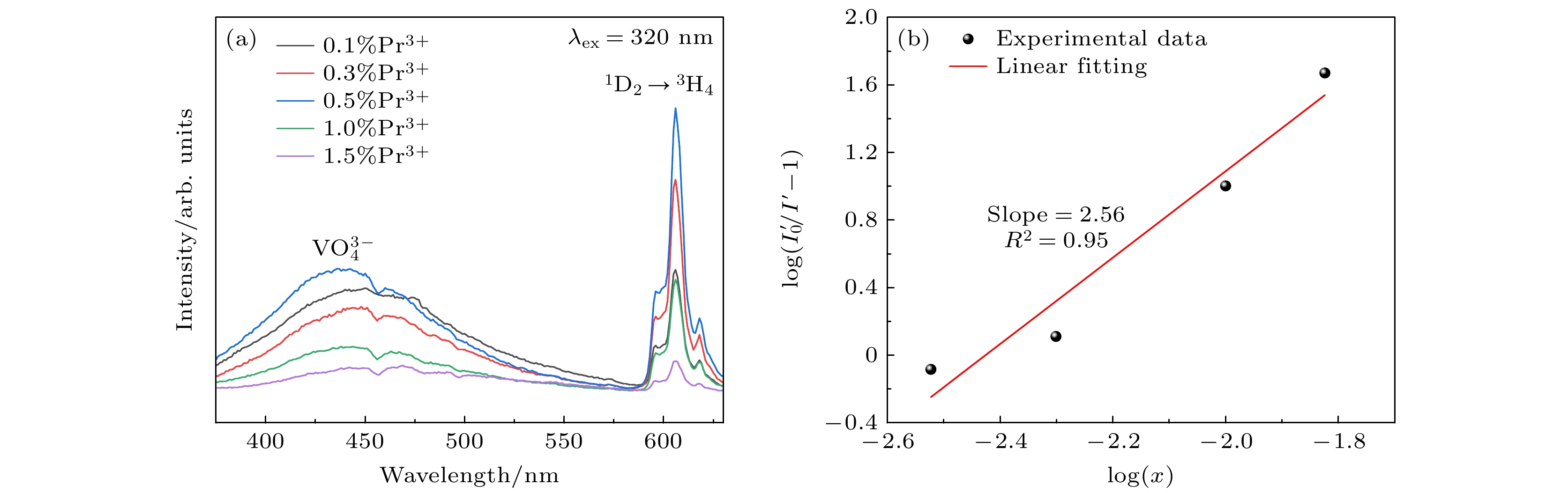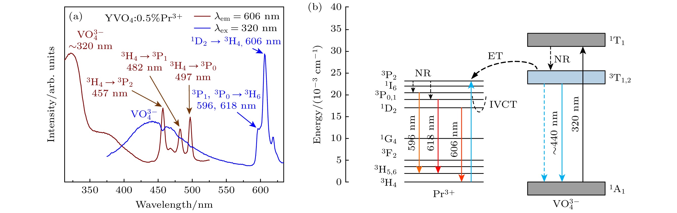 and the1D2→3H4transition of Pr3+, respectively. The relationship between the luminescence of the sample and the concentration of Pr3+is studied. It is found that the optimal doping concentration of Pr3+is 0.5%, and a higher doping concentration will cause concentration to be quenched. The reason for quenching concentration is the electric dipole-quadrupole interaction. The luminescence peak position of the temperature-dependent spectrum of YVO4:0.5%Pr3+is consistent with that at room temperature. As the temperature increases, the total luminescence intensity gradually decreases, which is caused by thermal quenching, and the mechanism of thermal quenching is analyzed. Since the temperature-dependent behaviors of luminescence of