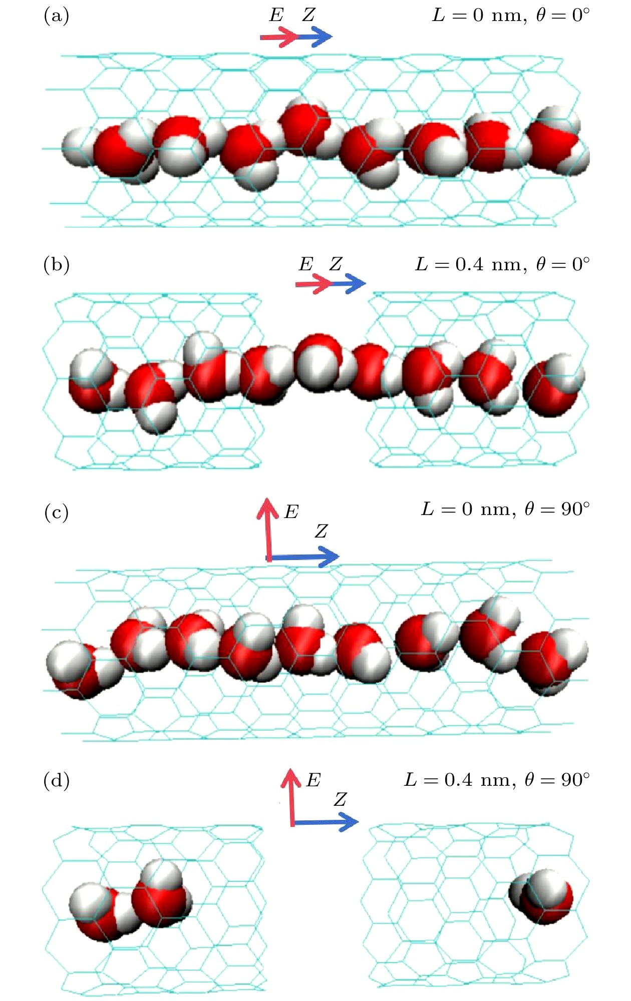 The orientation of water molecules within nanochannels is pivotal in influencing water transport, particularly under the influence of electric fields. This study delves into the effects of electric field direction on water transport through disjoint nanochannels, a structure which is of emerging significance. Molecular dynamics simulations are conducted to study the properties of water in complete nanochannel and disjoint nanochannels with gap sizes of 0.2 nm and 0.4 nm, respectively, such as occupancy, transport, water bridge formation, and dipole orientation, by systematically varying the electric field direction from 0 to 180 degrees. The simulation results disclose that the electric field direction has little influence on water flow through complete nanochannels. However, as the size of the nanogap expands, the declining trend of water transfer rate through disjoint nanochannels becomes more distinctive when the electric field direction is shifted from 0 to 90 degrees under an electric field with a strength of 1 V/nm. Notably, results also reveal distinct behaviors at 90 degrees under an electric field with a strength of 1 V/nm, where the stable water chains, unstable water bridges, and no water bridges are observed in complete nanochannels, disjoint nanochannels with 0.2 nm gap, and 0.4 nm gap, respectively. Moreover, simulations indicate that increasing the electric field strength in a polarization direction perpendicular to the tube axis facilitates water bridge breakdown in disjoint nanochannels. This research sheds light on the intricate interplay between electric field direction and water transport dynamics in disjoint nanochannels, presenting valuable insights into various applications.
