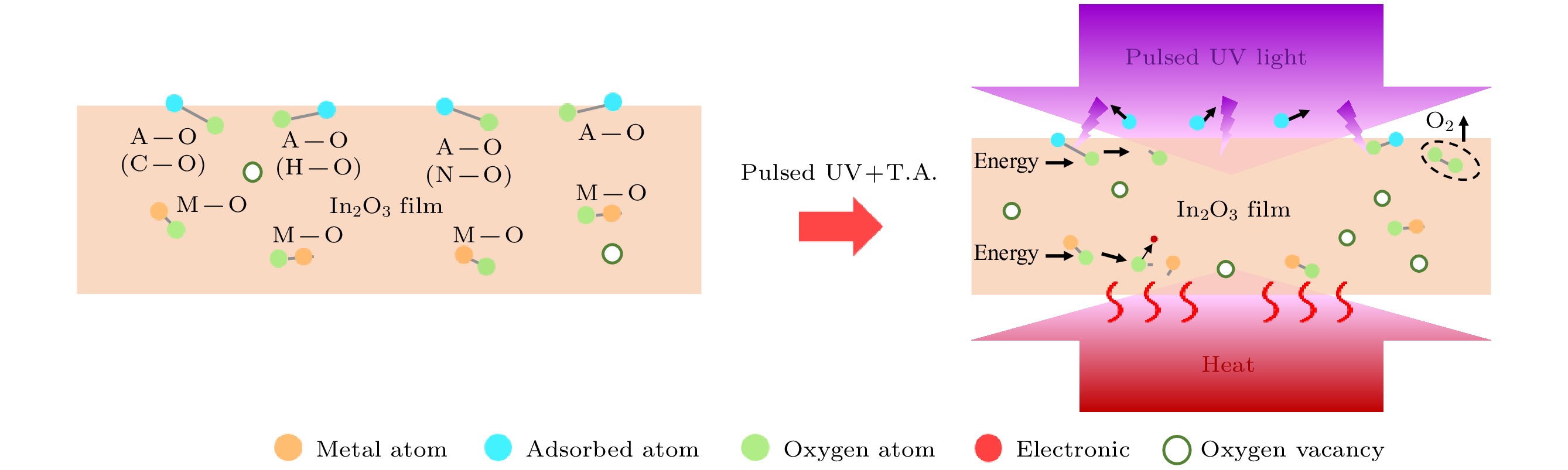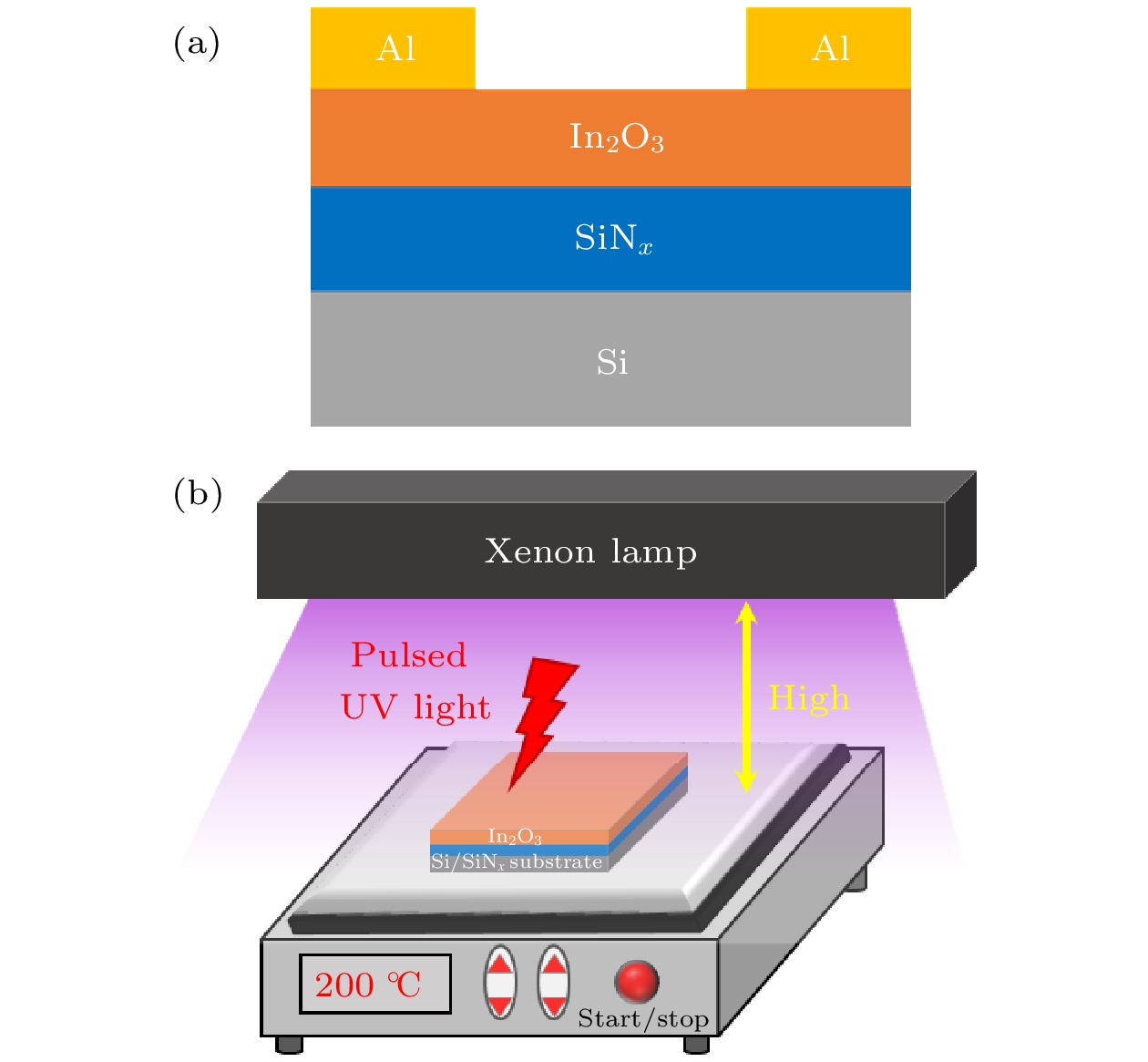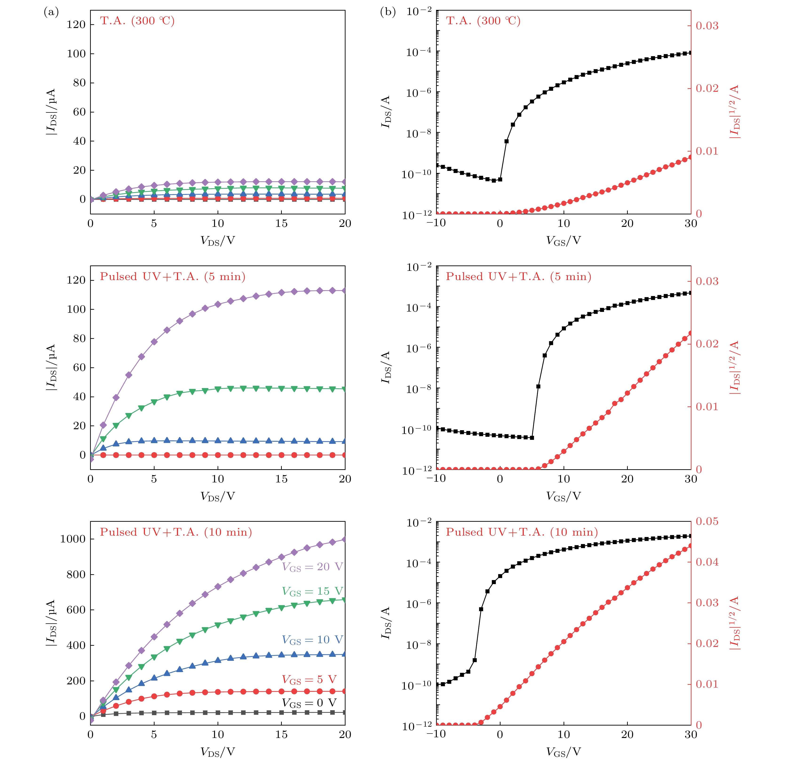 Indium oxide (In2O3) thin films and thin-film transistors (TFTs) based on the solution process are prepared by pulsed UV-assisted thermal annealing at a low temperature (200 ℃) for 5 min. The effects of pulsed UV-assisted thermal annealing on the surface morphology, chemical structure, and electrical properties of the In2O3thin films are investigated, and they are compared with those of conventional thermal annealing (300 ℃, 30 min). The experimental results show that the pulsed UV-assisted thermal annealing method can improve the quality of In2O3thin film and the performance of TFT in a short period. The results of atomic force microscopy and field emission scanning electron microscopy show that the surface of the In2O3film is denser and flatter than that of the conventional thermally annealed film, and X-ray photoelectron spectroscopy tests show that the pulsed UV-assisted thermal annealing process generates oxygen vacancies, which increases the carrier concentration and improves the electrical conductivity of the In2O3film. In addition, the effect of pulsed UV-assisted thermal annealing on the electrical characteristics of In2O3TFTs is investigated in a comparative way. The results show that the electrical characteristics of the device are significantly improved: the subthreshold swing decreases to 0.12 mV/dec, the threshold voltage is 7.4 V, the current switching ratio is as high as 1.29×107, and the field effect mobility is enhanced to 1.27 cm2·V–1·s–1. Therefore, pulsed UV-assisted thermal annealing is a simple and fast annealing method, which can rapidly improve the performances of In2O3thin film and TFTs, even under low-temperature conditions.
