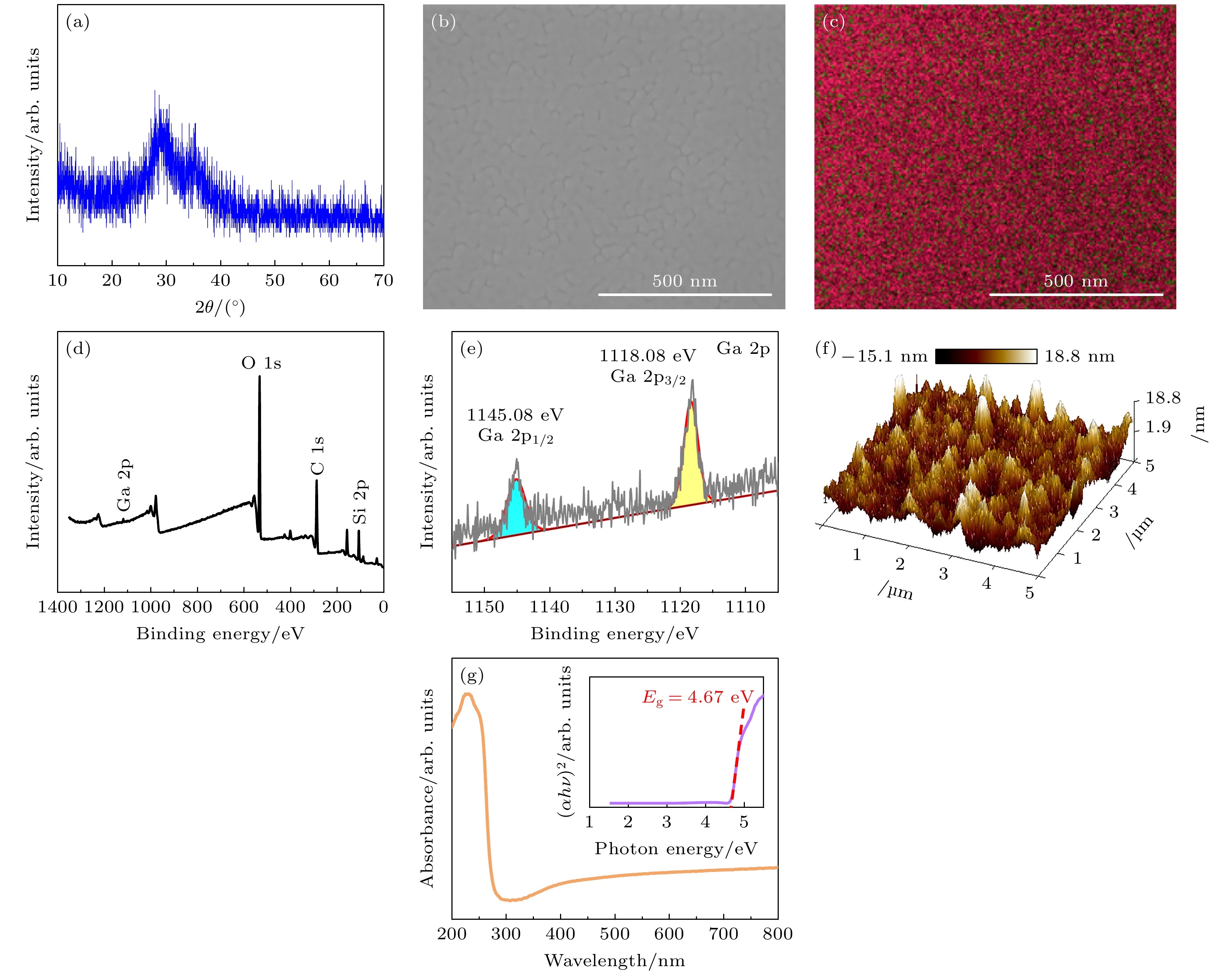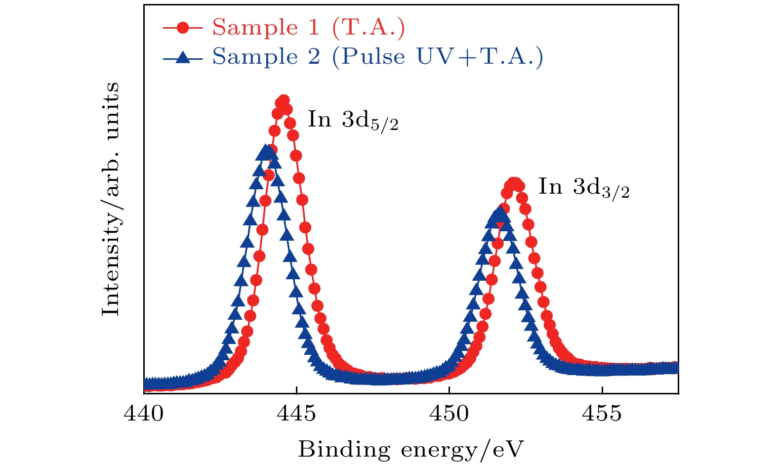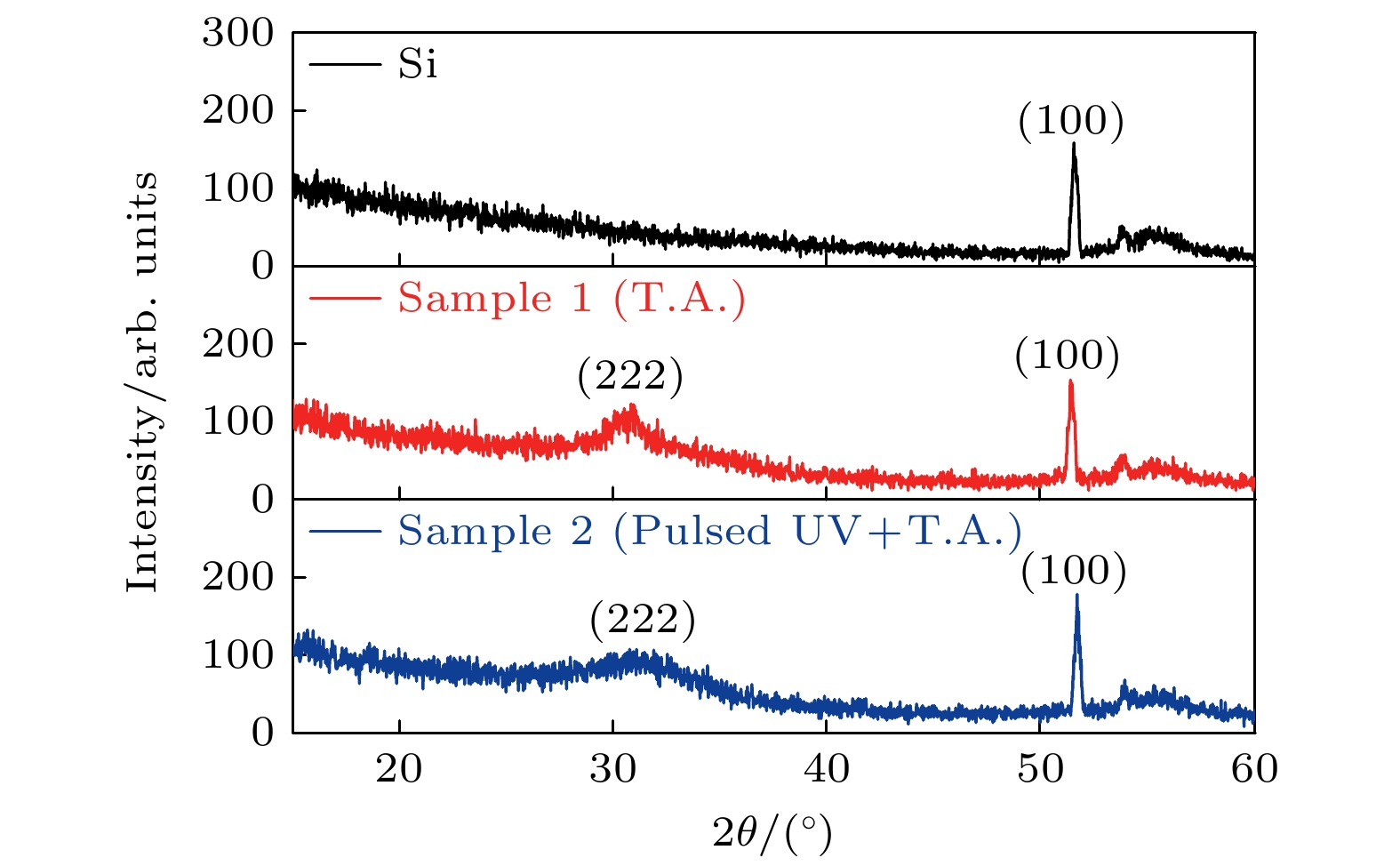 Indium oxide (In2O3) thin films and thin-film transistors (TFTs) based on the solution process are prepared by pulsed UV-assisted thermal annealing at a low temperature (200 ℃) for 5 min. The effects of pulsed UV-assisted thermal annealing on the surface morphology, chemical structure, and electrical properties of the In2O3thin films are investigated, and they are compared with those of conventional thermal annealing (300 ℃, 30 min). The experimental results show that the pulsed UV-assisted thermal annealing method can improve the quality of In2O3thin film and the performance of TFT in a short period. The results of atomic force microscopy and field emission scanning electron microscopy show that the surface of the In2O3film is denser and flatter than that of the conventional thermally annealed film, and X-ray photoelectron spectroscopy tests show that the pulsed UV-assisted thermal annealing process generates oxygen vacancies, which increases the carrier concentration and improves the electrical conductivity of the In2O3film. In addition, the effect of pulsed UV-assisted thermal annealing on the electrical characteristics of In2O3TFTs is investigated in a comparative way. The results show that the electrical characteristics of the device are significantly improved: the subthreshold swing decreases to 0.12 mV/dec, the threshold voltage is 7.4 V, the current switching ratio is as high as 1.29×107, and the field effect mobility is enhanced to 1.27 cm2·V–1·s–1. Therefore, pulsed UV-assisted thermal annealing is a simple and fast annealing method, which can rapidly improve the performances of In2O3thin film and TFTs, even under low-temperature conditions.
