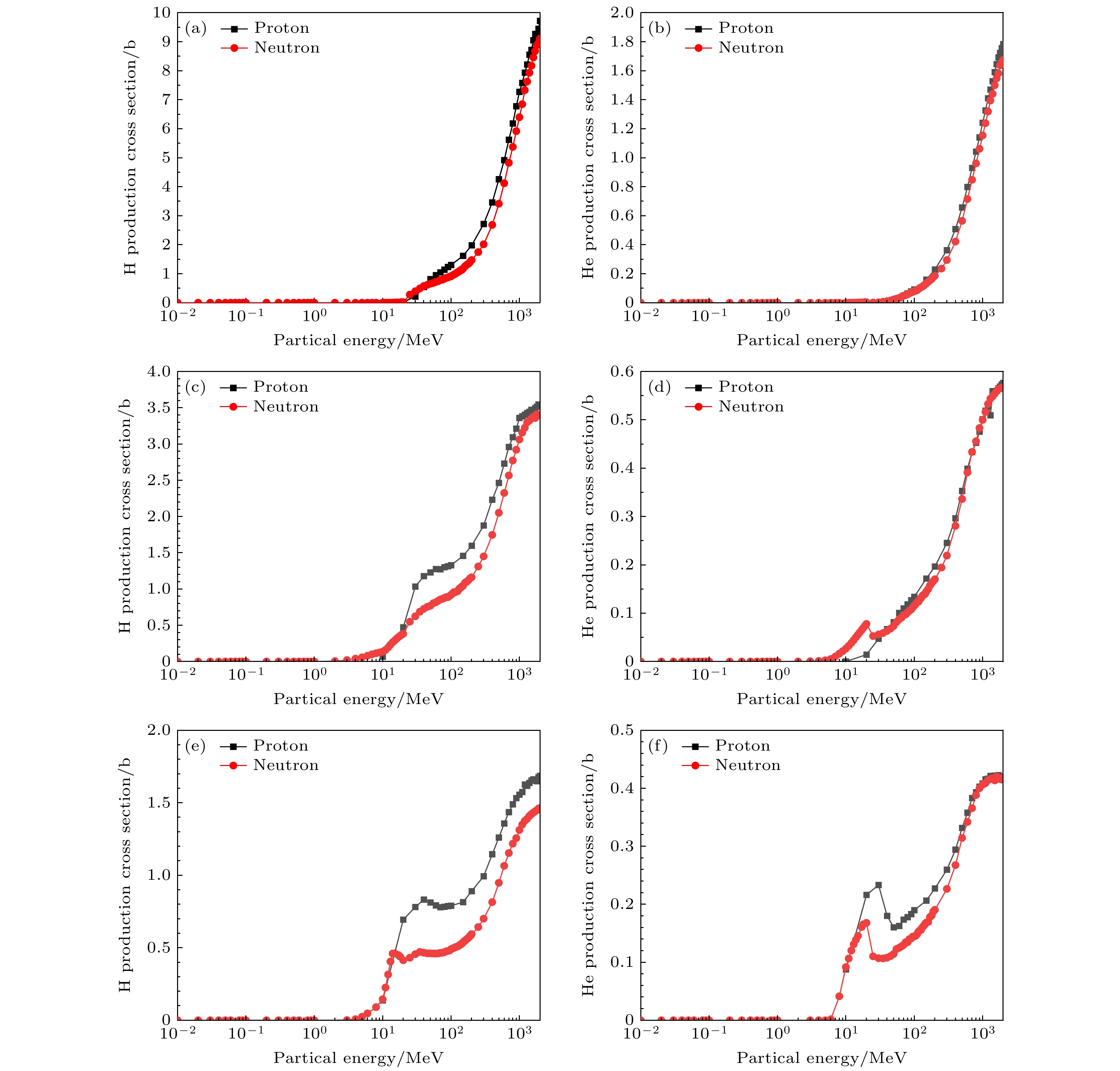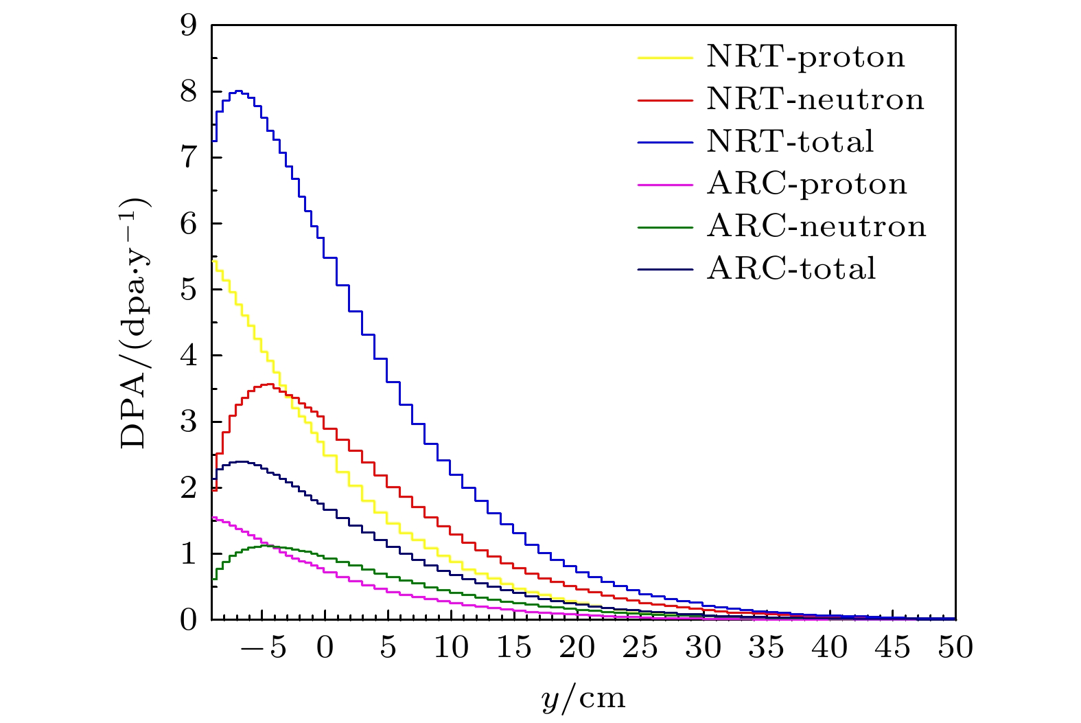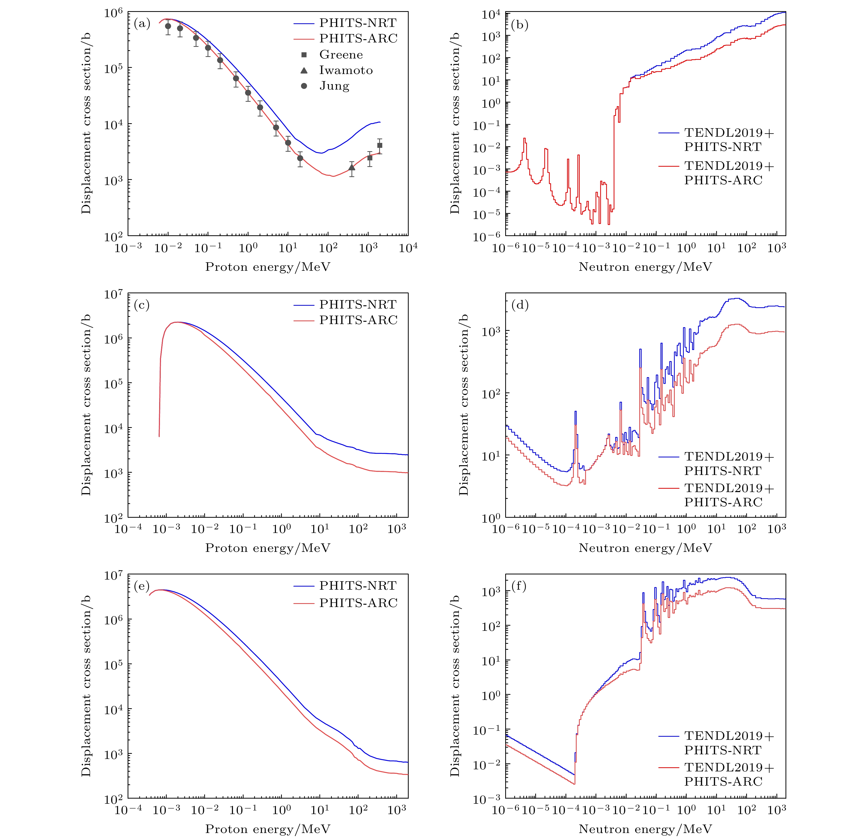 China Spallation Neutron Source (CSNS) I project passed the national acceptance in 2018, and current beam power has reached 140 kW. In order to further improve the output neutron strength of the target station moderator, a 500 kW power upgrade plan has been proposed for CSNS II. The target station is an important part of the spallation neutron source. In the target station, a large number of neutrons are produced by the spallation reaction between high energy protons and the target, these neutrons are moderated by the moderator and become neutrons for neutron scattering experiments. During operation, the target and other key components such as the target container, the moderator reflector container, and the proton beam window are irradiated by high-flux and high-energy particles for a long time, which will result in serious radiation damage. It is important to assess the accumulated radiation damage during operation to determine the service life of each component. At present, the physical quantities used to evaluate the radiation damage degree of materials include displacement per atom (DPA), H and He production. In this work, the displacement damage cross sections of protons and neutrons and the H, He production cross sections for W, SS316 and Al-6061 materials are obtained by using PHITS. The effects of the Norgett-Robinson-Torrens (NRT) model and athermal recombination corrected (ARC) model on the calculation of displacement damage are analyzed. The results show that the cross section calculated based on ARC model is lower than that based on NRT model, because the NRT model does not take into account the resetting of the atoms before reaching thermodynamic equilibrium. On this basis, DPA, H and He production of the key components of the target station operating for 5000 h at a power of 500 kW are calculated by combining the baseline model of the second phase target station of the spallation neutron source in China. The results show that the yields of NRT-dpa, ARC-dpa, H and He produced by irradiation are 8.01 dpa/y (in this paper, 1 y = 2500 MW·h), 2.39 dpa/y, 5110 appm/y and 884 appm/y, respectively. The radiation damage values of the target vessel are 5.34 dpa/y, 1.92 dpa/y, 2180 appm/y and 334 appm/y, respectively. The radiation damage values of the moderators and reflectors are 3.78 dpa/y, 1.77 dpa/y, 124 appm/y, and 36.7 appm/y. The radiation damage values of the proton beam window are 0.35 dpa/y, 0.19 dpa/y, 962 appm/y, and 216 appm/y. Subsequently, the life of each component is estimated by analyzing the radiation damage. These results are very important for analyzing the radiation damage of these parts, and constructing reasonable maintenance programs.