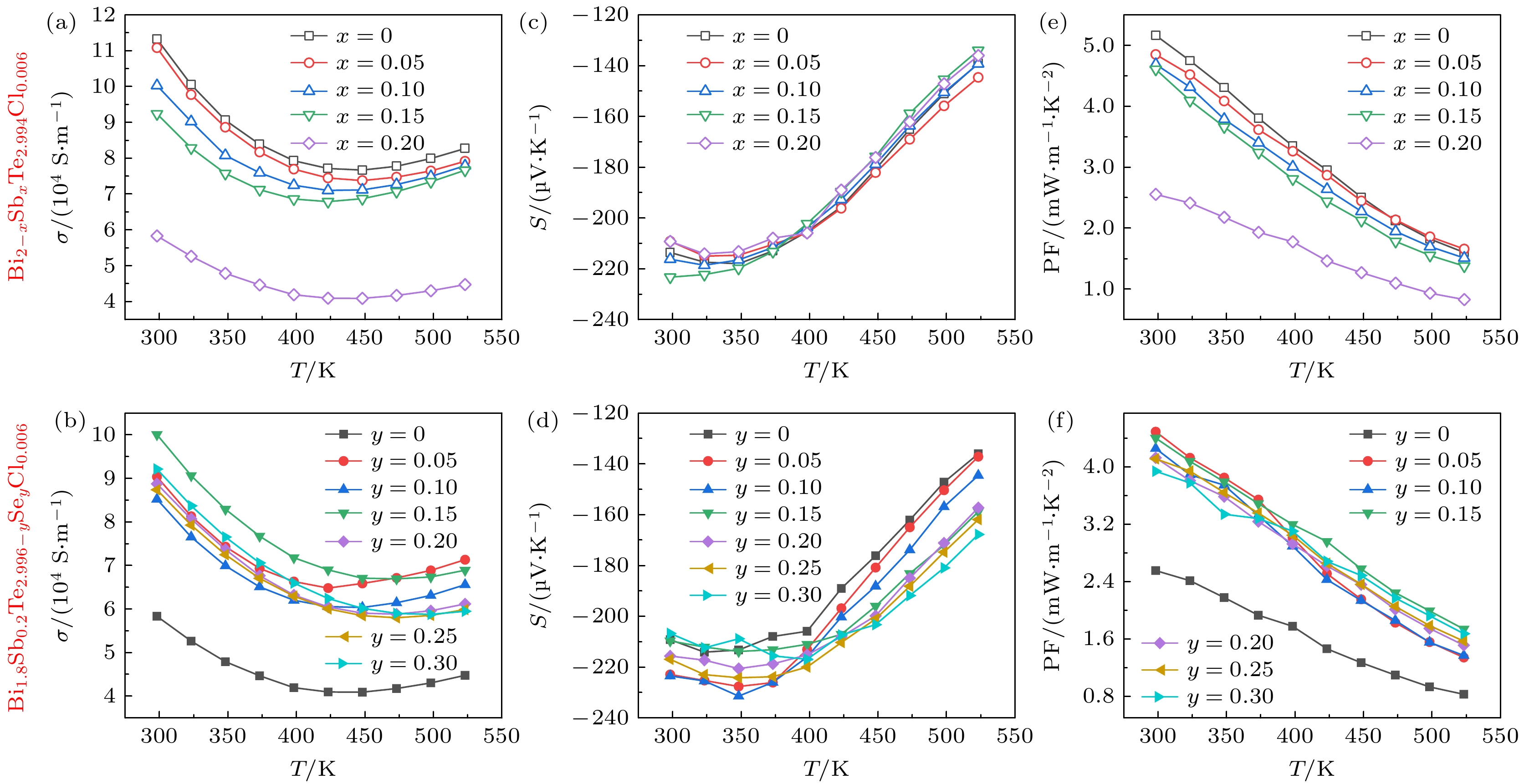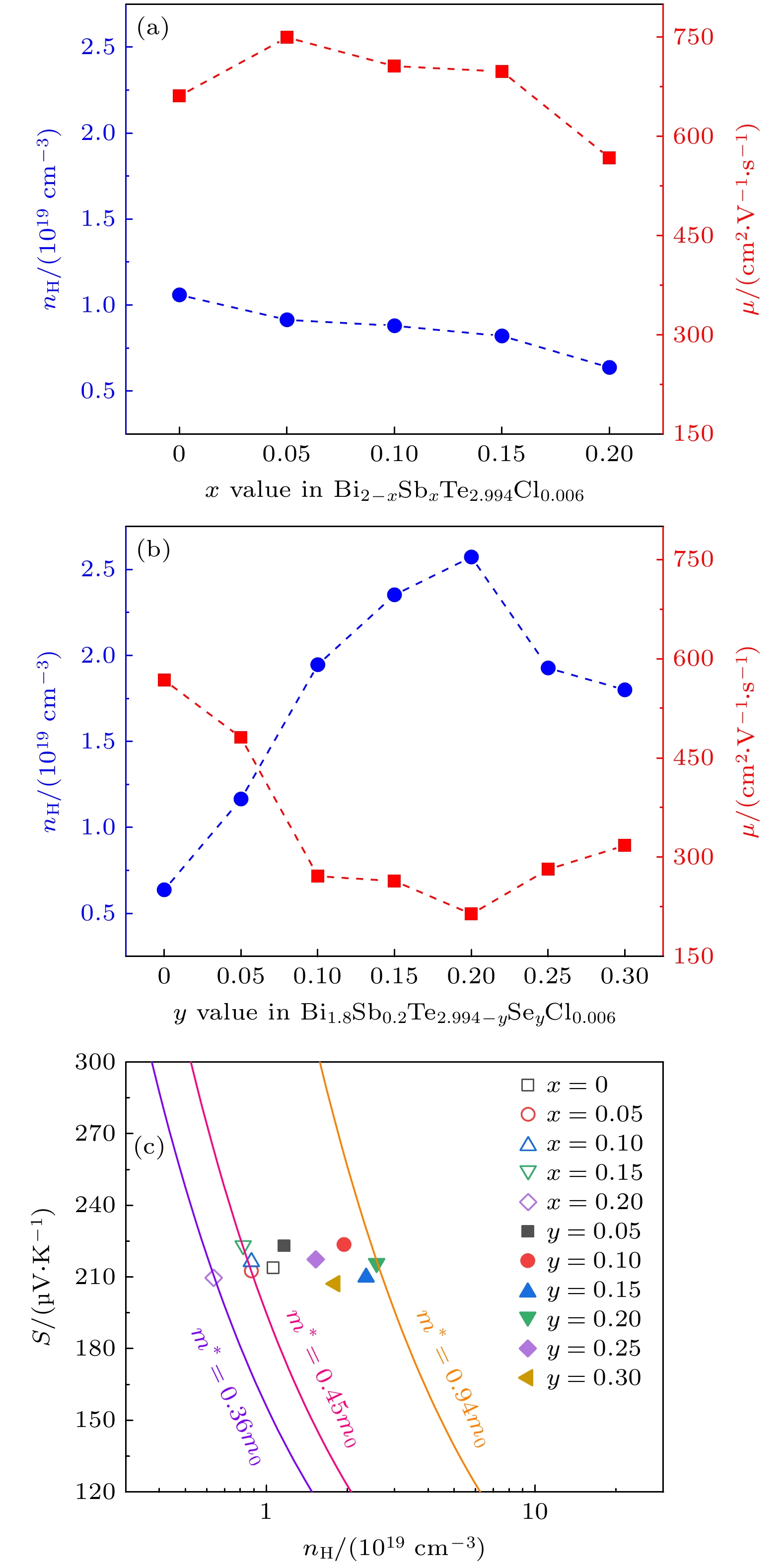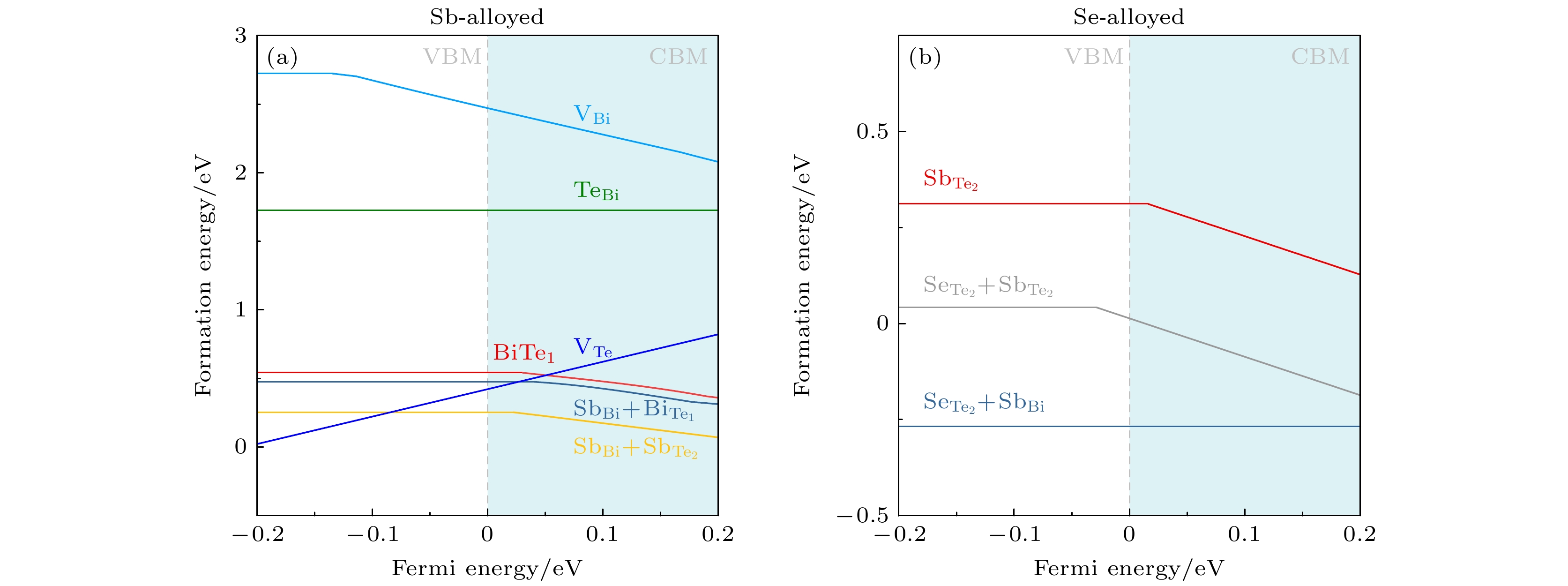 and accompanied with the increase of the minority carrier concentration from 2.09×1016to 3.99×1017cm–3. The increase of the minority carrier severely deteriorates the electrical transport properties. In contrast, alloying Se in the Bi1.8Sb0.2Te2.994–ySeyCl0.006compound significantly lowers the formation energy of the complex defect