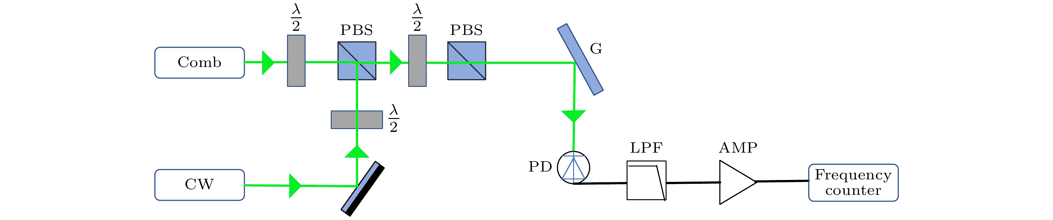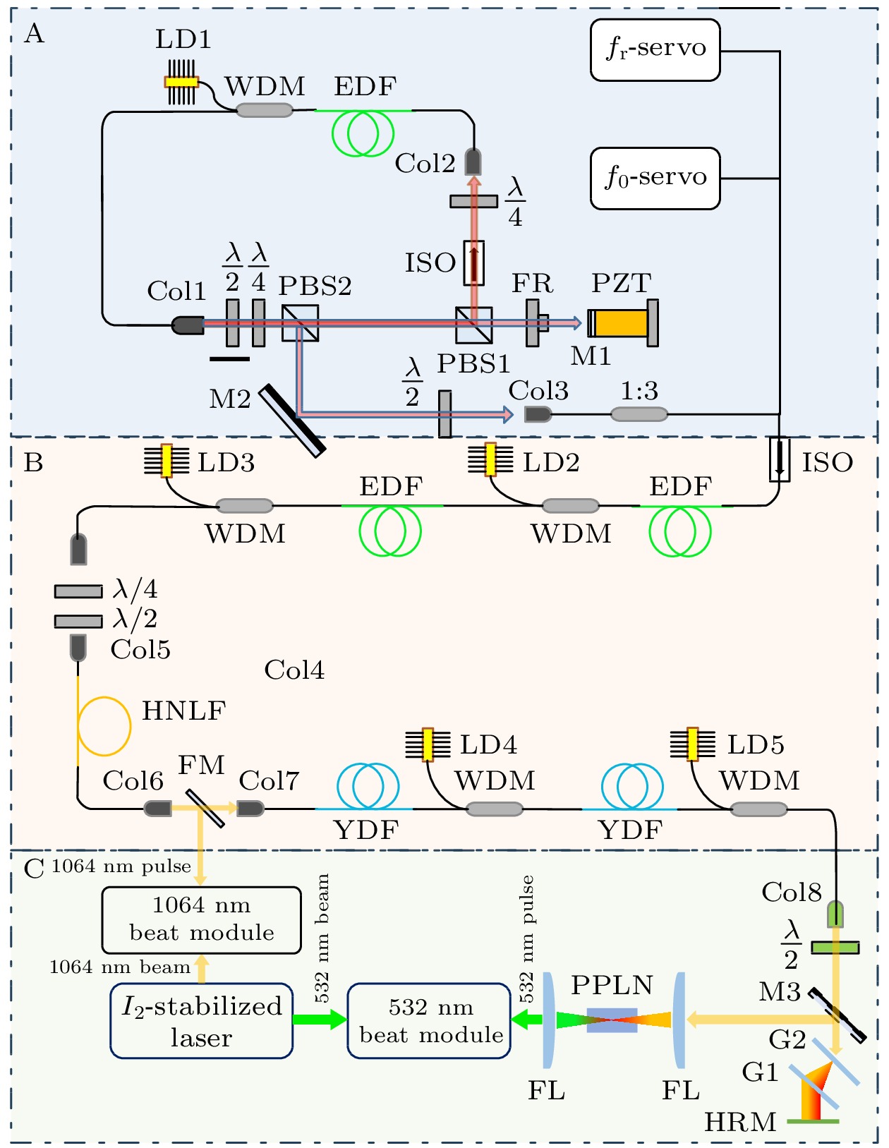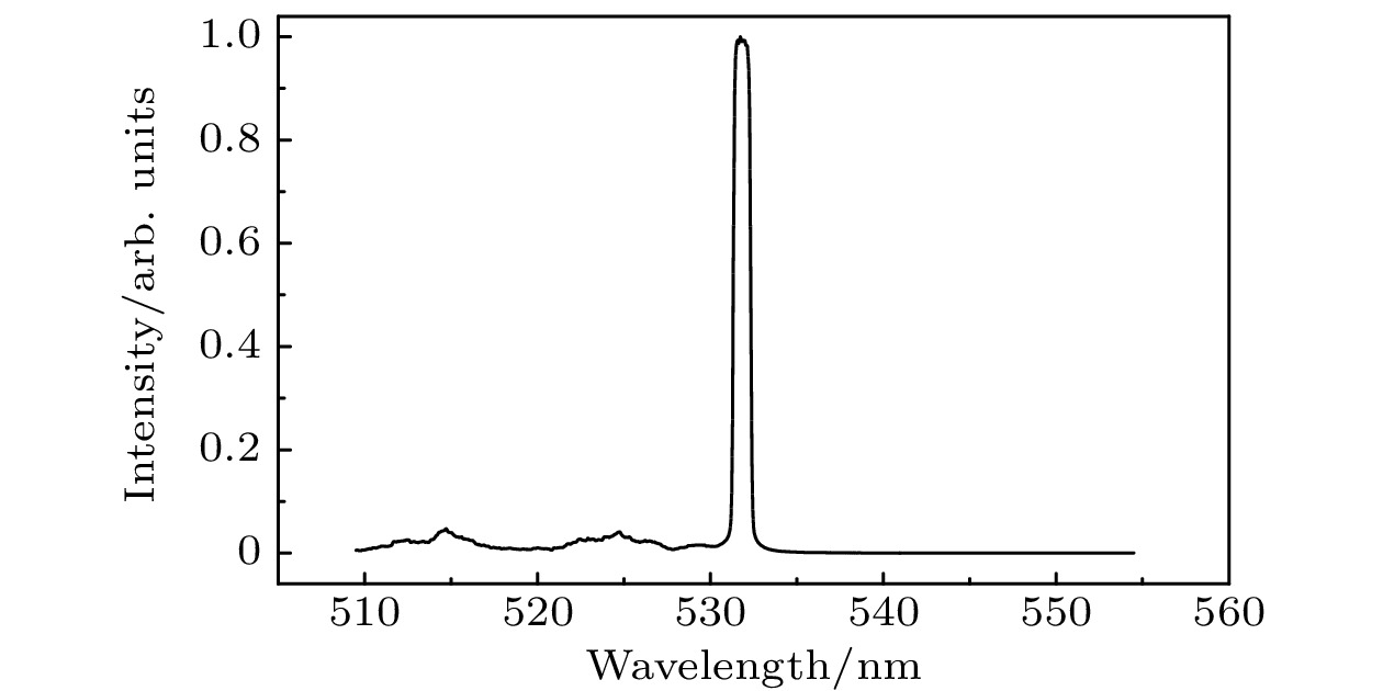 The iodine frequency stabilized 532 nm Nd:YAG laser plays an important role in realizing the reproduction unit of length “meter (m)”, absolute gravity measurement, gravitational waves detection, precision spectroscopy, distance metrology, etc. Absolute frequency measurement and calibration of the laser are of great significance for evaluating the performance of laser. The previous method of extending the erbium-doped fiber optical frequency comb (Er-FOFC) to the wavelength of 532 nm was to first amplify the seed light, then realize frequency-doubled with a periodic polarization lithium niobate crystal, and finally couple it into a photonic crystal fiber to expand the spectrum to the 532 nm band. With such a technique, the a signal-to-noise ratio (SNR) of the beat signal between the iodine-stabilized 532 nm Nd:YAG laser and the Er-FOFC was approximately 30 dB. Moreover, the SNR of the beat signal was unstable, resulting in the errors in frequency measurement with a counter. This is not conducive to the long-term frequency measurement of the iodine-stabilized 532 nm Nd:YAG laser. Therefore, a method that can obtain both high SNR and long-term stable beat signals is required. In this paper, an Er-FOFC is developed. The spectral enhancement of its broadening at 1 μm is carried out, and then expanded to the wavelength at 532 nm by using a frequency-doubling crystal. The output power of the Er-FOFC is 20 mW, which is first amplified to 370 mW by an Er-fiber amplifier and then compressed to a pulse width of 45.7 fs. Subsequently, the spectrum is extended to cover the wavelength at 1 μm with a highly nonlinear fiber, resulting in an output power of 180 mW. The broadened spectrum at 1 μm is amplified to 601 mW by a Yb-fiber amplifier, and the compressed power increases to 420 mW. Using an MgO:PPLN crystal, the compressed laser is frequency-doubled to produce a 532 nm laser output with 155 mW power and a doubling efficiency of 36%. Utilizing this system, the absolute frequency measurements are conducted on the fundamental frequency light at 1064 nm and the doubled frequency light at 532 nm from the iodine-stabilized 532 nm Nd:YAG laser, yielding a beat signal with an SNR of greater than 40 dB. This SNR represents a 13 dB improvement compared with the result obtained when an amplified seed light is frequency-doubled by using PPLN and then coupled into a PCF for direct spectral broadening to cover the 532 nm band. Over several days of continuous monitoring, there is no observed risk of SNR degradation. Moreover, subsequent frequency measurements are carried out continuously for over several hours, with the results maintaining consistency with recommended values.