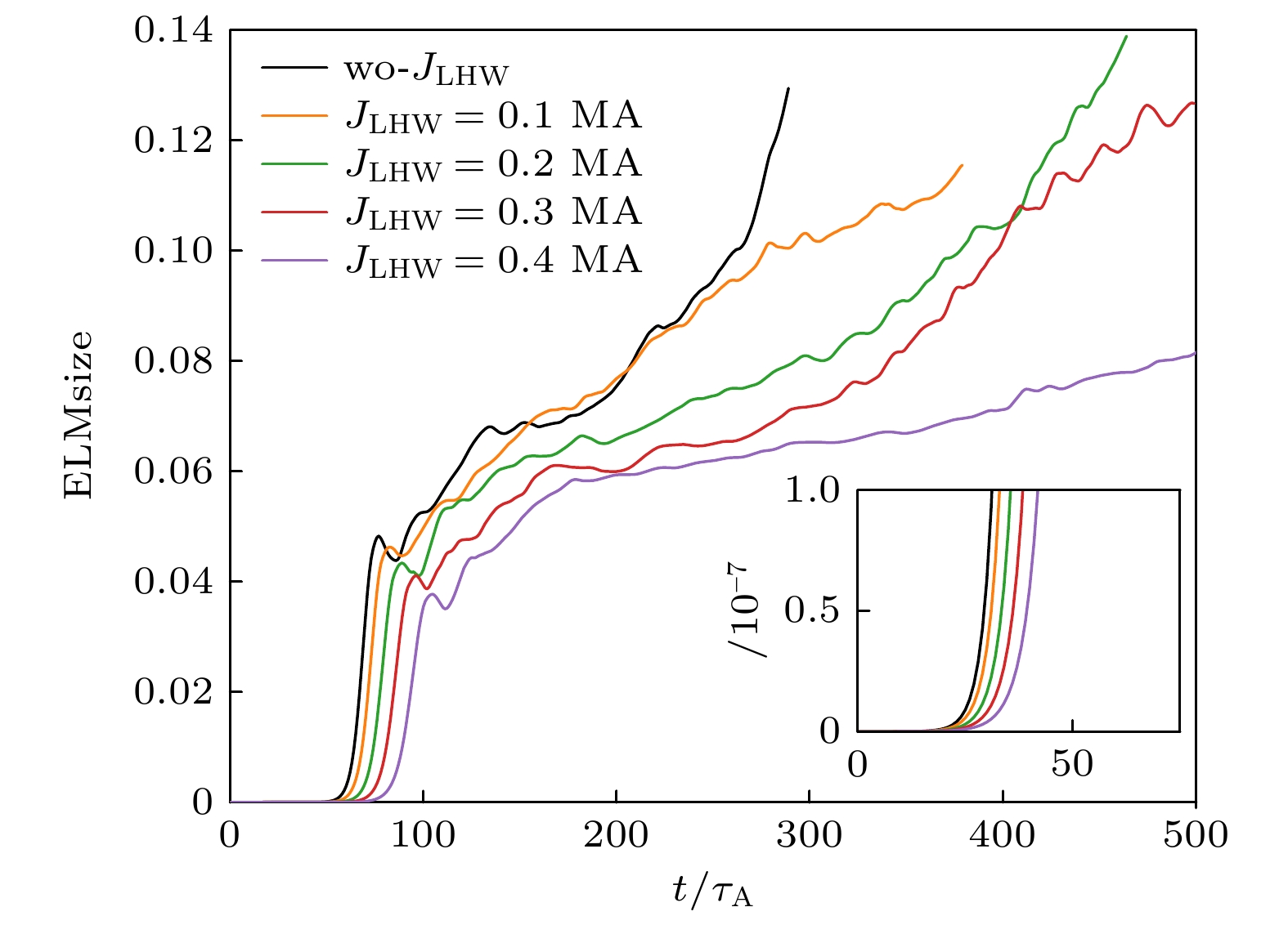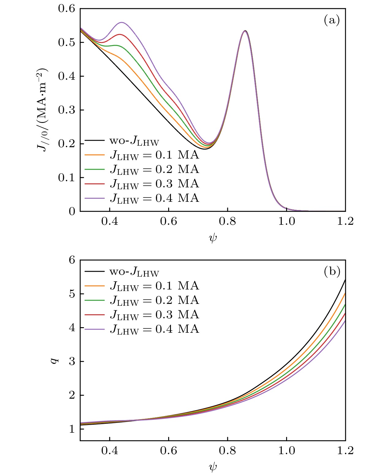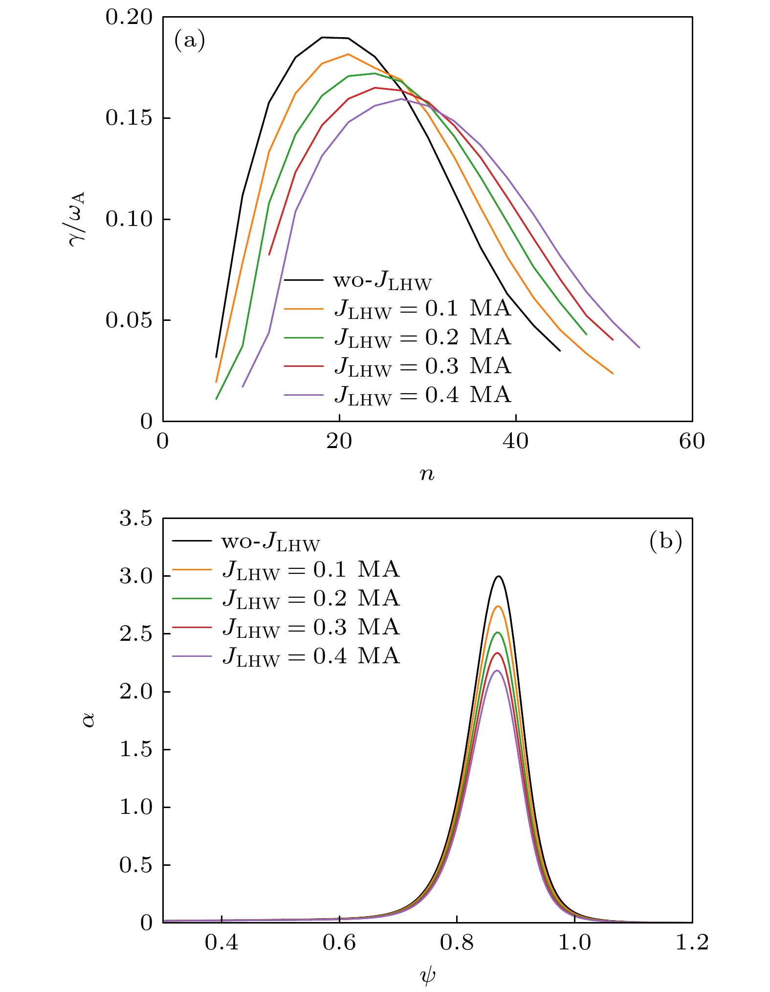 The high-confinement mode (H-mode) significantly enhances the energy and particle confinement in fusion plasma compared with the low-confinement mode (L-mode), and it is the basic operation scenario for ITER and CFETR. Edge localized mode (ELM) often appears in H-mode, helping to expel impurities to maintain a longer stable state. However, the particle burst and energy burst from ELM eruptions can severely damage the first wall of fusion device, so, it is necessary to control the ELM. Experiments on EAST tokamak and HL-2A tokamak have been conducted with ELM mitigation by lower hybrid wave (LHW), confirming the effect of LHW on ELMs, but the physical mechanism of ELM mitigation by LHW is still not fully understood. In this paper, the influences of LHW injection on the linear and nonlinear characteristics of peeling-ballooning mode (P-B mode) are investigated in the edge pedestal region of H-mode plasma in tokamak by using the BOUT++ code. The simulations take into consideration both the conventional main plasma current driven by LHW and the three-dimensional perturbed magnetic field generated by the scrape-off layer helical current filament (HCF) on the P-B mode. The linear results show that the core plasma current driven by LHW moves the linear toroidal mode spectrum towards higher mode numbers and lower growth rates by reducing the normalized pressure gradient and magnetic shear of the equilibrium. Nonlinear simulations indicate that due to the broadening of the linear mode spectrum, the core current driven by LHW can reduce the pedestal energy loss caused by ELM through globally suppressing different toroidal modes of the P-B mode, and the three-dimensional perturbed magnetic field generated by LHW-driven HCF can reduce the energy loss caused by ELMs through promoting the growth of modes other than the main mode and enhancing the coupling between different modes. It is found in the study that the P-B mode promoted by the three-dimensional perturbed magnetic field generated by HCF has a mode number threshold, and when the dominant mode of the P-B mode is far from the mode number threshold driven by the three-dimensional perturbed magnetic field, the energy loss due to ELMs is more significantly reduced. These results contribute to a more in-depth understanding of the physical mechanism in ELM control experiment by LHW.