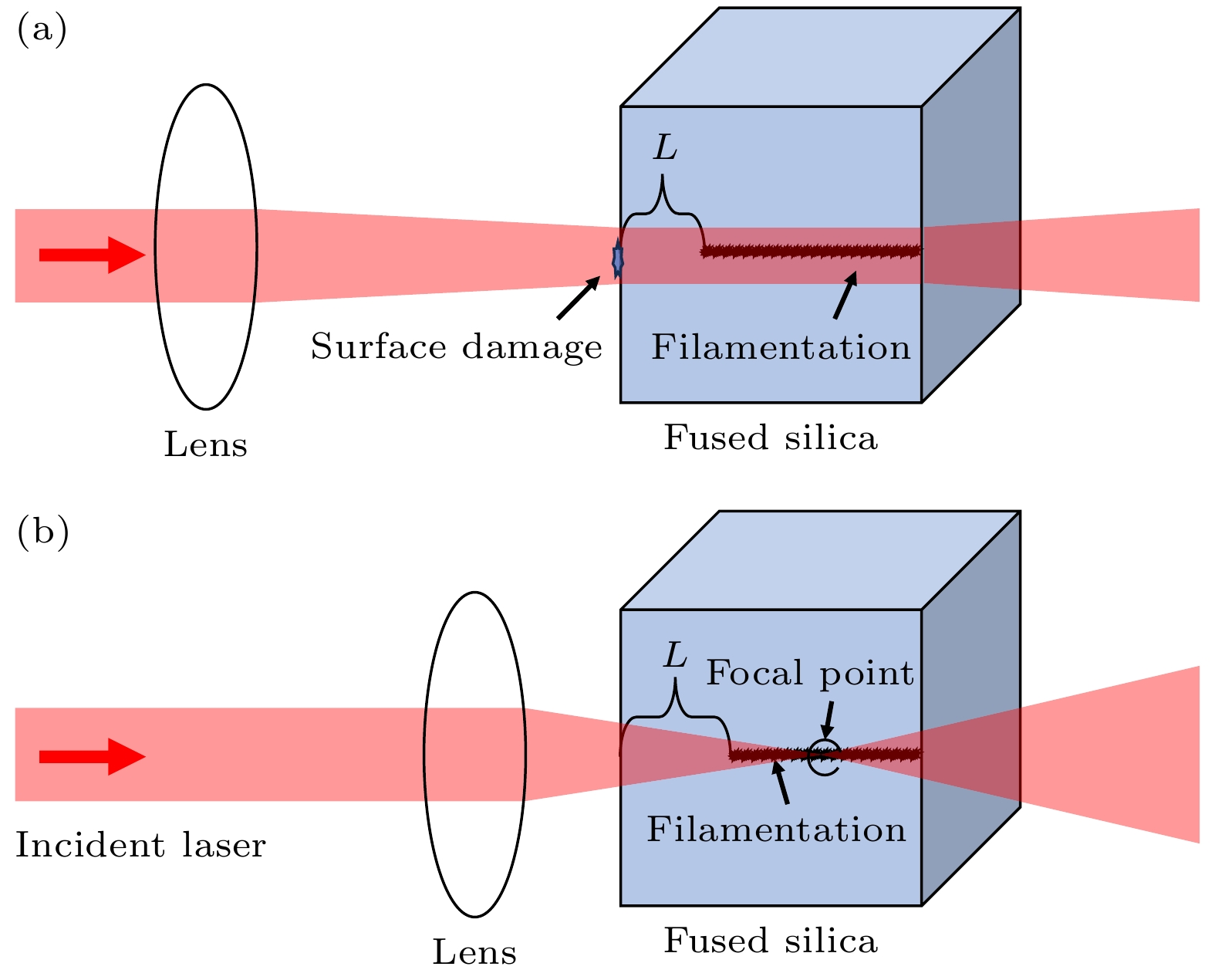 The low-temporal coherence light (LTCL) has received extensive attention in the research of inertial confinement fusion due to its physical properties of instantaneous broadband. Recent reports demonstrated that the LTCL has significant suppression effects on laser plasma instability. However, the temporal spike structures of the LTCL will not only induce the amplification of the self-focusing effect, but also make its small-scale self-focusing characteristics and corresponding damage mechanism more complicated. Exploring the self-focusing characteristics of the LTCL will provide an important information for improving the output power of the LTCL. In this work, we design a more accurate test method for comparing the nonlinear self-focusing effects of different lasers, and compare the self-focusing effect of LTCL with single longitudinal mode (SLM) pulse. In the experiments, fused silica is tightly focused by a short focal length lens to avoid damaging the input surface. A spatially resolved test method is designed to measure the nonlinearI×Lvalue (whereIis the incident intensity,Lis the distance from the head of filamentation damage to the input surface), which is accumulated from the input surface to the head of filamentation damage. The results show that the nonlinearI×Lvalue obtained by the spatially resolved method is lower than by the traditional test method, since the energy loss caused by incident surface damage and backward stimulated Brillouin scattering (SBS) has been resolved. Furthermore, the nonlinearI×Lvalues of the SLM pulse and the LTCL are also compared by the traditional test method and spatially resolved method. The test results show that due to the temporal spike structure, the LTCL has a lower nonlinearI×Lvalue than the SLM pulse. The SBS effect and the different damage characteristics of the input surface are also analyzed. This study provides a more accurate test method for better analyzing the self-focusing effect of LTCL and laser pulses with different characteristics, and hence presenting a reference for designing high-power devices of low-temporal coherence light.