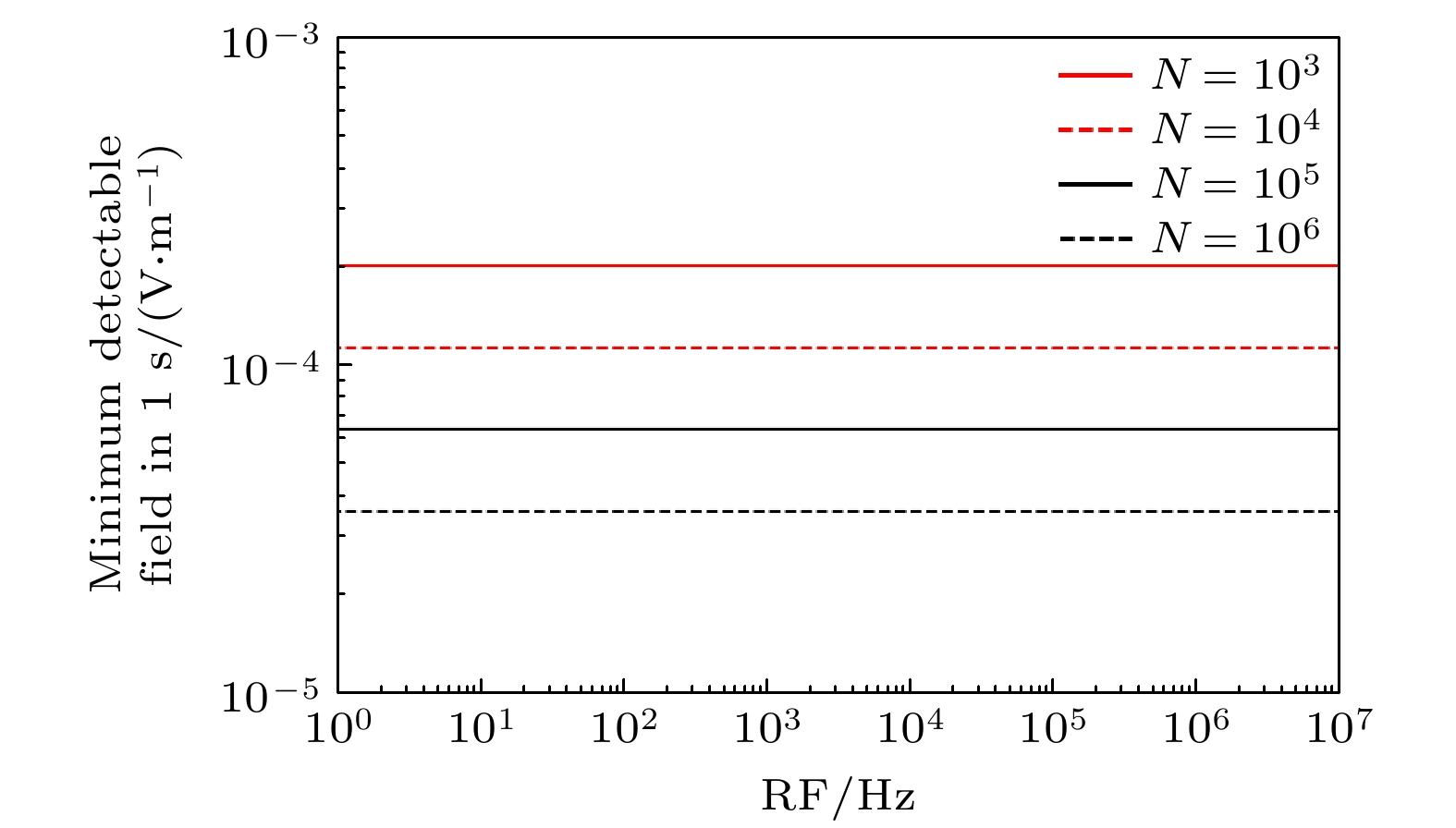 transition. The value ofβallows one to use the result for any Rydberg state sensor to determine the SNR for anyΕin a 1 s measurement. Therefrom, Rydberg sensor can preferentially detect many RF frequencies spreading across its carrier spectral range without modification while effectively rejecting large portions where the atom response is significantly weaker, and the signal depends primarily on the detuning of the RF field to the nearest resonance which does not convey the RF frequency directly.