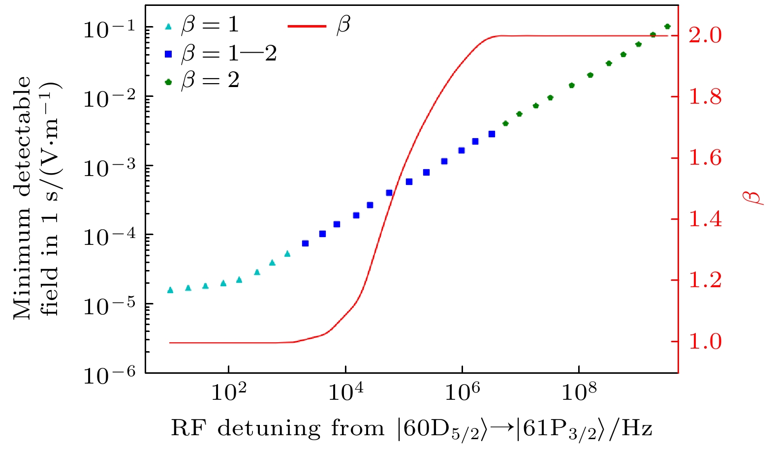 state in electric fields with different frequencies withε= 100 mV/m. Rydberg atoms provide a structured spectrum of sensitivity to electric fields due to strong resonant interaction and off-resonant interaction with many dipole-allowed transitions to nearby Rydberg states. This kind of the frequency response structure is of significance to a broadband sensor. And we calculate the sensitivity and the scaling of the signal-to-noise ratio (SNR),β, varying with detuning from the