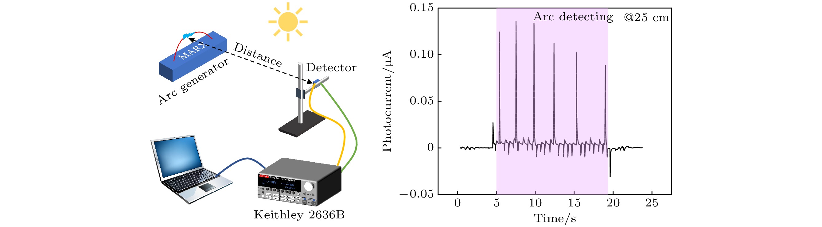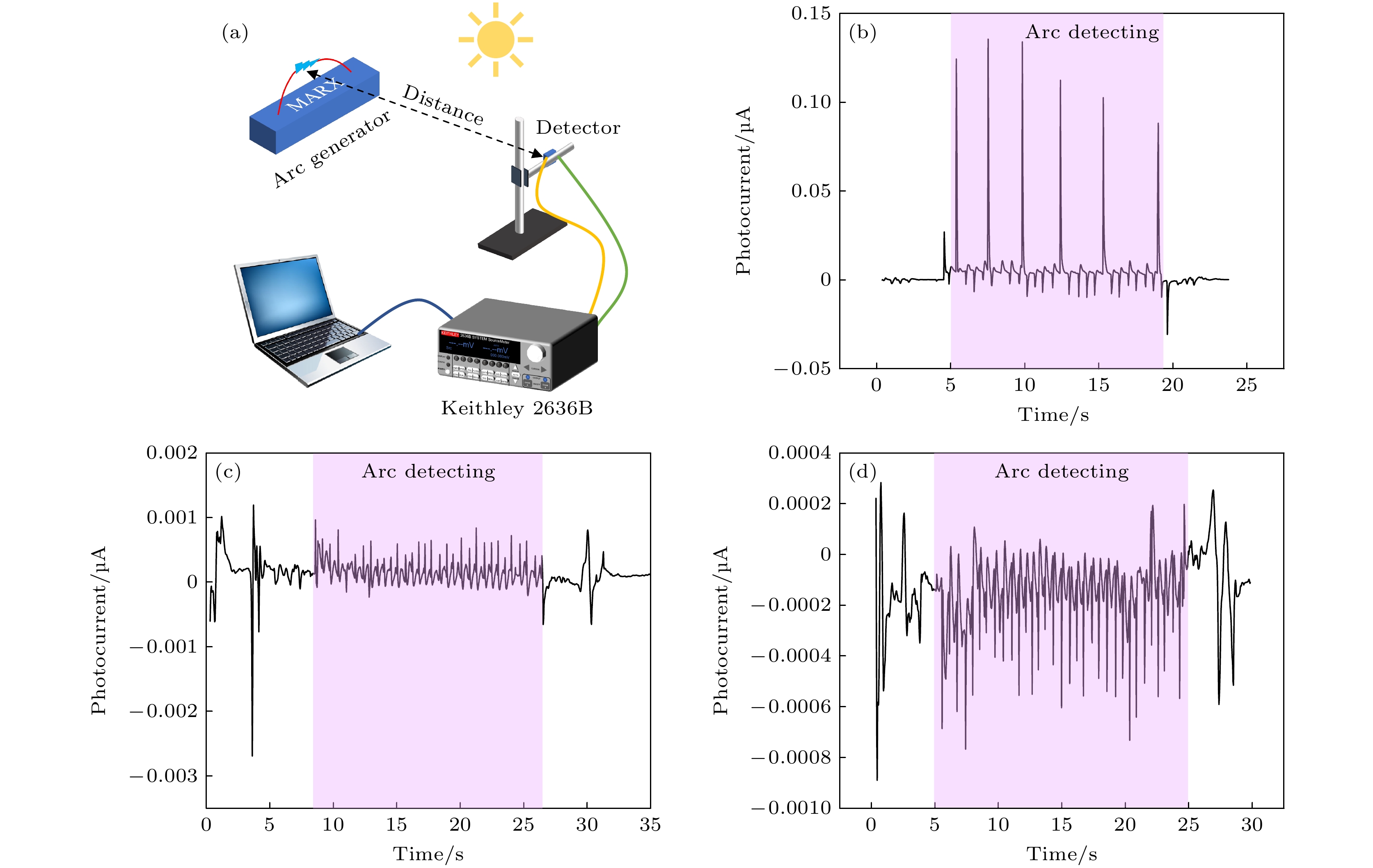 The performance of gallium oxide (Ga2O3) thin film detector based on metal-semiconductor-metal (MSM) is highly dependent on the uniformity of the Ga2O3thin film, and the manufacturing process is quite sophisticated, which poses a challenge for the scale-up and mass production of thin film photodetectors. In this work, an MSM Ga2O3thin film solar-blind photodetector with five-finger interdigital electrodes is fabricated by physically depositing Ga2O3thin film on the surface of a mass-produced cantilevered thin film chip. Through the microelectromechanical system (MEMS) process, the cantilever electrode structure is prepared, which protects the internal circuit and the integrity of the thin film. The Ga2O3thin film treated by argon plasma at a low temperature is amorphous, but the photodetector still possesses considerable ultraviolet detection performance. At a bias voltage of 18 V, it approaches the detection performance of crystalline Ga2O3thin film, with a detectivity of 7.9×1010Jones, an external quantum efficiency of 1779%, rise time and decay time of 1.22 s and 0.24 s, respectively. Moreover, a system of arc detection is built in outdoor environments. Without any optical focusing system, this photodetector achieves sensitive detection of pulsed arc in an outdoor sunlight environments. For pulsed arcs with an output voltage of 100 kV, the photodetector is capable of sensitive detection at a distance of 25 cm. Besides, the maximum detection distance of 155 cm indicates that the photodetector will have a favorable potential application value in the field of solar-blind detection. This work develops a sensitive functional thin film deposition technology based on the cantilever electrode structure fabricated by the MEMS process, which avoids the influence of the large-area uniformity of the functional thin film on the etching circuit. It provides a new technical approach and process route for preparing MSM photodetectors.