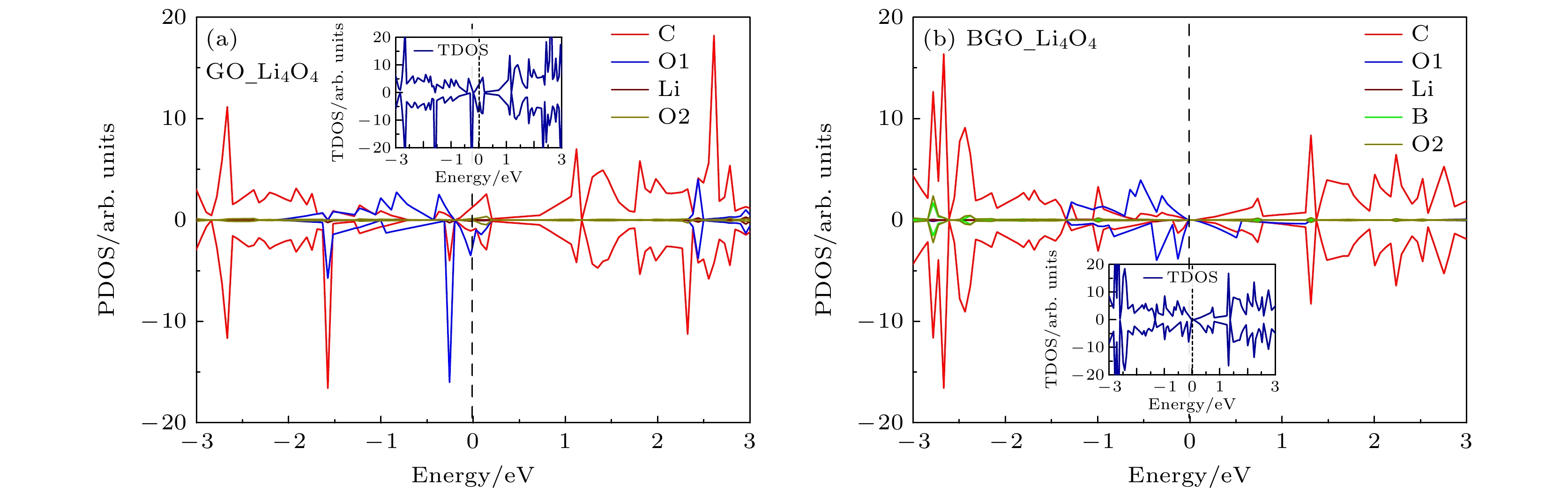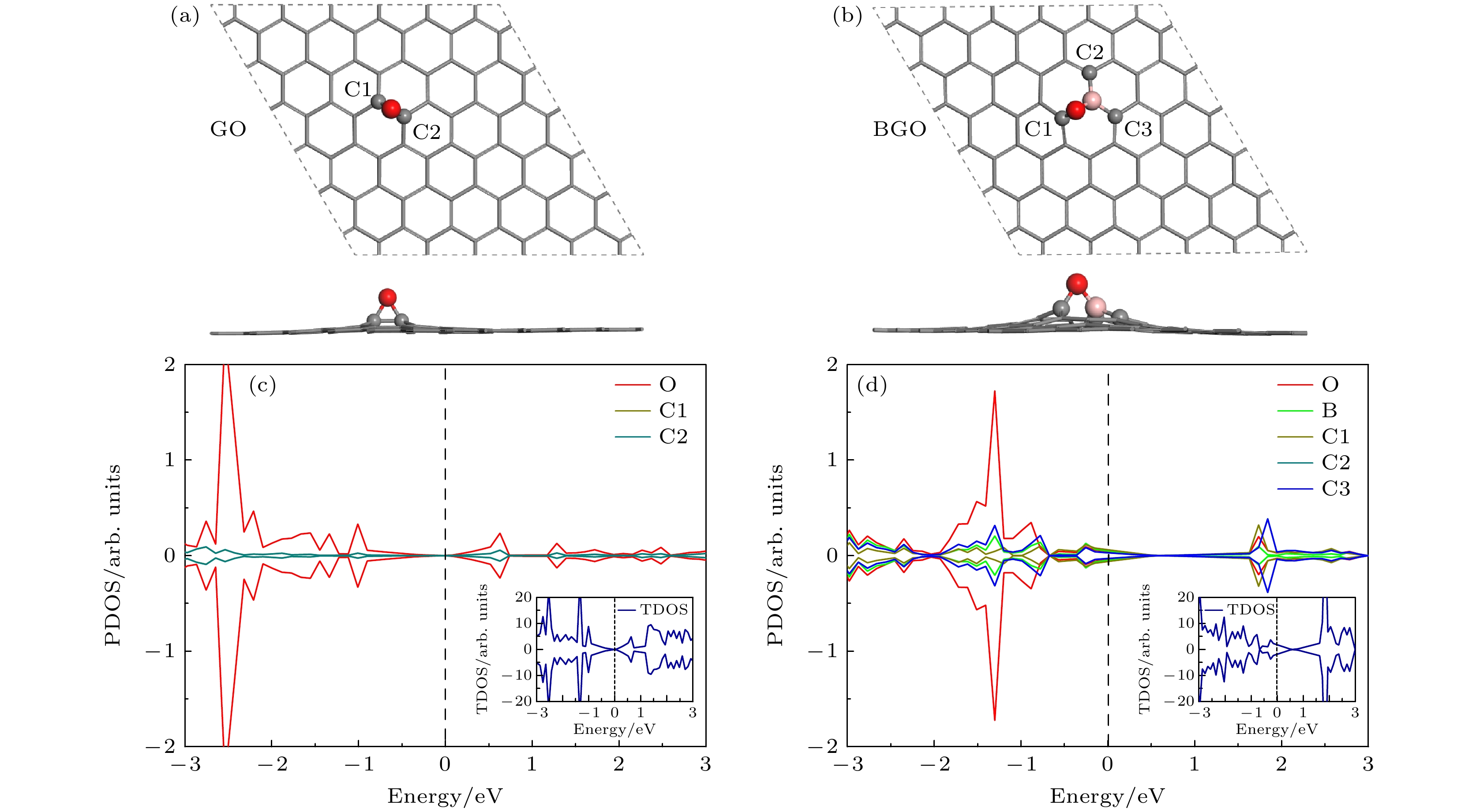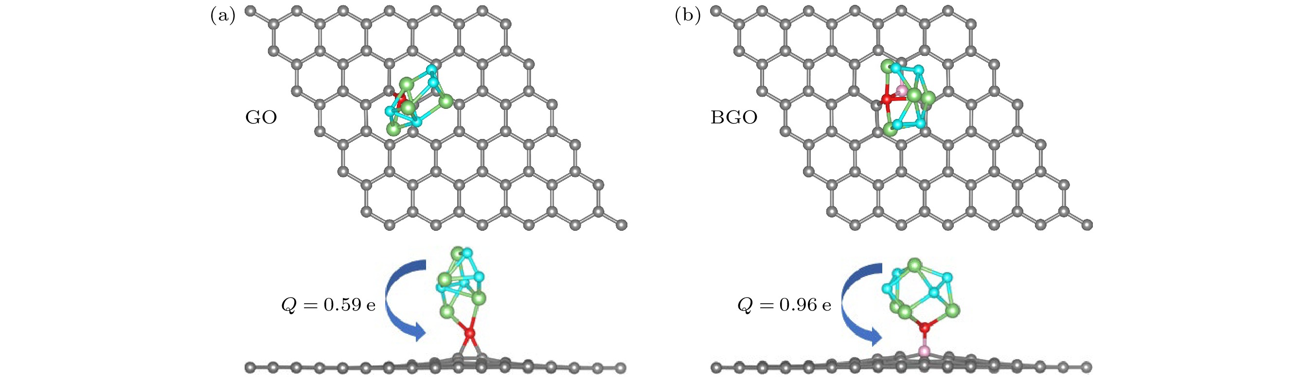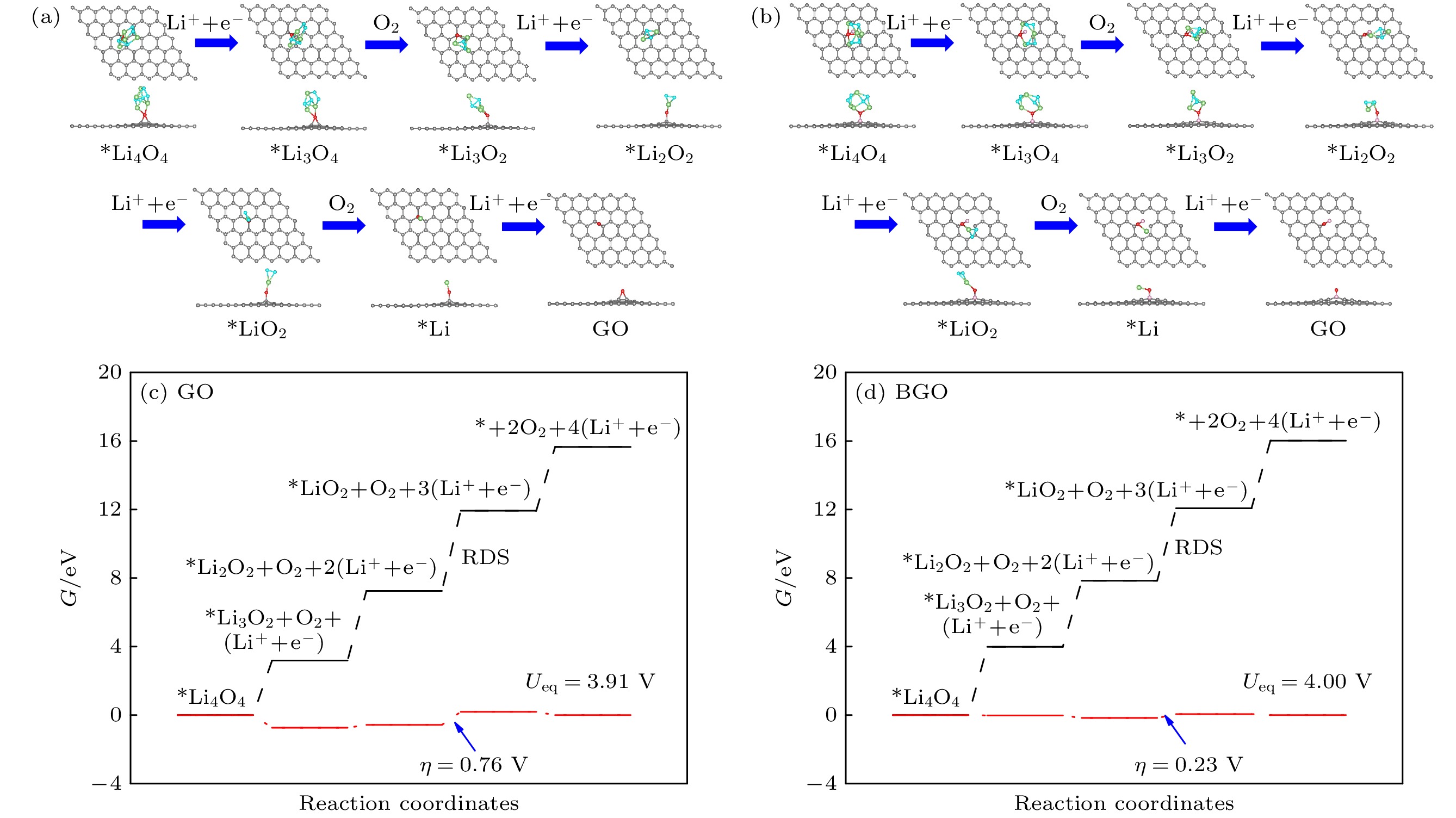 Lithium-oxygen batteries stand out among post-lithium-ion batteries due to their theoretically high energy density, while the sluggish reaction kinetics of lithium peroxide reduces the rate performance of the batteries. Therefore, improving the reaction kinetics of the lithium peroxide and then lowering the charge overpotential are of great importance for realizing reversible lithium-oxygen batteries with high energy density. In this work, the catalytic mechanism of graphene oxide (GO) and boron-doped graphene oxide (BGO) on the oxygen evolution reaction of (Li2O2)2cluster is investigated by first-principles calculations. The results show that the charge transfer from (Li2O2)2cluster to GO and from (Li2O2)2cluster to BGO are 0.59 e and 0.96 e, respectively, suggests that B doping improves the charge transfer from the discharged product to the cathode material. The Gibbs free energy of the 4-electron decomposition process shows that the (Li2O2)2cluster favors the Li-O2-Li decomposition pathway, and the rate-determining step for the reaction on both GO and BGO is the third step, that is, the removal of the third lithium. At the equilibrium potential, the charge overpotential of GO and BGO are 0.76 V and 0.23 V, respectively, showing that B doping greatly reduces the charging overpotential of lithium-oxygen batteries. Moreover, mechanistic analysis shows that B doping enhances the electronic conductance of GO and forms an electron-deficient active center, which facilitates charge transport in cathode and charge transfer from lithium peroxide to cathode materials, thereby reducing the charging overpotential of the lithium-oxygen batteries and improving its cycling performance. The B and O play a synergistic role in catalyzing the oxygen evolution reaction of (Li2O2)2clusters.