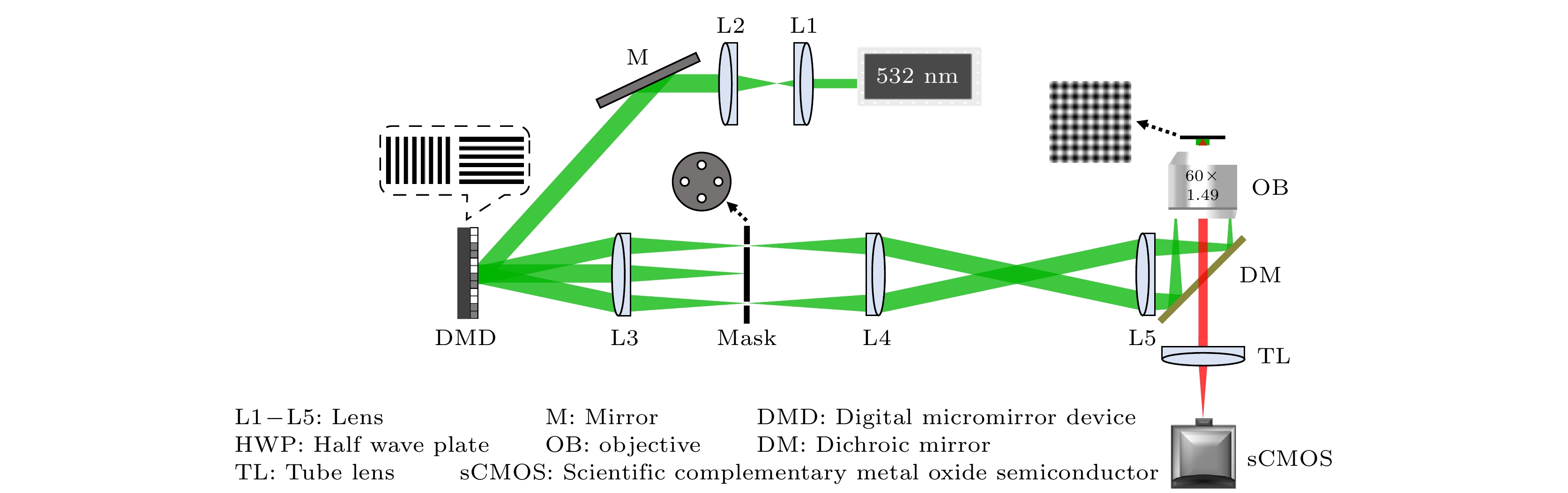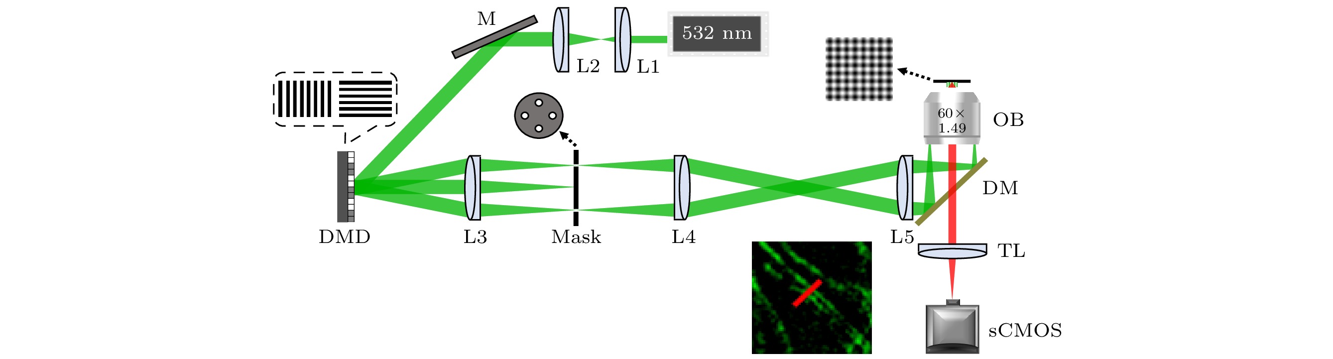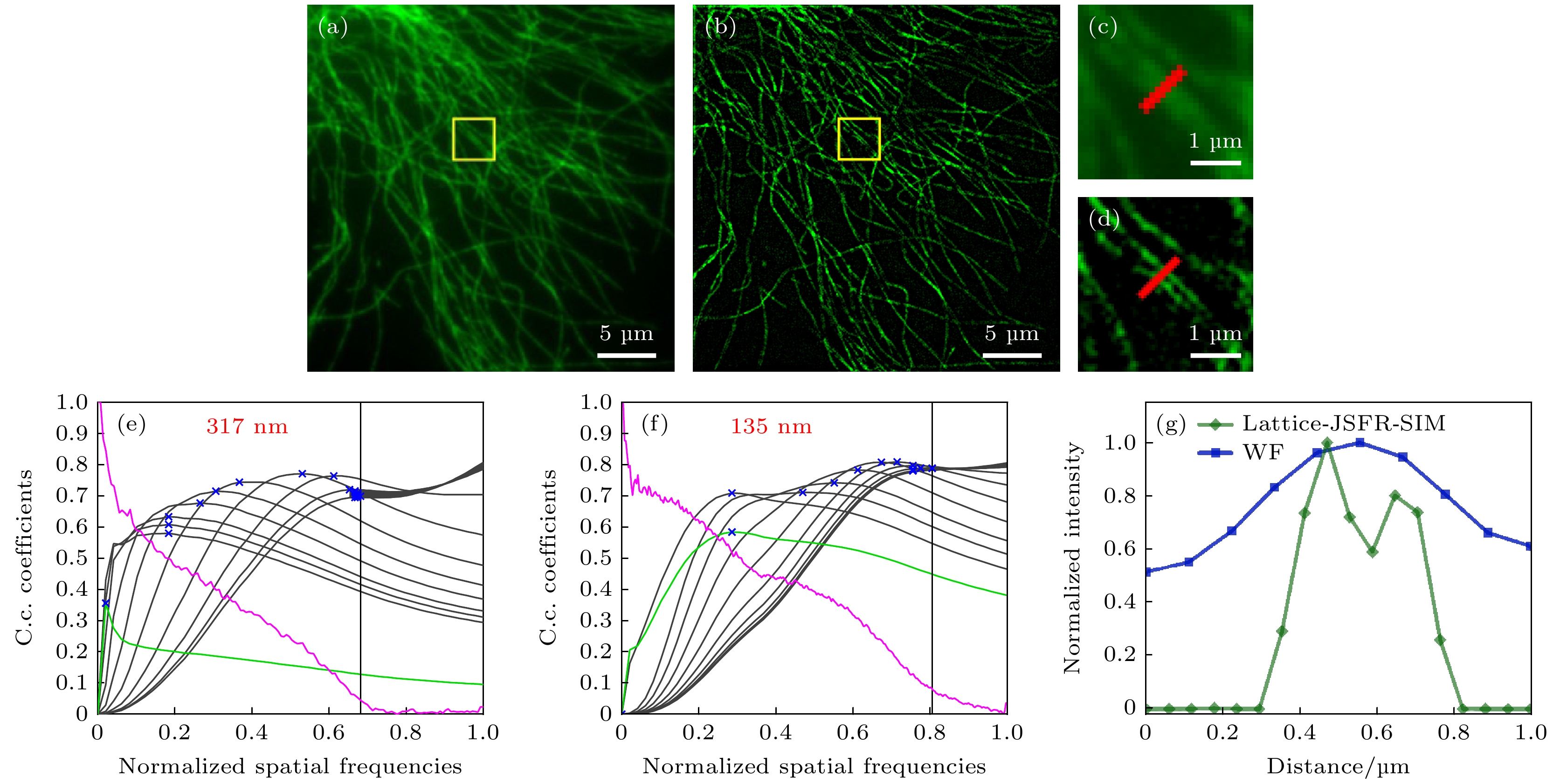Super-resolution structured illumination microscopy (SR-SIM) offers numerous advantages such as high temporal resolution, low photobleaching and phototoxicity, and no special requirements for fluorescent probes. It is particularly suitable for long-term SR imaging of living cells. By using two-dimensional lattice structured light serving as illumination, SR-SIM can achieve faster imaging speed and reduce phototoxicity, however, it is accompanied with system complexity increasing. To address this problem, in this work, we propose a fast SR lattice structured illumination microscopy imaging method based on a digital micromirror device (DMD), called DMD-Lattice-SIM. This method utilizes a DMD and synchronous time-sharing triggering with sCMOS to generate two-dimensional orthogonal lattice structured light. The proposed method only requires the collection of five phase-shifted raw images for SR image reconstruction, reducing the acquisition time by approximately 44.4% compared with the traditional SR-SIM method that requires nine phase-shifted raw images. In this work, we also introduce a rapid SR image reconstruction method called Lattice-JSFR-SIM, which combines the advantages of joint space and frequency reconstruction (JSFR)-SIM and Lattice-SIM. The raw images are pre-filtered in the frequency domain and then undergo SR reconstruction in the spatial domain. This approach reduces reconstruction time by approximately 55.6% compared with traditional frequency domain image reconstruction processing, within an imaging field of view of 512 pixels×512 pixels. The feasibility of the proposed method is demonstrated through experiments on cell microtubules and the observation of mitochondrial division and fusion in living cells. The findings presented in this paper hold great significance and application value for enabling real-time SR imaging of living cells.