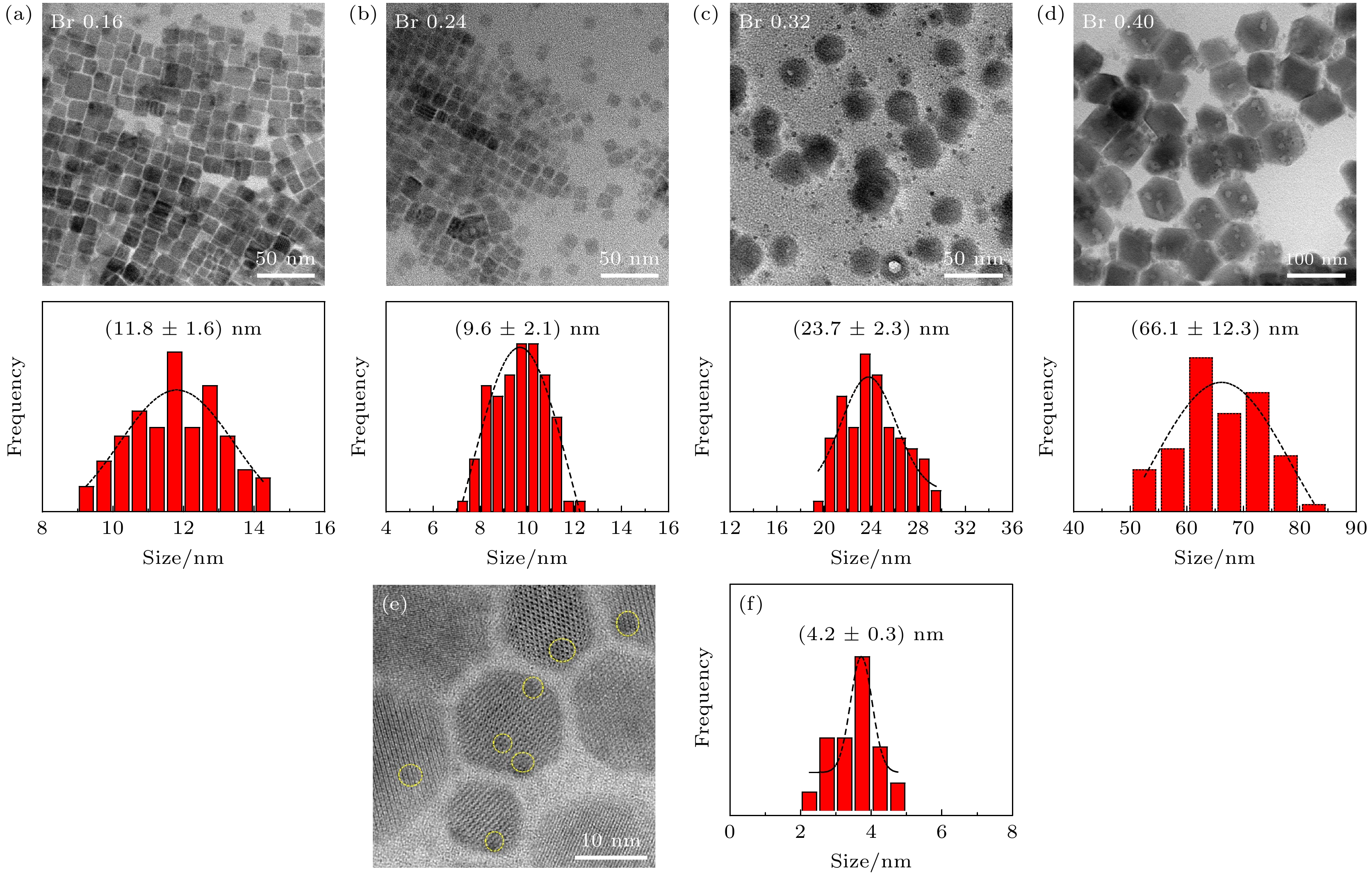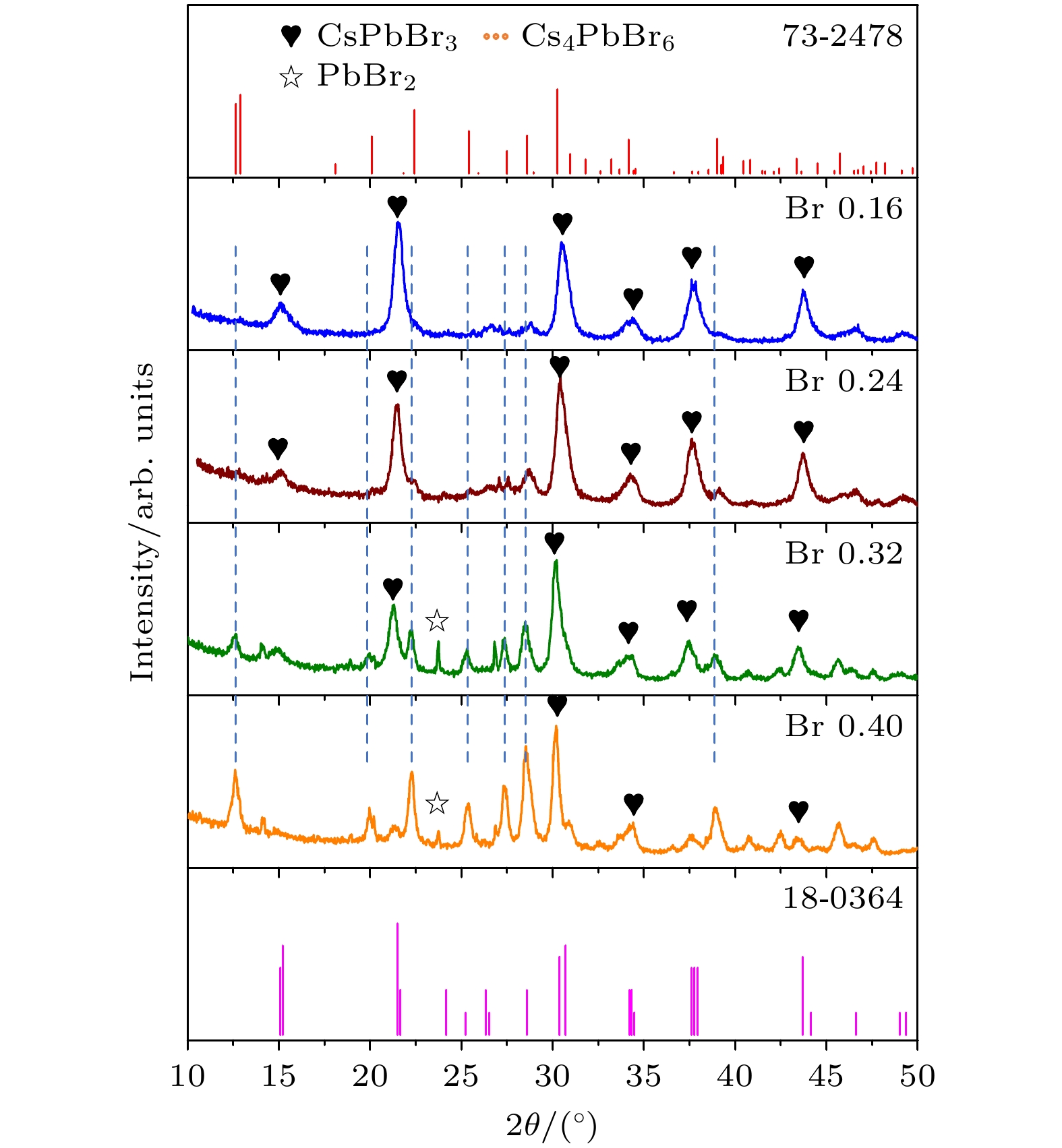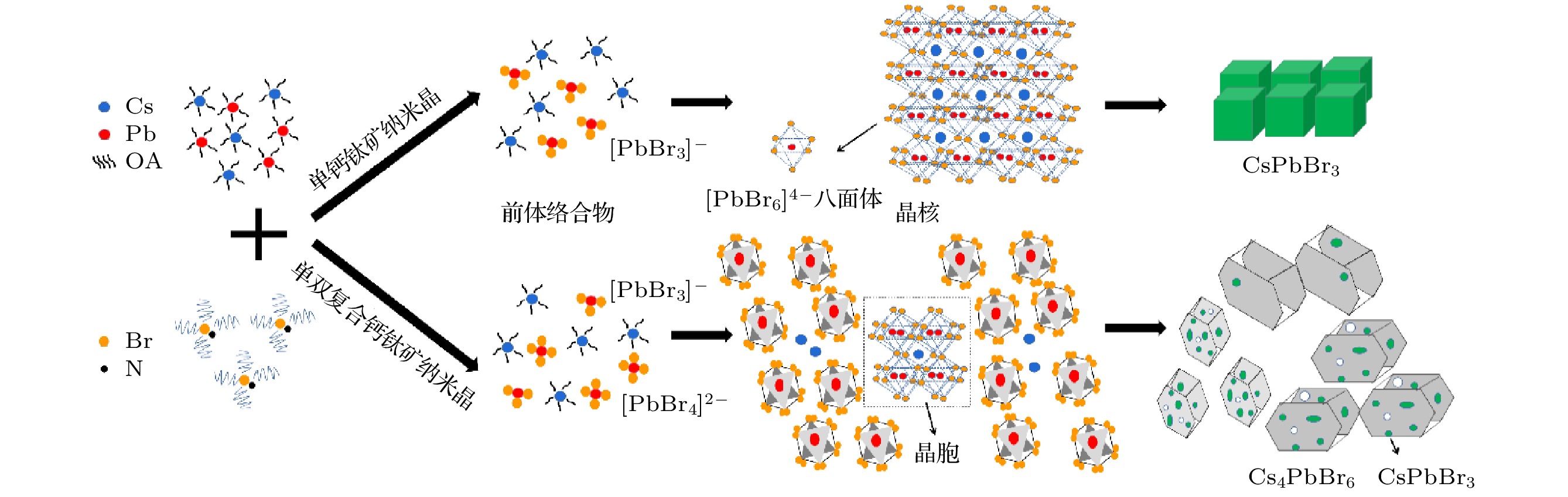 All-inorganic cesium lead halide perovskites have shown great potential applications in optoelectronic field due to their fascinating optical properties. Although perovskite materials have achieved great success in various fields, their inherent ionic properties and high dynamic surface properties have led to their poor stability, hindering their applications. The preparation of CsPbBr3-Cs4PbBr6nanocrystals has proven to be an effective strategy to enhance their photoluminescence properties and stability. Herein, we report an easy synthesis of CsPbBr3-Cs4PbBr6nanocrystals with a diphase structure at room temperature by using Cs-OA, Pb-OA and TOABr as precursors in toluene. It is found that the phase transformation and the relative composition between CsPbBr3and Cs4PbBr6are dependent on the concentration of TOABr and the ratio of Cs/Pb. Thein-situPL experiments reveal that the formation of ~12 nm CsPbBr3nanocubes experiences the fast nucleation, the focusing growth of size-distribution in early growth stage and Ostwald ripening growth in the later stage at a TOABr concentration of 0.16 mmol. With the increase of concentration of TOABr or molar ratio of Cs/Pb > 1 (Cs/Pb < 1), [PbBr4]2–complex and [PbBr3]–complex can coexist and compete with each other in toluene, and the CsPbBr3nucleations dominate in the early stage, then CsPbBr3-Cs4PbBr6nanocomposites are gradually formed on CsPbBr3nucleations as photoluminescence centers due to the continuous generation of [PbBr4]2–complex between TOABr and Pb2+. The relative composition of Cs4PbBr6in CsPbBr3-Cs4PbBr6nanocomposites can be improved from 4% to 85% with the concentration of TOABr increasing or Cs/Pb < 1. The optimized CsPbBr3-Cs4PbBr6composite nanocrystals possess high PLQY and stability. Our work provides an understanding of the mechanism of phase transformation in cesium lead halide perovskite materials.