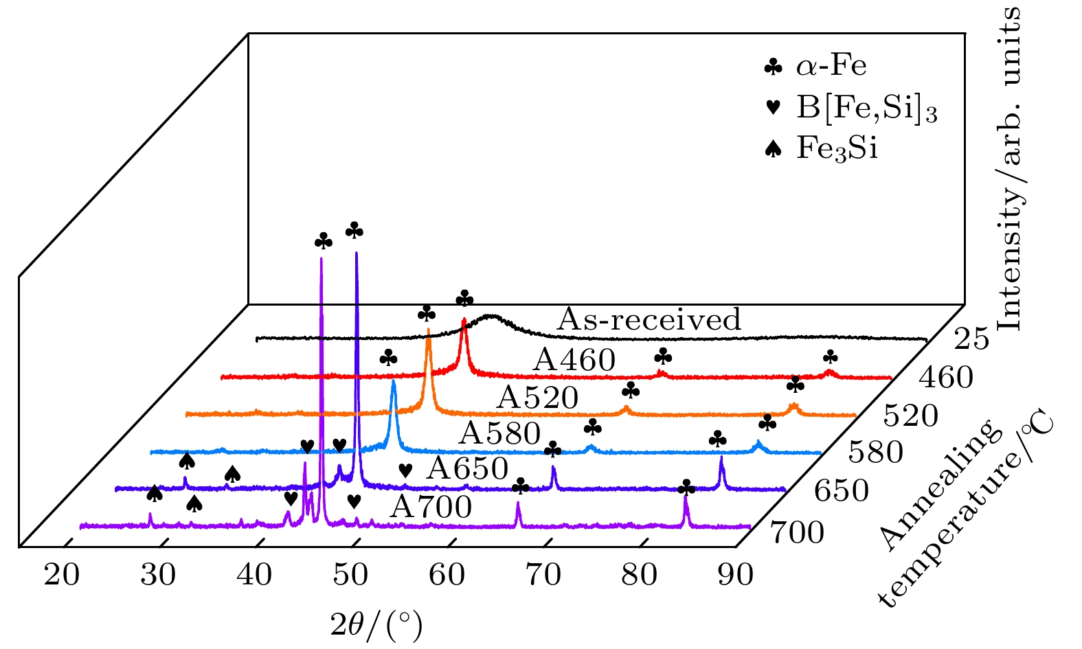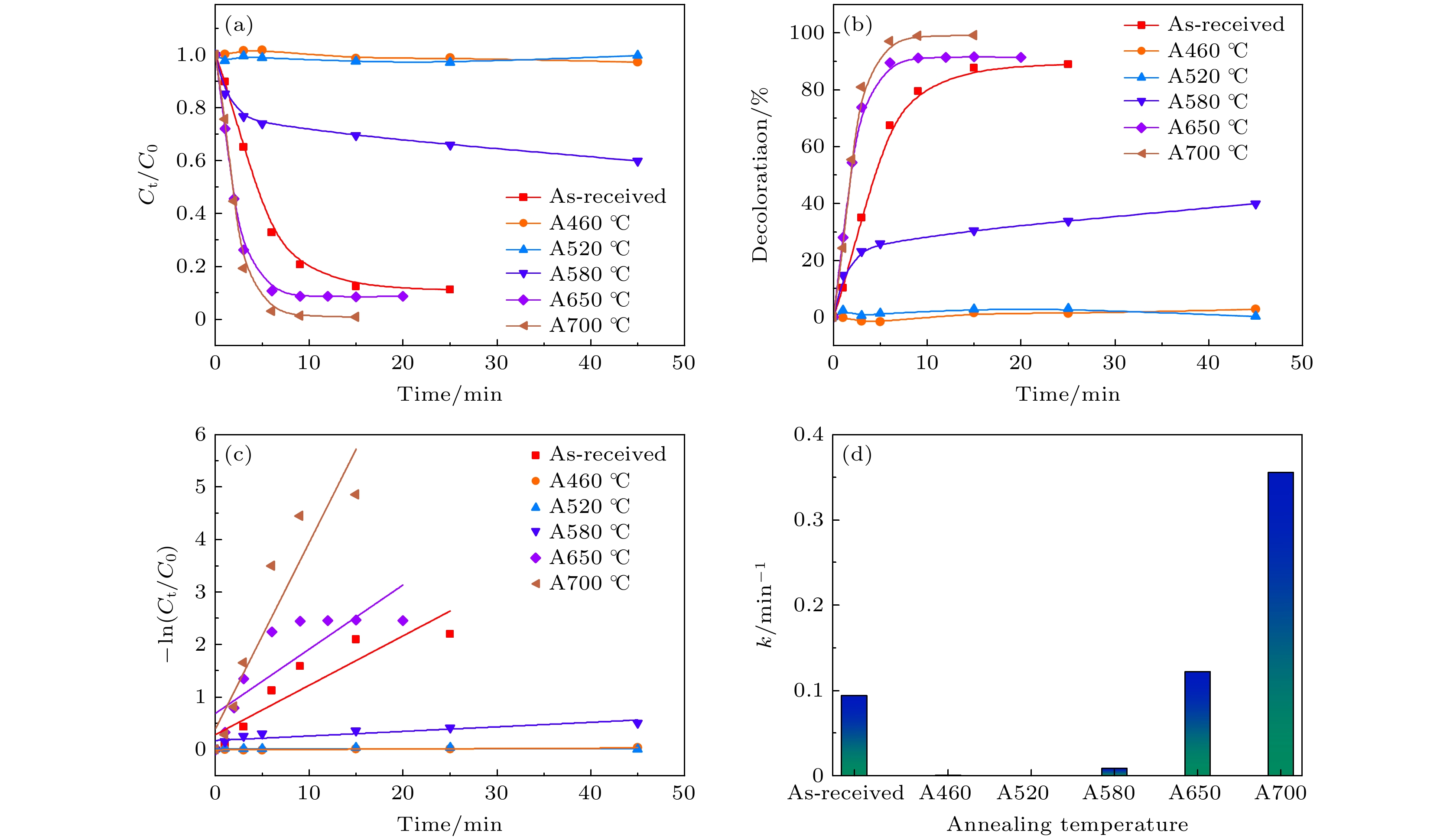 Amorphous alloys are meta-stable materials with long-range disordered atomic structure, which have excellent catalytic degradation performance and are also susceptible to crystallization, but the mechanism of the effect of crystallization on their catalytic properties has not been clarified. Therefore, the effect of the annealing crystallization process on the microstructure of Fe-Si-B-Cu-Nb industrial amorphous ribbons and their catalytic degradation properties for acid orange 7 are investigated in this work. It is found that the catalytic degradation performance of the ribbons decreases dramatically after having been annealed at 460–580 ℃ , and its reaction rate constant is less than 0.01 min–1. The main reason is the formation ofα-Fe precipitation phase in the ribbons after having been annealed at high temperatures and the destruction of the substable amorphous structure. These reduce the rate of hydroxyl radical formation. In contrast, the catalytic degradation performance of the 650–700 ℃ annealed ribbons increases significantly, which increases to 3.77 times the degradation rate of the as-cast ribbons. The decolorization rate of acid orange 7 by the annealed ribbons reaches 99.22% within 15 min, which is 1.12 times that of the as-cast ribbons. The improvement of the catalytic degradation performance is attributed to the primary cell effect between the crystalline phase and the metal compounds and the substitution reaction between the Cu-enriched clusters and zero-valent iron. In this study, the influence mechanism of annealing crystallization on the performance of Fe-Si-B-Cu-Nb industrial amorphous ribbons for degrading azo dyes is revealed, which provides theoretical and experimental support for using aged iron-based amorphous ribbons to purify printing and dyeing waste-water and achieve “purification of waste-water by using alloy waste”.
