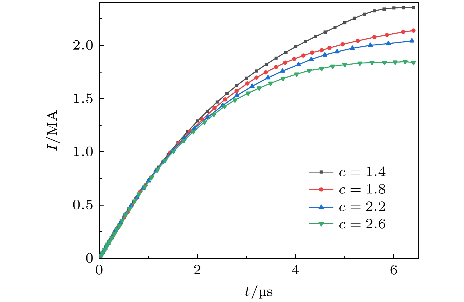 Dense plasma focus (DPF) device is a pulsed high current discharge device, which is widely used in particle accelerator, controlled nuclear fusion, space propulsion, and pulsed neutron source. However, existing models for DPF dynamics, including semi-empirical snowplow approximations and particle-in-cell (PIC) methods, face limitations in balancing computational efficiency and comprehensive physical descriptions. In contrast, magnetohydrodynamic (MHD) models can comprehensively analyze the macroscopic phenomena (e.g. sheath motion, current distribution, fluid instabilities) and the influence of parameters (e.g. electrode geometry, gas pressure, and driving current waveforms) on DPF performance. Although MHD cannot self-consistently resolve kinetic behaviors like high-energy particle beams or neutron production during pinch phases, it remains highly valuable for investigating macroscopic DPF physics when quantitative neutron yield analysis is unnecessary. Therefore, a two-temperature MHD model coupled with an external RLC circuit is developed in this paper, which combines electron-ion thermal nonequilibrium, resistive effects, and plasma transport coefficients derived from Braginskii formulations. The model is rigorously validated based on experimental data from two benchmark DPF devices (UNU and UDMPF1), demonstrating high consistency in current waveform, voltage profile, and radial implosion trajectory. The research shows that the DPF plasma sheath is continuously accelerated along the axial direction under the action of the Lorentz force. When it moves to the end of the inner electrode, due to Z-pinch effect, the plasma sheath bends radially inward and is further compressed onto the axis of symmetry, finally forming a high-temperature and high-density plasma region in front of the inner electrode end, the so-called plasma focus. For the UNU device, simulations reveal distinct plasma evolution phases. One is the axial acceleration (0–2.5 μs), where the current sheath reaches a speed of up to 90 km/s under the dominance of Lorentz force, with ion temperatures rising from 1 eV to 100 eV, and the other is the radial implosion (2.78–2.90 μs), during which plasma density increases by an order of magnitude (reaching to ~1024 m–3) and ion temperature surges to ~1 keV through magnetically driven compression. Further studies also find that for large DPF devices, with the inductance reduced and the capacitance increased, the circuit current is easily saturated. However, increasing the circuit voltage has a more significant effect on the increase of current. This paper shows that for large DPF devices, the ratio of anode radius to cathode radius needs to be as small as possible, which can increase the peak current and pinch current of DPF while keeping other parameters unchanged.