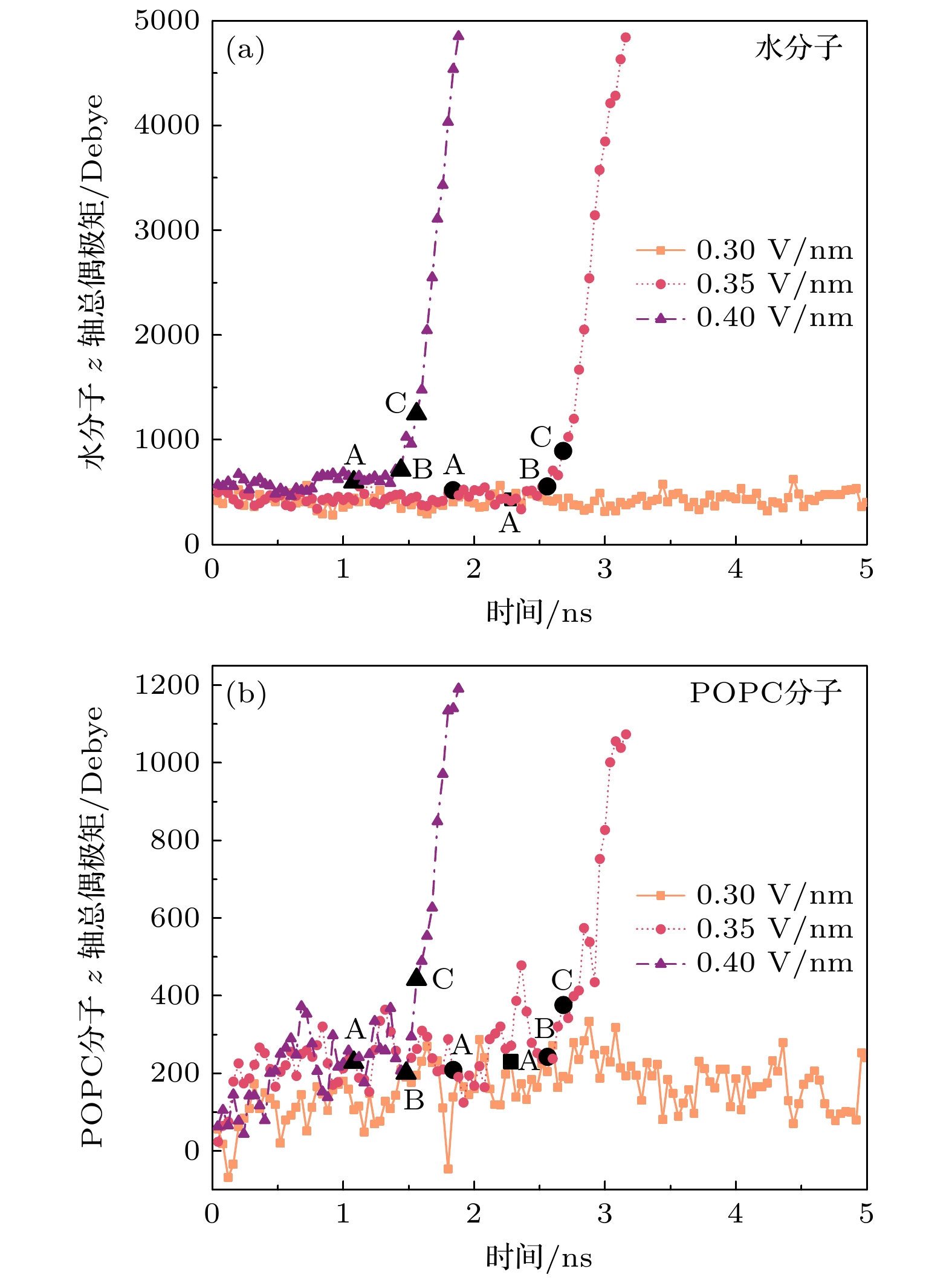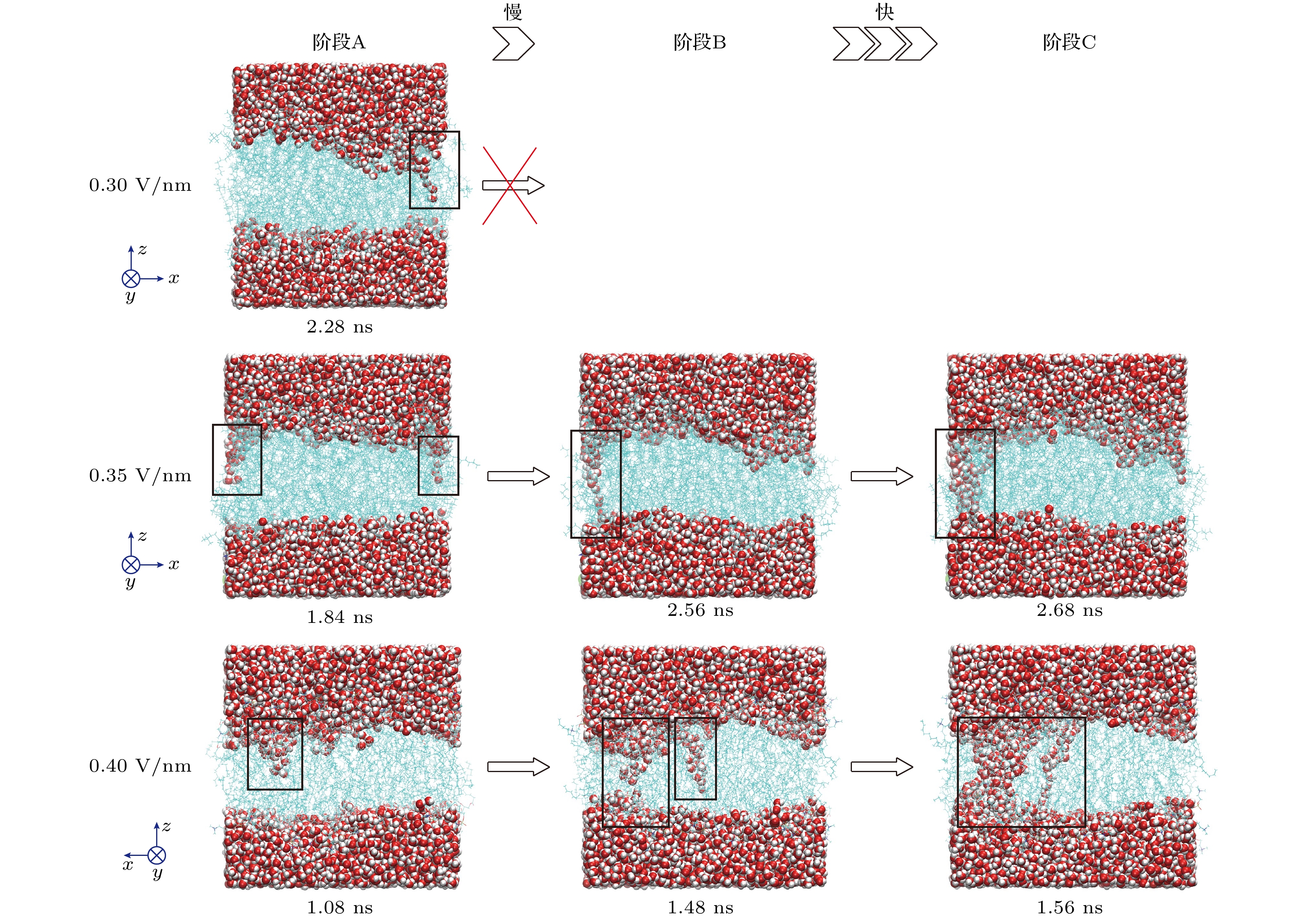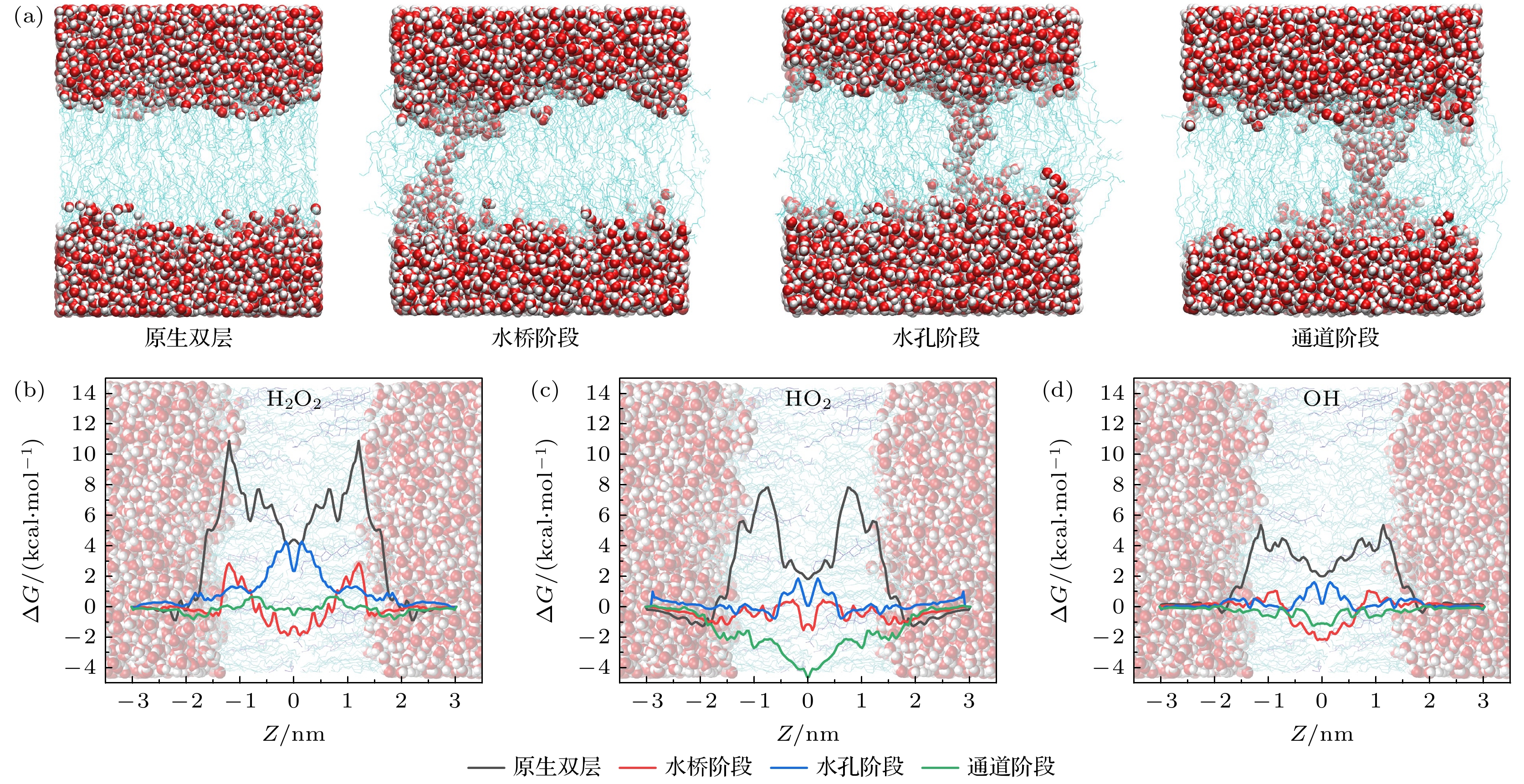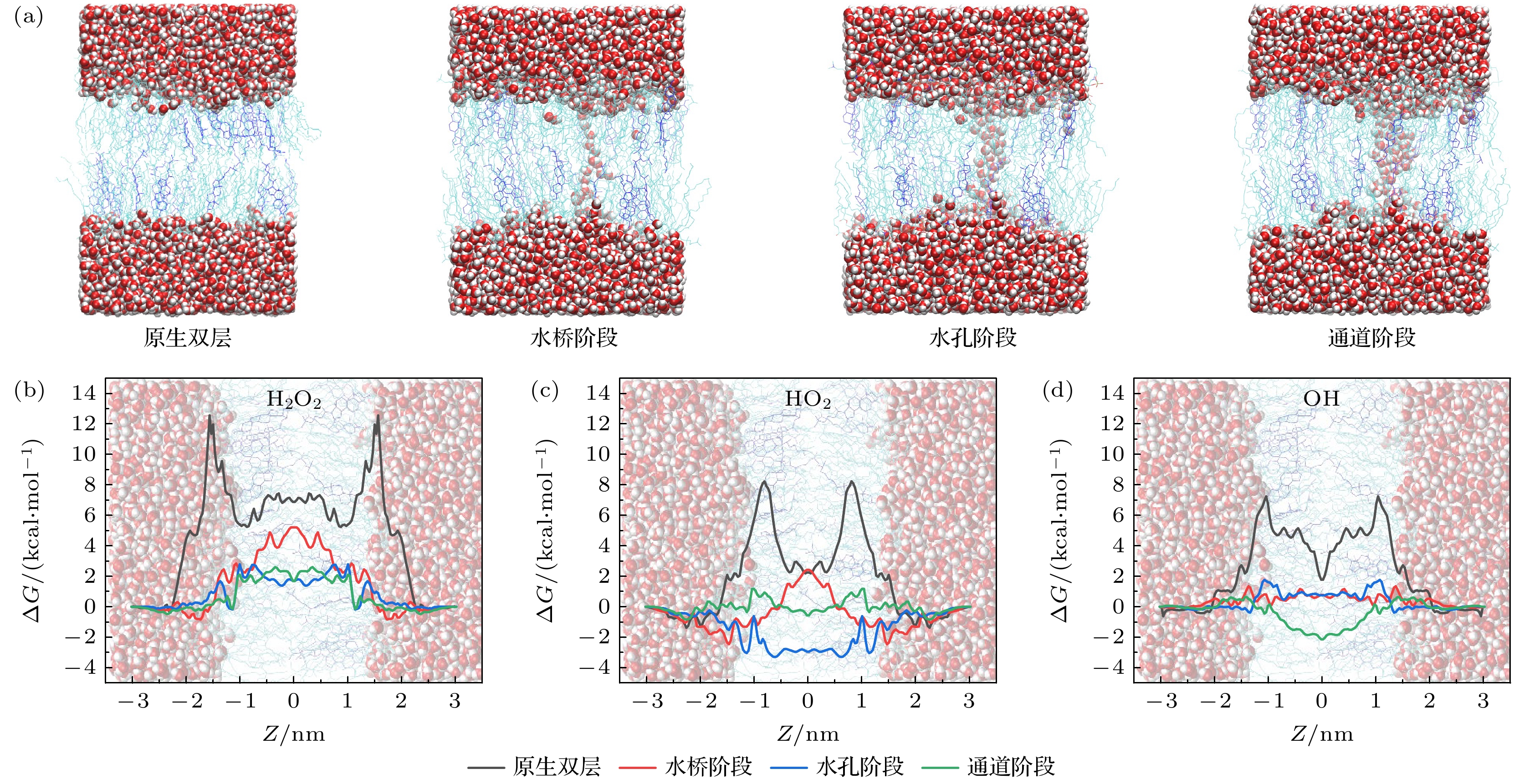Cold atmospheric plasma (CAP) is considered to be a highly promising cancer treatment method, due to its “selective” anti-cancer effect. However, the physical theoretical explanation about this effect and the microscopic interactive mechanisms between CAP and tumors are still lacking. In this work, the CAP-induced electric field-caused electroporation (EP) processes of the cell membrane are modeled based on molecular dynamics. Additionally, the umbrella sampling method is utilized to compute the free energy profile of the intracellular permeation processes of the reactive oxygen species (ROS) through EP-formed pore-like structures at different EP stages. Comparative results are shown as follows. 1) Cancer cell membranes with lower cholesterol components show lower EP-generation threshold and faster EP-formation, and 2) lower free-energy barrier and earlier occurrence of free-energy barrier reduction are shown in all EP stages in cancer cell membrane. The above results explain the difference between cancer cells and normal cells when affected by CAP. Our work delves into the formation of CAP-induced EP and the transport of ROS through EP-formed pore-like structures, which contributes to a better understanding of the microscopic mechanisms of the “selective” anti-cancer effect of CAP, and provides important references for developing CAP-based cancer treatment methods, and devices, thereby facilitating the translation of CAP into clinical applications.