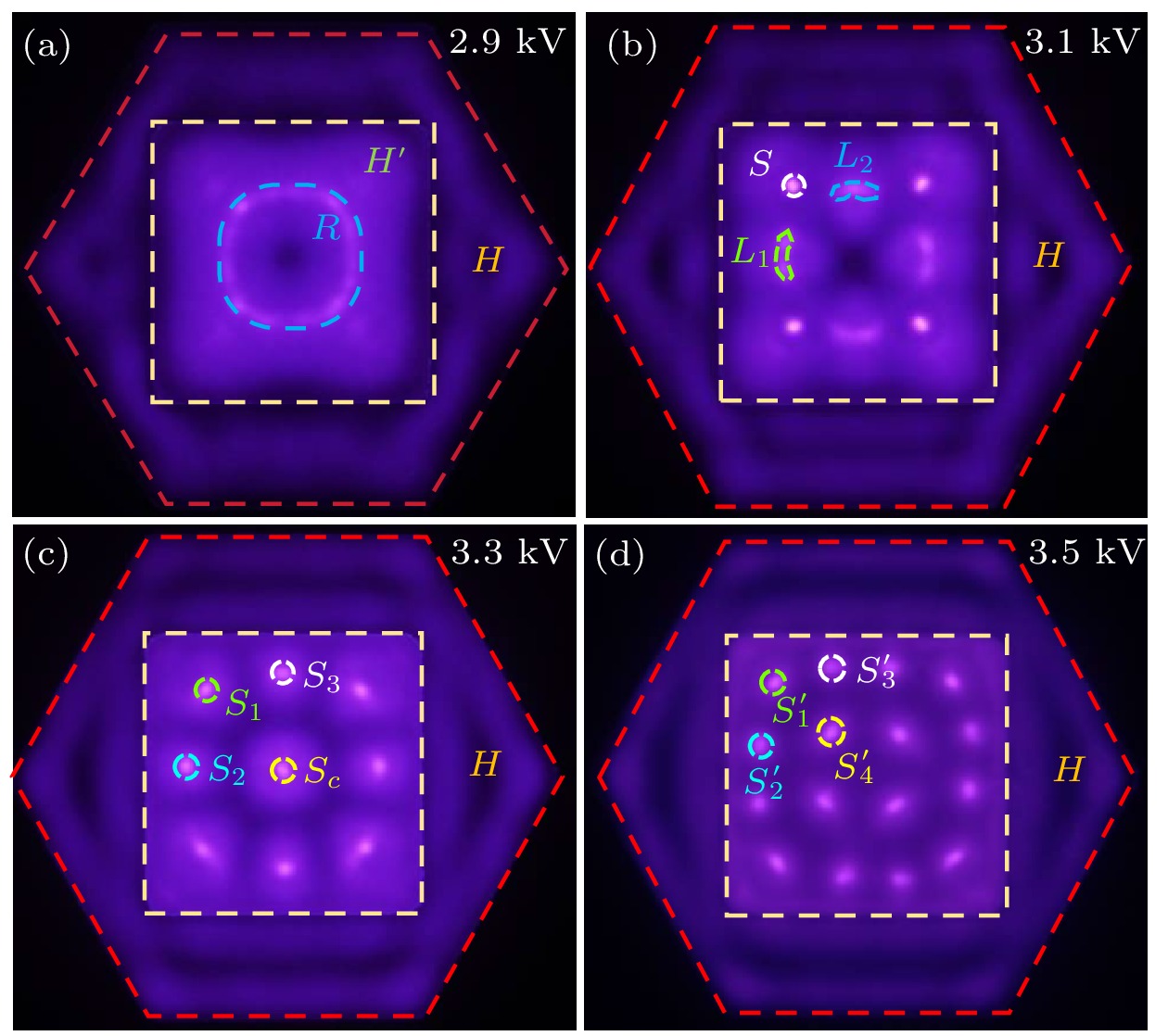 Pattern discharge is a common mode in dielectric barrier discharge (DBD) and has broad application prospects in various industrial fields, such as material surface treatment, environmental monitoring, and biomedical applications. In this work, a mixed gas of 75% argon and 25% air is used to generate a pattern discharge. A double-gap boundary composed of hexagonal configuration and square configuration is employed, and the gas pressure is fixed at 20 kPa. By varying the applied voltage amplitude, single-ring pattern, square-point-line pattern, square lattice pattern, and annular-lattice pattern are obtained for the first time. The discharge characteristics and their temporal correlation are studied using both optical method and electrical method. The results show that the discharge patterns exhibit multiple discharges in each half of the voltage cycle, and these discharges are temporally correlated with each other. Time-resolved discharge images of the square lattice pattern are captured using an enhanced charge-coupled device (ICCD). The experimental results reveal that multiple discharges in a half-voltage cycle correspond to the ignition process of the pattern in the radial direction from the outside to the inside. The morphology of the square lattice pattern observed by the naked eye is actually the result of the temporal superposition of luminescence from points at different positions in the evolution process. The formation mechanism of this pattern is analyzed through electric field simulations and theoretical calculations. Plasma parameters are diagnosed by collecting the emission spectrum of the square dot-lattice pattern. The results show that the electron density gradually decreases radially from the outer region to the inner region, while the electron temperature and molecular vibrational temperature increase radially from the outer region to the inner region, and the molecular rotational temperature remains almost unchanged. The temporal evolution of the square lattice pattern is shown in the following figures, where the current waveform marks the timing of each frame of ICCD imaging for the complete square lattice pattern.