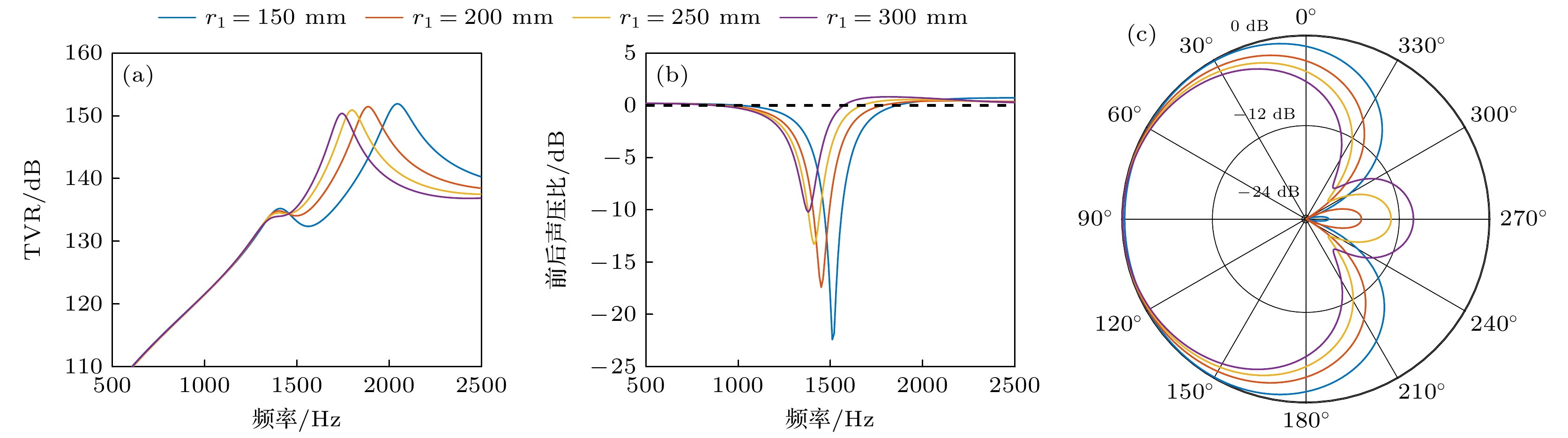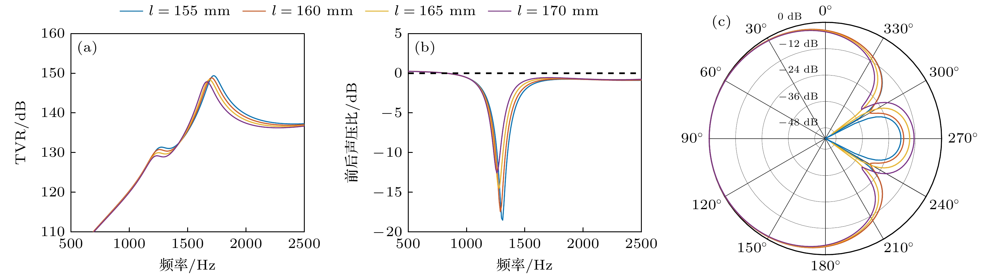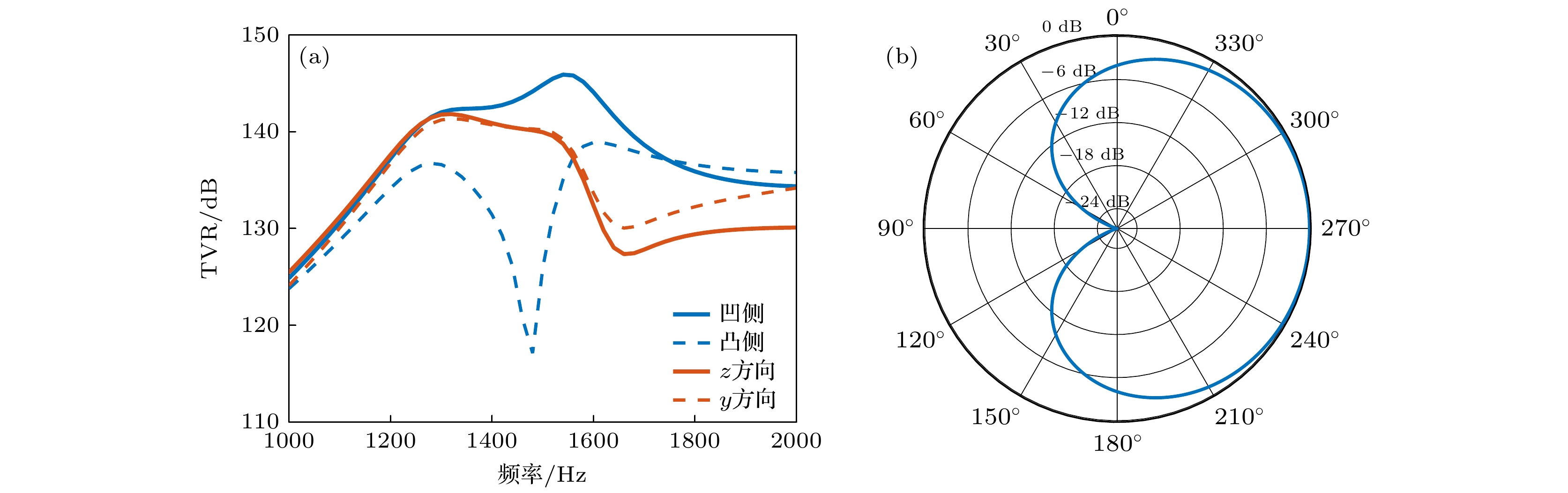 The dimensions of flextensional transducers are much smaller than the wavelength, thereby hindering the generation of directional beams by compact underwater acoustic transducers. To address the complexities of amplitude and phase modulation in circuit-driven traditional directional flextensional transducers, a directional flextensional transducer structure is proposed in this work. By implementing an asymmetric composite shell configuration combining concave and convex curved beams, the low-frequency directional radiation is achieved while simplifying peripheral driving circuits, thereby improving the operational convenience and cost-effectiveness. Through an analysis of the vibration characteristics and radiation mechanisms, this study elucidates the principle of directional generation. The concave and convex beams of the flextensional transducer exhibit an intrinsic operational characteristic of opposite-phase normal displacement in their vibration modes. By adjusting structural parameters, the amplitude output from the two beams under a single actuator drive can satisfy a specific differential relationship, effectively resulting in the modal superposition of a monopole and a dipole, thereby achieving directional radiation. By using a Lorentzian resonance fitting function and a linear fitting function, the relationship between the frequency-dependent amplitude ratio and phase difference of sound pressure for the concave and convex beams is established, forming an unequal amplitude, unequal phase dual-spherical source radiation model for the transducer, thereby providing a theoretical framework for controlling the directivity of the transducer. Through numerical simulations, the effects of the transducer sidewall parameters, as well as the thicknesses and curvature radii of the concave and convex beams, on the transducer’s resonance frequency, transmitting voltage response, front-to-back sound pressure ratio, and directivity are analyzed. Sensitivity ranking of the structural parameters is also presented. Finally, the optimization of transducer’s performance is discussed and compared with that in other existing research, showing the advantages of this design. Specifically, the transducer achieves a maximum transmitting voltage response of 145.9 dB within the operating frequency band from 1240 Hz to 1660 Hz. Under single-circuit drive, a cardioid-shaped directional beam with a maximum front-to-back sound pressure ratio of 27 dB is produced. Furthermore, the shear stress on the active material is significantly reduced, effectively preventing fatigue failure of the active material during high-power emission. This provides a more convenient method for achieving low-frequency underwater acoustic directional emission.