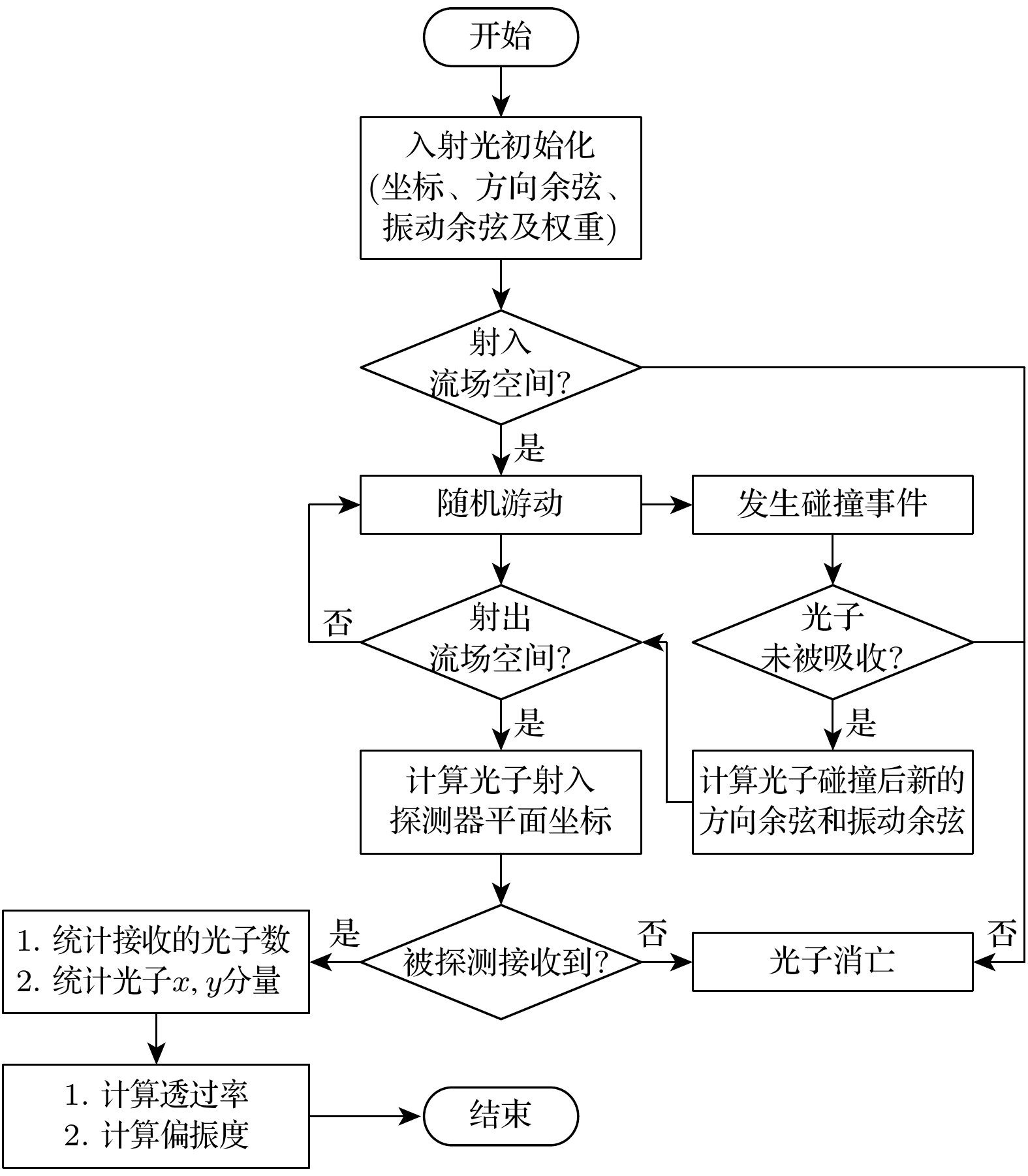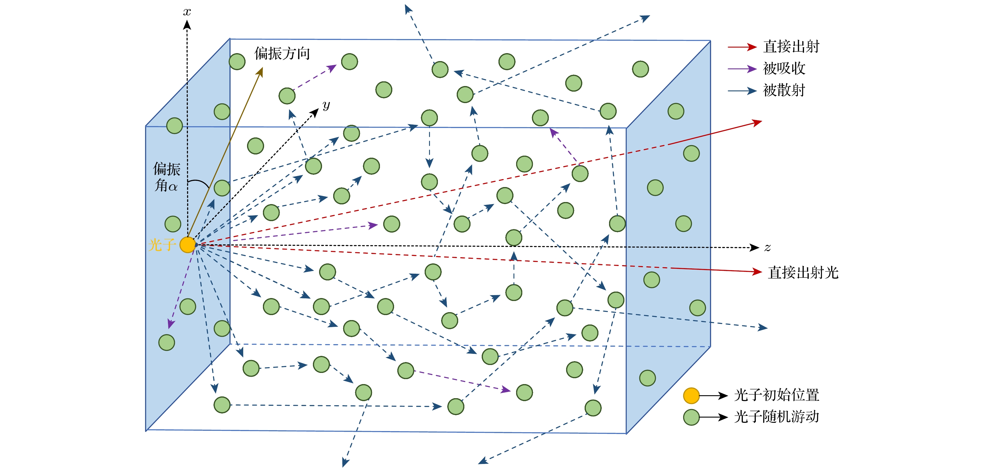 Infrared polarization radiation of aircraft targets after being transmitted through high-temperature exhaust plumes is an important basis for infrared detection equipment to detect, identify, track and warn aircraft. At present, most of the studies on the transmission characteristics of gas polarized radiation focus on the visible wavelength band, and the research object is mainly the atmospheric environment. The study of infrared polarization radiation transmission characteristics in the special gas environment of high-temperature exhaust plume is still insufficient. In this paper, the Monte Carlo method is used to model the transmission of infrared polarized light in a high-temperature exhaust plume, and the absorption coefficients of H2O in 2.5−3.3 μm band and CO2 in 4−5 μm band are calculated using the HITRAN database. The multiple scattering process of photons in the exhaust plume space is simulated, and the changes of the cosine of motion direction and cosine of vibration direction of the photons in the collision events are analyzed at the microscopic level. Additionally, the photon characteristics are statistically analyzed based on the principles of calculating polarization and transmittance. Based on the simulation results, the changes of radiative transmittance and polarization at different transmission distances are compared with each other, and the effects of exhaust plume temperature, pressure, gas component concentration, and detection wavelength on the transmission characteristics of infrared polarized light are analyzed as well. The experimental results demonstrate that the error between the calculated radiative transmittance in this study and the HITRAN database is within 2%. The effects of temperature and pressure on the transmission characteristics of polarized light become increasingly significant as the distance increases. The pressure is negatively correlated with transmittance and polarization, while the effect of temperature is related to the gas type and the temperature range. The radiant transmittance and polarization degree decay exponentially with the absorption coefficient and transmission distance of the gas in the exhaust plume space. Different detection wavelengths also lead to differences in the transmission characteristics of polarized light.