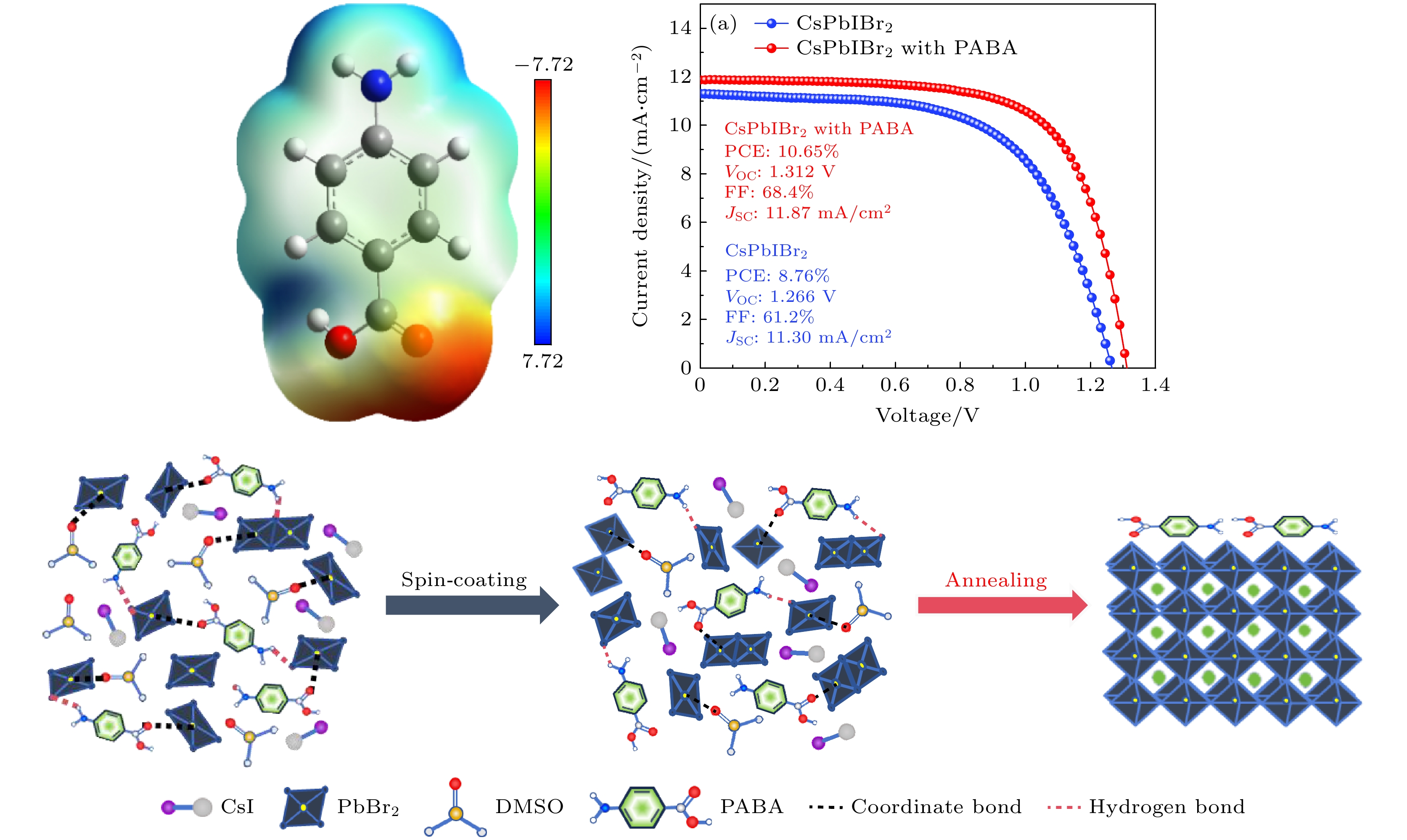 Inorganic CsPbIBr2 perovskite features high phase stability and light absorption coefficient, making it suitable for the development of perovskite tandem cells or semi-transparent cells. High-quality CsPbIBr2 perovskite films are of crucial importance for fabricating efficient solar cells. However, compared with CsPbI3 and CsPbI2Br, the CsPbIBr2 precursor has poor crystallinity and low film coverage, which is prone to generating pinholes and defects. Therefore, serious charge recombination often occurs inside the devices. To solve this problem, p-aminobenzoic acid (PABA) is added to the CsPbIBr2 precursor to regulate its crystallization dynamics in this work. Electrostatic potential distribution of PABA shows that the electron-rich regions (negative charge regions) are mainly located near the C=O. Fourier transform infrared spectrum indicates the existence of coordination interaction between C=O and Pb²+ and the formation of hydrogen bonds between —NH2 and halide anions. Ultraviolet-visible absorption (UV-Vis) spectrum and X-ray diffraction (XRD) spectrum demonstrate that a new intermediate phase, PABA·Pb···Br(I), is formed between PABA molecules and the components of CsPbIBr2 precursor. The formation of this intermediate phase slows down the crystallization rate of the perovskite, regulates the grain growth, and enables the preparation of dense perovskite films. XRD, UV-Vis, space charge limited current, and linear sweep voltammetry are used to characterize the film quality. After the addition of PABA, the film quality of CsPbIBr2 perovskite is improved. Thus, the light absorption is enhanced. The defect density is reduced. And the conductivity is increased. The efficiency of the champion cell increases to 10.65% compared with that of the control cell (8.76%). Further, dark current-voltage curves, Mott-Schottky curves, electrochemical impedance spectra, and photoluminescence spectra are utilized to analyze the reasons for the improved photovoltaic performance. After the addition of PABA, the CsPbIBr2 device exhibits reduced leakage current, enhanced built-in electric field, suppressed charge recombination, and improved charge extraction at the interface. In addition to the enhancement in photovoltaic efficiency, the PABA-regulated perovskite cells also exhibit high stability. After being stored in air for 1500 h, the average efficiency of the unencapsulated cells remains 80% of the initial value.