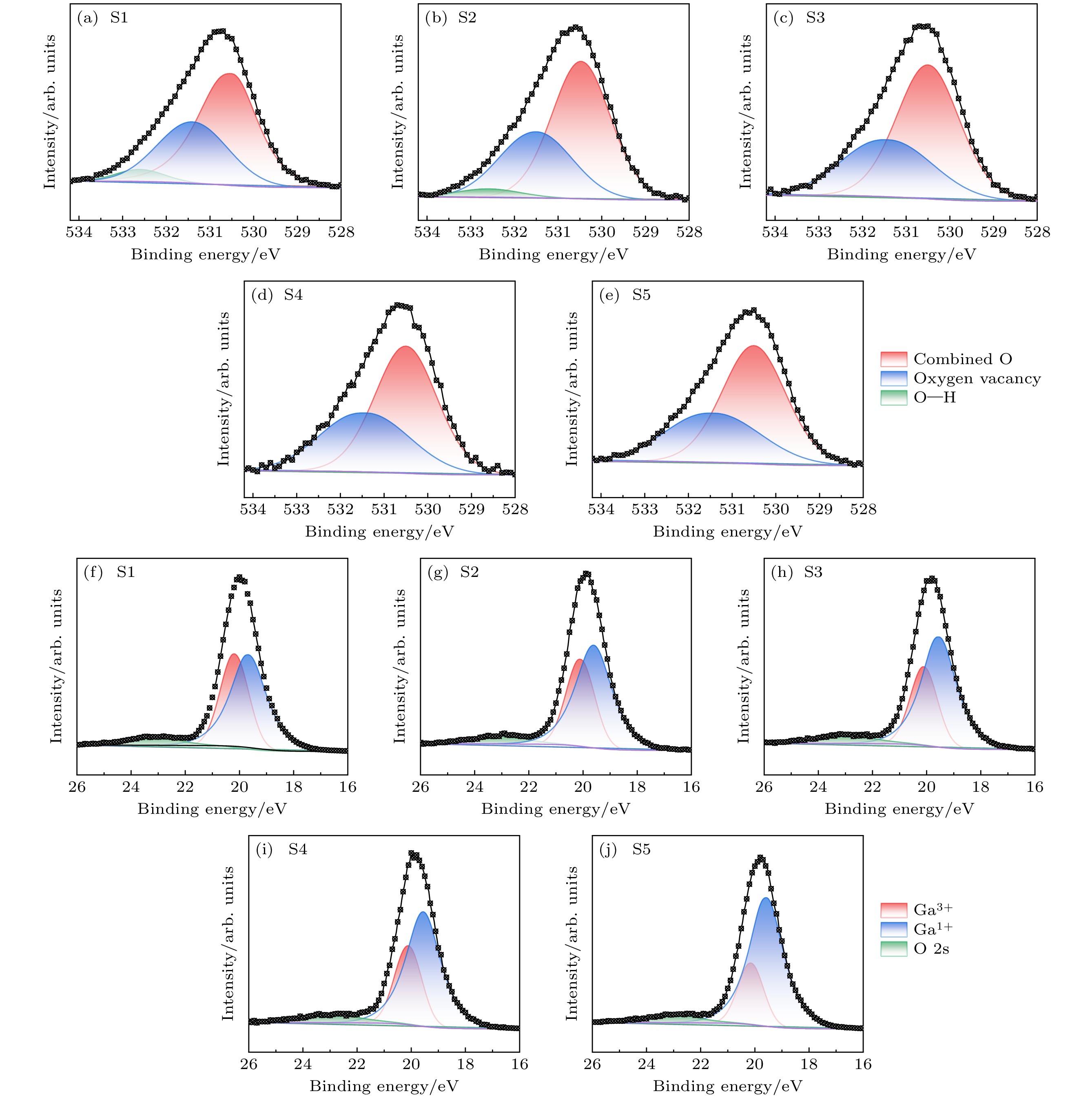 Amorphous gallium oxide (a-GaOx) exhibits excellent electrical conductivity, a wide bandgap, high breakdown field strength, high visible light transmittance, high sensitivity to specific ultraviolet wavelengths, low preparation temperatures, relatively simple processing, wide substrate applicability, and ease of obtaining high-quality thin films. These attributes make it a suitable candidate for applications in transparent electronic devices, ultraviolet detectors, high-power devices, and gas sensors. Presently, the research on a-GaOx remains limited, focusing primarily on films with an O/Ga ratio less than or equal to 1.5. Increasing the concentration of oxygen vacancies to enhance the conductivity of the material often leads to a reduction in its bandgap, which is undesirable for high-power applications. Variations in O/Ga in the films can affect the formation of chemical bonds and significantly influence the band structure. In this study, five groups of a-GaOx thin films with high oxygen-to-gallium ratios are successfully fabricated by increasing the gas flow rate at low sputtering power. The elemental compositions of the films are analyzed using energy dispersive spectroscopy (EDS), revealing the O/Ga ratio gradually decreasing from 3.89 to 3.39. Phase analysis by using X-ray diffraction (XRD) confirms the amorphous nature of the films. Optical properties are characterized using an ultraviolet-visible spectrophotometer (UV-Vis), indicating that the optical bandgap and the density of localized states gradually increase. X-ray photoelectron spectroscopy (XPS) is utilized to analyze the elemental compositions, chemical states, and valence band structures of the films, showing that the valence band maximum decreases and the content of Ga2O within the material increases. Subsequently, Au/a-GaOx/Ti/Au Schottky devices are fabricated under the same processing conditions. The I-V characteristics of these devices are measured using a Keithley 4200, revealing changes in the electron transport mechanism at the metal-semiconductor (MS) interface, with the gradual increase in electron affinity calculated. C-V characteristics are measured using a Keithley 590, and the donor concentration (density of localized states) at the interface is calculated to gradually increase. In summary, by controlling appropriate process parameters, it is possible to improve the conductivity of electronic devices while increasing the bandgap of a-GaOx, which is significant for high-power applications.