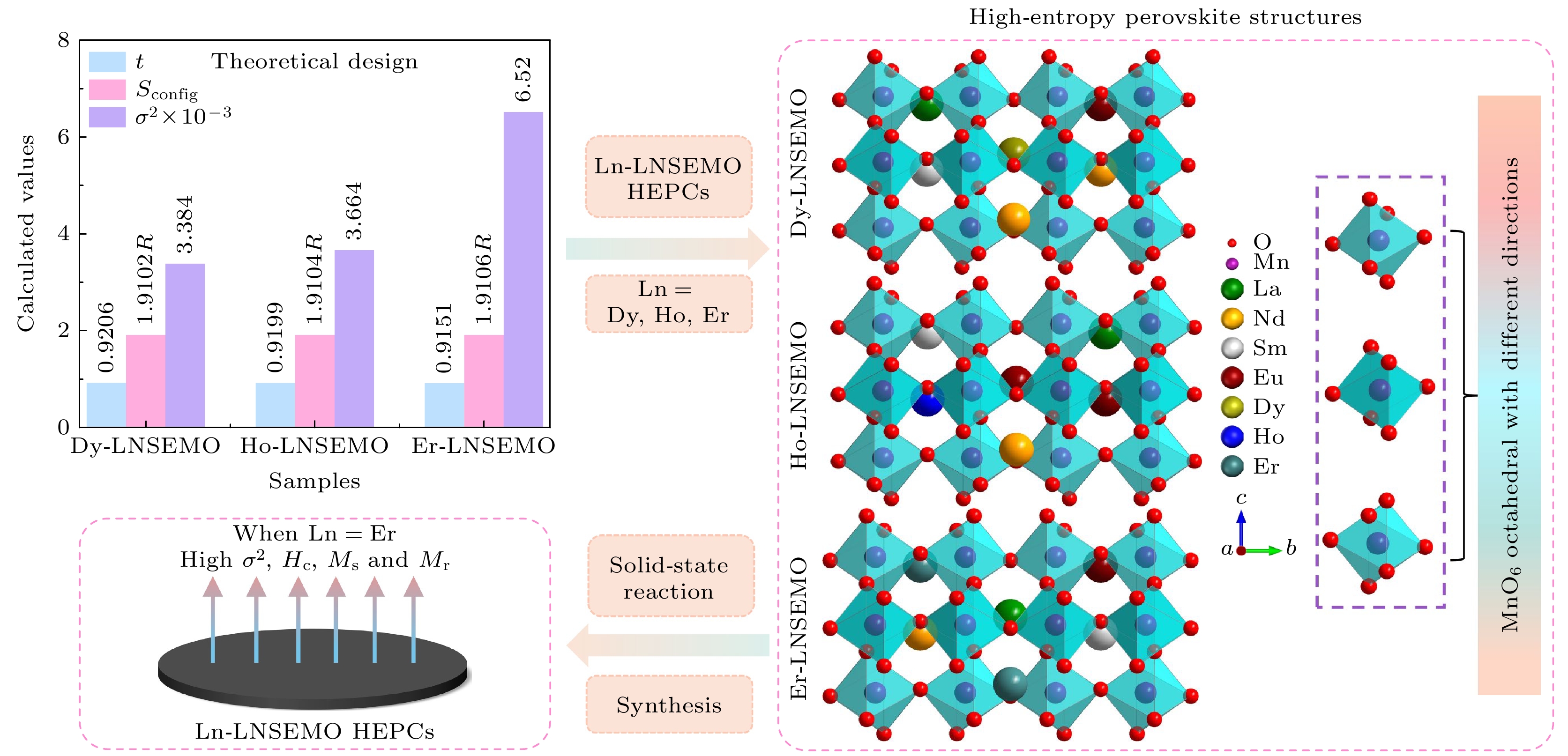 Equimolar ratio high-entropy perovskite ceramics (HEPCs) have attracted much attention due to their excellent magnetization intensity. To further enhance their magnetization intensities, (Ln0.2La0.2Nd0.2Sm0.2Eu0.2)MnO3 (Ln = Dy, Ho and Er, labeled as Ln-LNSEMO) HEPCs are designed based on the configuration entropy Sconfig, tolerance factor t, and mismatch degree σ2. Single-phase HEPCs are synthesized by the solid-phase method in this work, in which the effects of the heavy rare-earth elements Dy, Ho and Er on the structure and magnetic properties of Ln-LNSEMO are systematically studied. The results show that all Ln-LNSEMO HEPCs exhibit high crystallinity and maintain excellent structural stability after sintering at 1250 ℃ for 16 h. Ln-LNSEMO HEPCs exhibit significant lattice distortion effects, with smooth surface morphology, clearly distinguishable grain boundaries, and irregular polygonal shapes. In the present work, the influences of A-site average ion radius, grain size and lattice distortion on the magnetic interactions of Ln-LNSEMO HEPCs are investigated. The three high-entropy ceramic samples exhibit hysteresis behavior at T = 5 K, with the Curie temperature TC decreasing as the radius of the introduced rare-earth ions decreases, while the saturation magnetization and coercivity increase accordingly. When the average ionic radius of A-site decreases, the interaction between their valence electrons and local electrons in the crystal increases, thereby enhancing the conversion of electrons to oriented magnetic moments under an external magnetic field. Thus, Er-LNSEMO HEPC shows a higher saturation magnetization strength (42.8 emu/g) and coercivity (2.09 kOe) than the other samples, which is attributed to the strong magnetic crystal anisotropy, larger lattice distortion σ2 (6.52×10–3), smaller average grain size (440.49 ± 22.02 nm), unit cell volume (229.432 Å3) and A-site average ion radius (1.24 Å) of its magnet. The Er-LNSEMO HEPC has potential applications in magnetic recording materials.