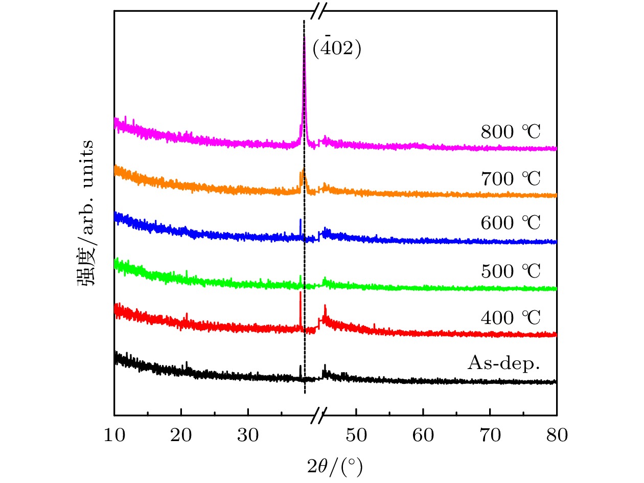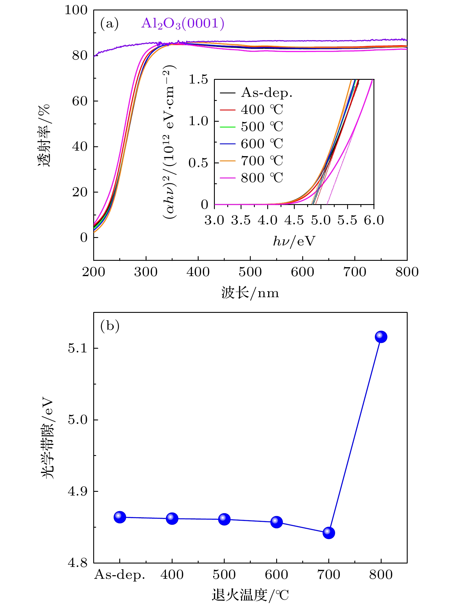 In this study, Sn-doped Ga2O3 thin films are prepared on sapphire substrate by radio frequency magnetron sputtering at ambient temperature, and then annealed at different temperatures (400–800 ℃) in nitrogen atmosphere. The corresponding metal-semiconductor-metal (MSM) solar blind photodetectors (PDs) are prepared based on those films before and after annealing to explore the influence of annealing temperature on the characteristics of the films and device properties. The results show that the as-deposited Sn-doped Ga2O3 film displays amorphous structure. With the increase of annealing temperature, the proportion of OL, Ga3+ and Sn4+ ions in the film increase, and the band gap of the film decreases slightly, indicating that the conductivity of the film is enhanced and the quality of the film is improved. When the annealing temperature increases to 700 ℃, the β-Ga2O3 (