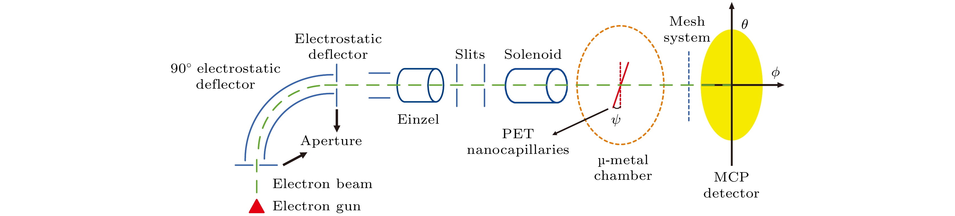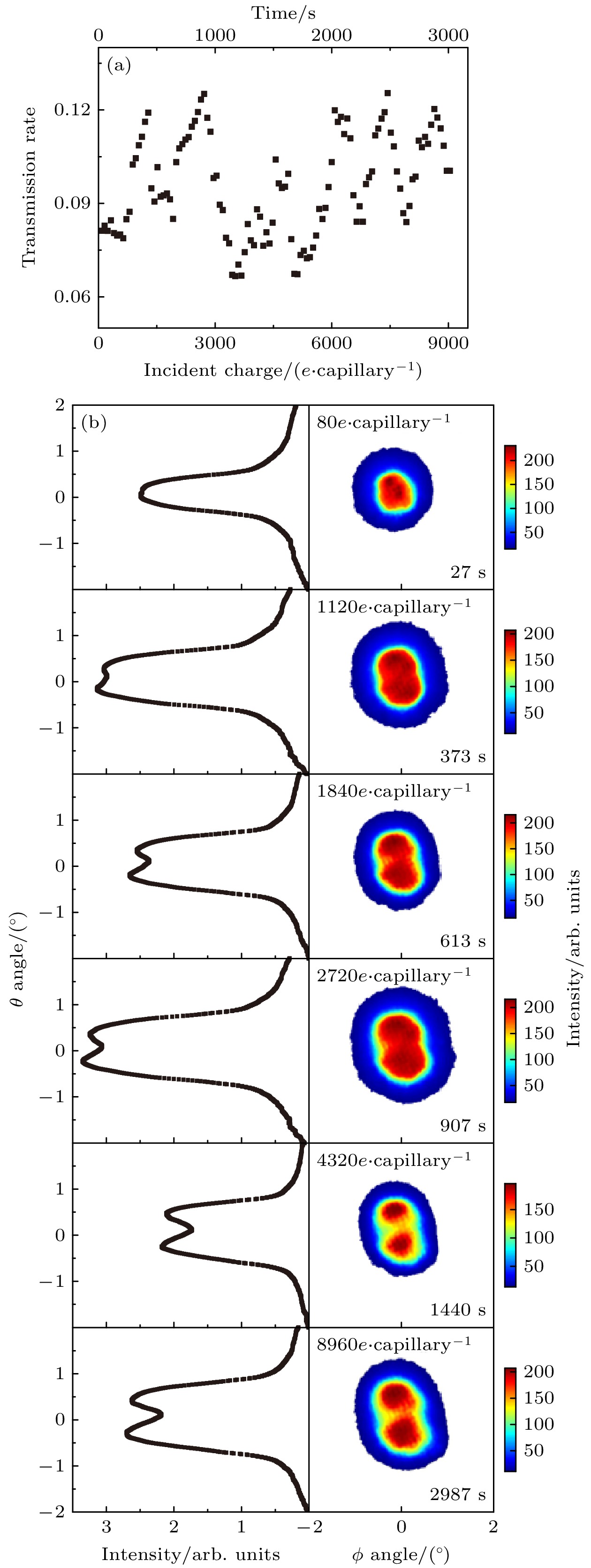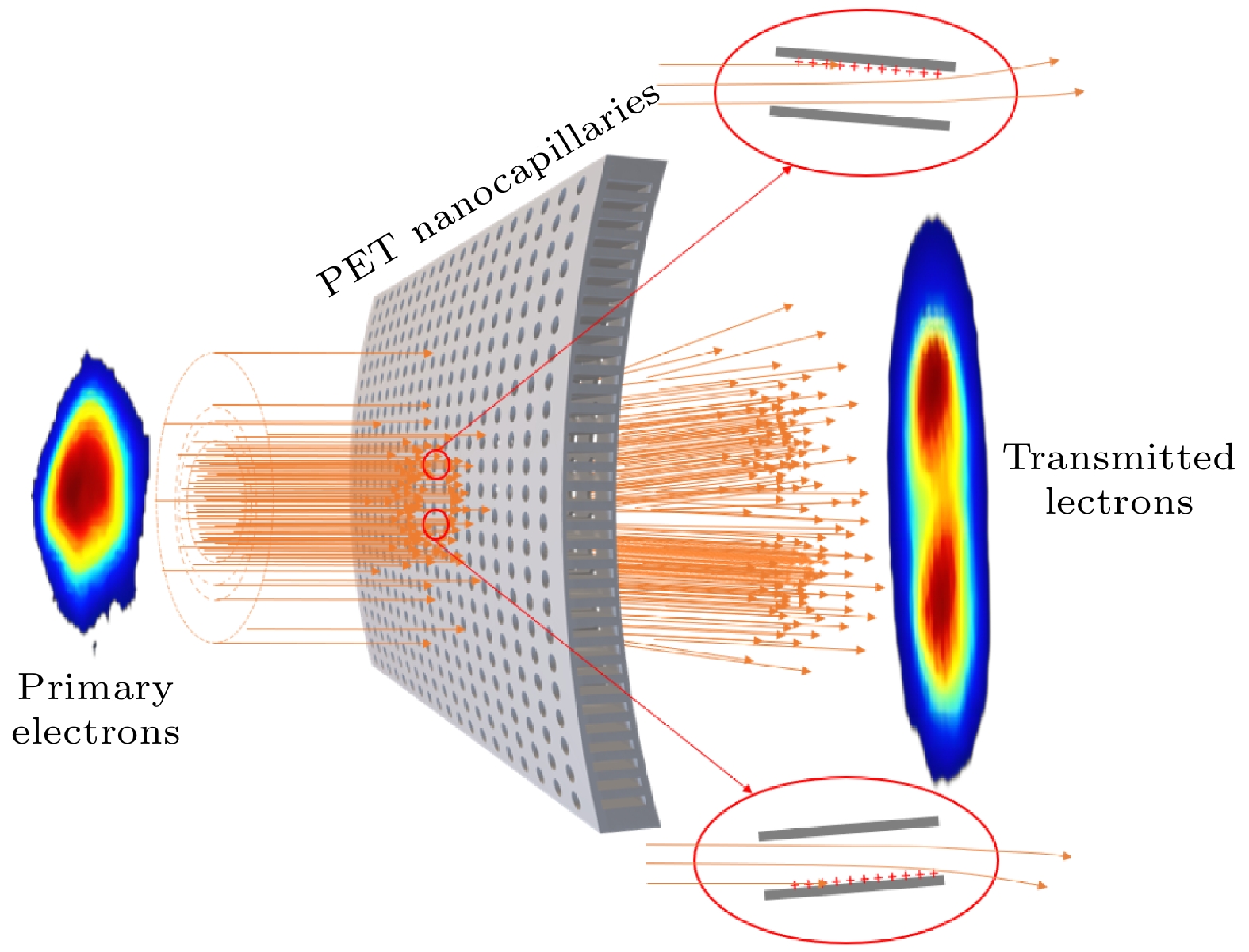 The transmission of 2-keV electrons through a polyethylene terephthalate (PET) nanocapillary with a diameter of 800 nm and a length of 10 μm is studied. The transmitted electrons are detected using microchannel plate (MCP) with a phosphor screen. It is found that the transmission rate for the transmitted electrons with the incident energy can reach up to 10 % for an aligned capillary in the beam direction, but drops to less than 1% when the tilt angle exceeds the geometrical allowable angle. The transmitted electrons with the incident energy do not move with change of tilt angle, so the incident electrons are not guided in the insulating capillary, which is different from the scenario of positive ions. In the final stage of the transmission, the angular distribution of the transmitted electrons within the geometrical allowable angle splits into two peaks along the observation angle perpendicular to the tilt angle. The time evolution of the transmitted full angular distribution shows that when the beam turns on, the transmission profile forms a single peak. As the incident charge and time accumulate, the transmission profile starts to stretch in the plane perpendicular to the tilt angle and gradually splits into two peaks. When the tilt angle of the nanocapillary exceeds the geometrical allowable angle, this splitting tends to disappear. Simulation of the charge deposition in the capillary directly exposed to the beam indicates the formation of positive charge patches, which are not conducive to guidance, as seen in the case of positive ions. According to the simulation results, we can explain our data. Then, the possible reasons for the splitting the transmission angular profiles are discussed.