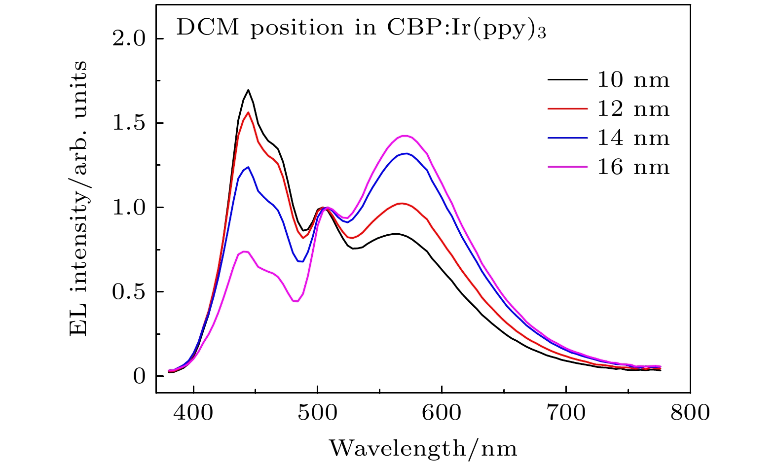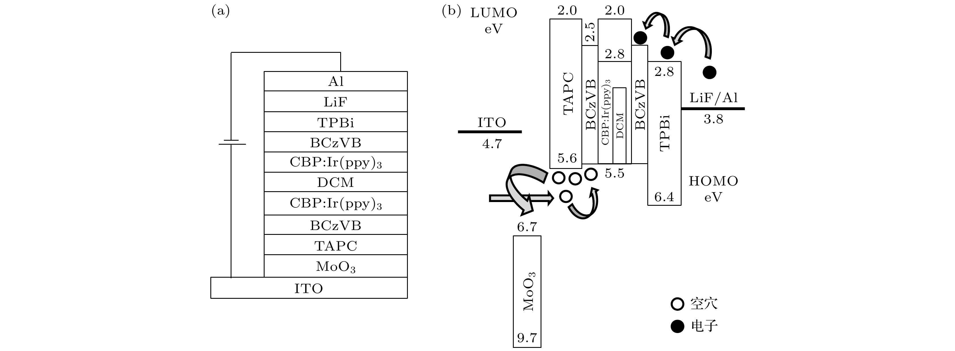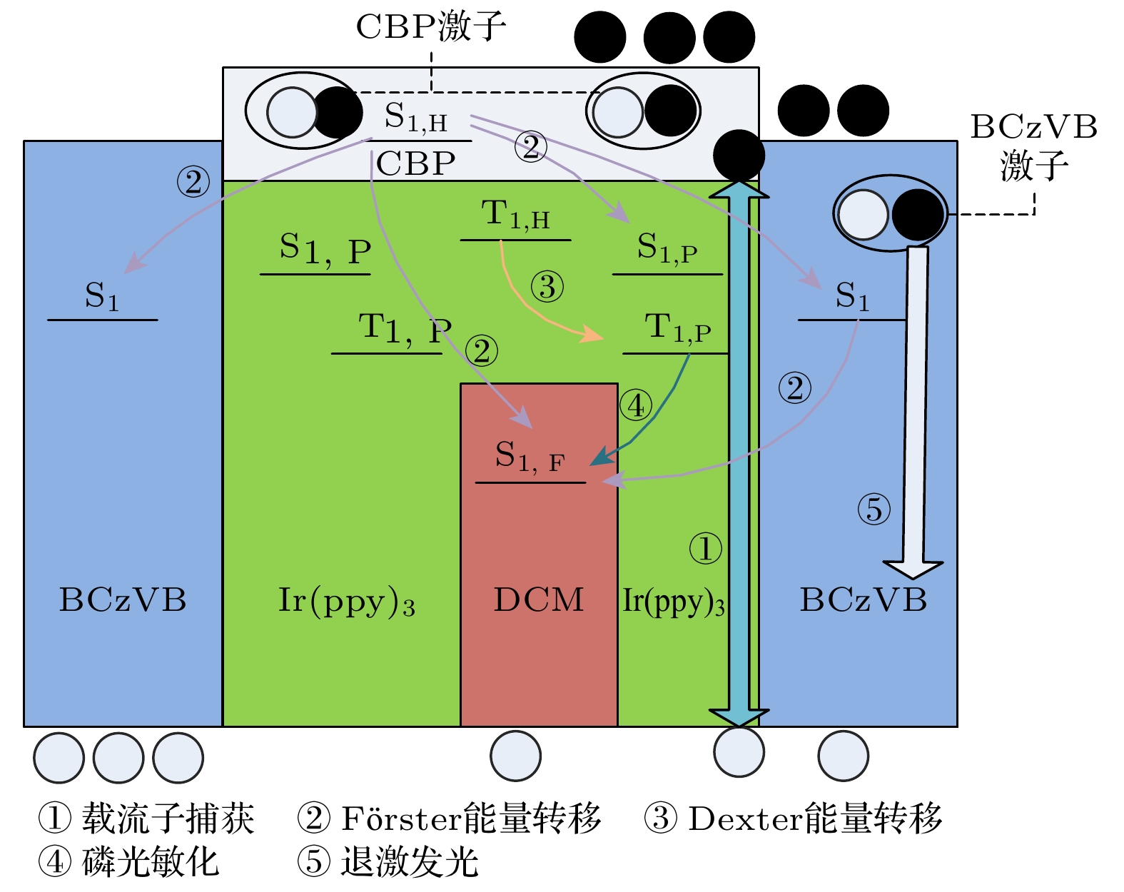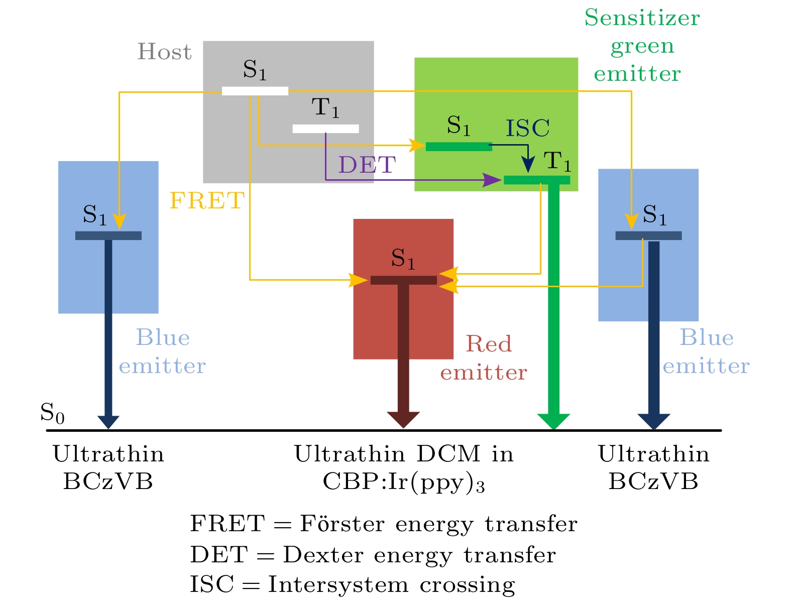 Although phosphorescent organic light-emitting devices (OLEDs) can have an internal quantum efficiency (IQE) of 100%, the IQE usually decays at high current densities due to triplet-triplet annihilation. Phosphor-sensitized fluorescence can realize the energy transfer between phosphorescent emitter and fluorescent emitter, and can be used to suppress the efficiency fluctuations and adjust the color of the device. With this in mind, white light emission including different colors of phosphorescent emitter and fluorescent emitter can be expected. Herein, phosphor-sensitized fluorescent white OLEDs are fabricated by combining ultra-thin layer insertion and doping, in which laser dyes DCM (4-(Dicyanomethylene)-2-methyl-6-(4-dimethyl-aminostyryl)-4H-pyran), iridium complexes Ir(ppy)3 (tris(2-phenylpyridine)iridium), and biphenyl ethylene derivatives BCzVB (1,4-bis[2- (3-N-ethylcarbazoryl)vinyl]benzene) are used as red, green and blue emitters, respectively. By adjusting the doping concentration of Ir(ppy)3 phosphorescent green emitter in CBP (4,4’-N,N’-dicarbazole-biphyenyl) host, with ultra-thin layers of BCzVB fluorescent blue emitter on both sides of CBP:Ir(ppy)3 doping system and with ultra-thin layer of DCM fluorescent red emitter inserting in CBP:Ir(ppy)3 layer, the three colors can be balanced. White emissions are obtained in the device, the highest external quantum efficiency is 2.5% (current efficiency of 5.1 cd/A), the maximum brightness is 12400 cd/m2, and Commission Internationale de l'Eclairage (CIE) co-ordinates can reach the ideal white light equilibrium point (0.33, 0.33) at a current density of 1 mA/cm2. The acquisition of white light is attributed to the appropriate doping ratio of Ir(ppy)3 and the position of DCM, which effectively balances the emission ratio of three primary colors: red, green, and blue. The results indicate that the partially energy transfer of triplet excitons to singlet excitons by phosphor-sensitized fluorescence scheme can be used to realize high-efficiency white organic electroluminescent devices, thereby reducing energy consumption and providing more room for promoting OLED applications.