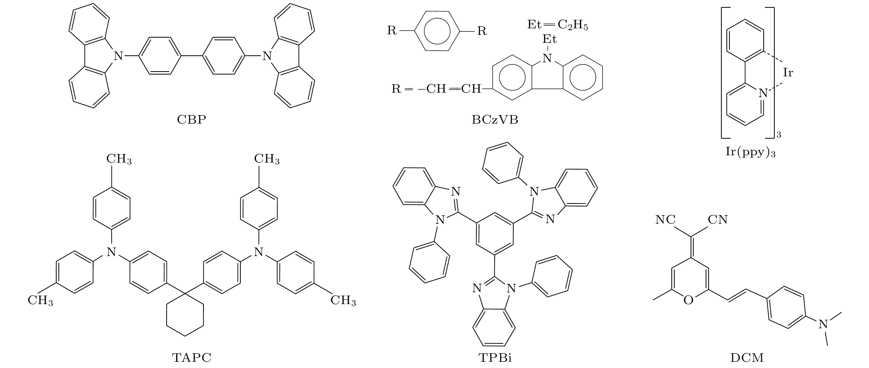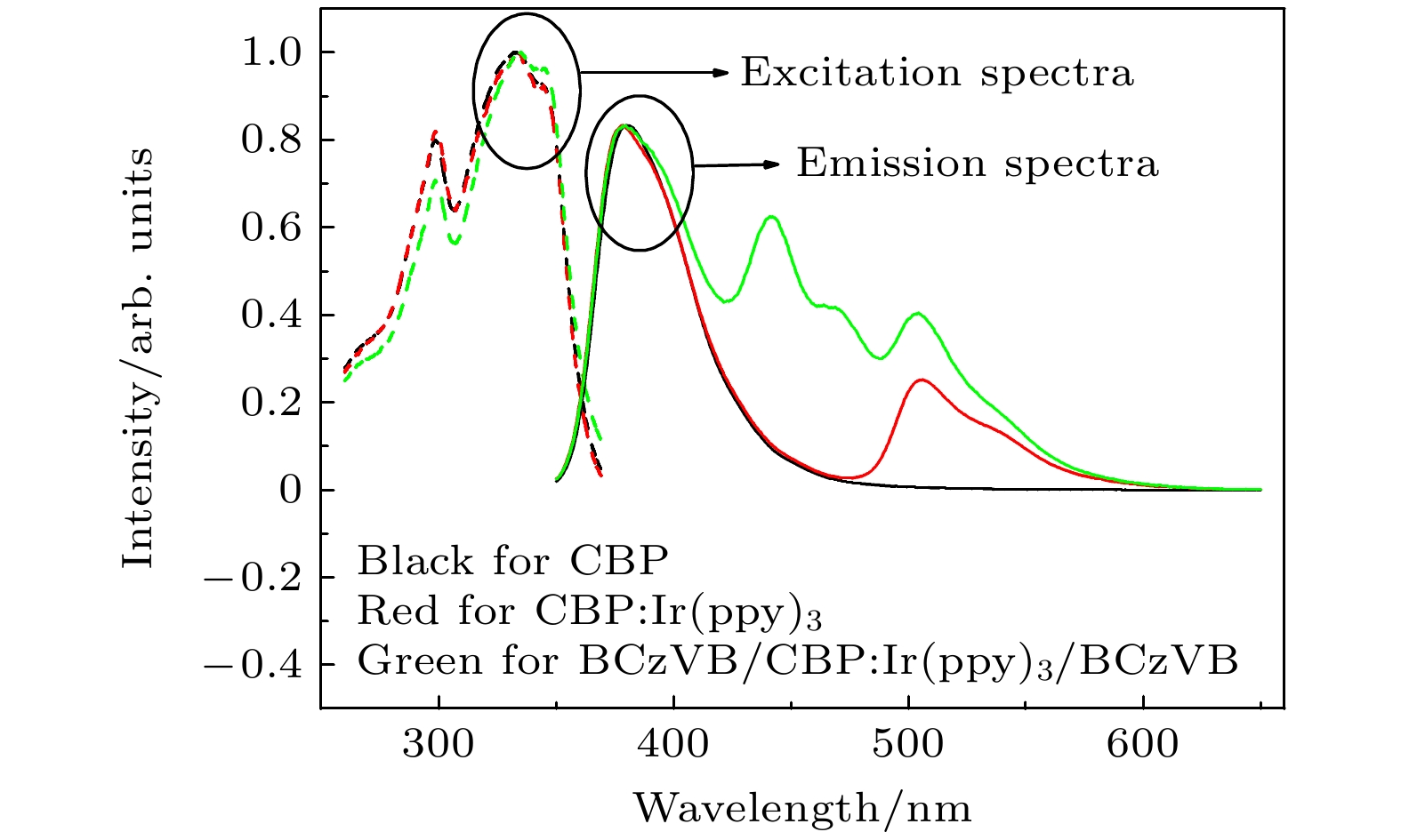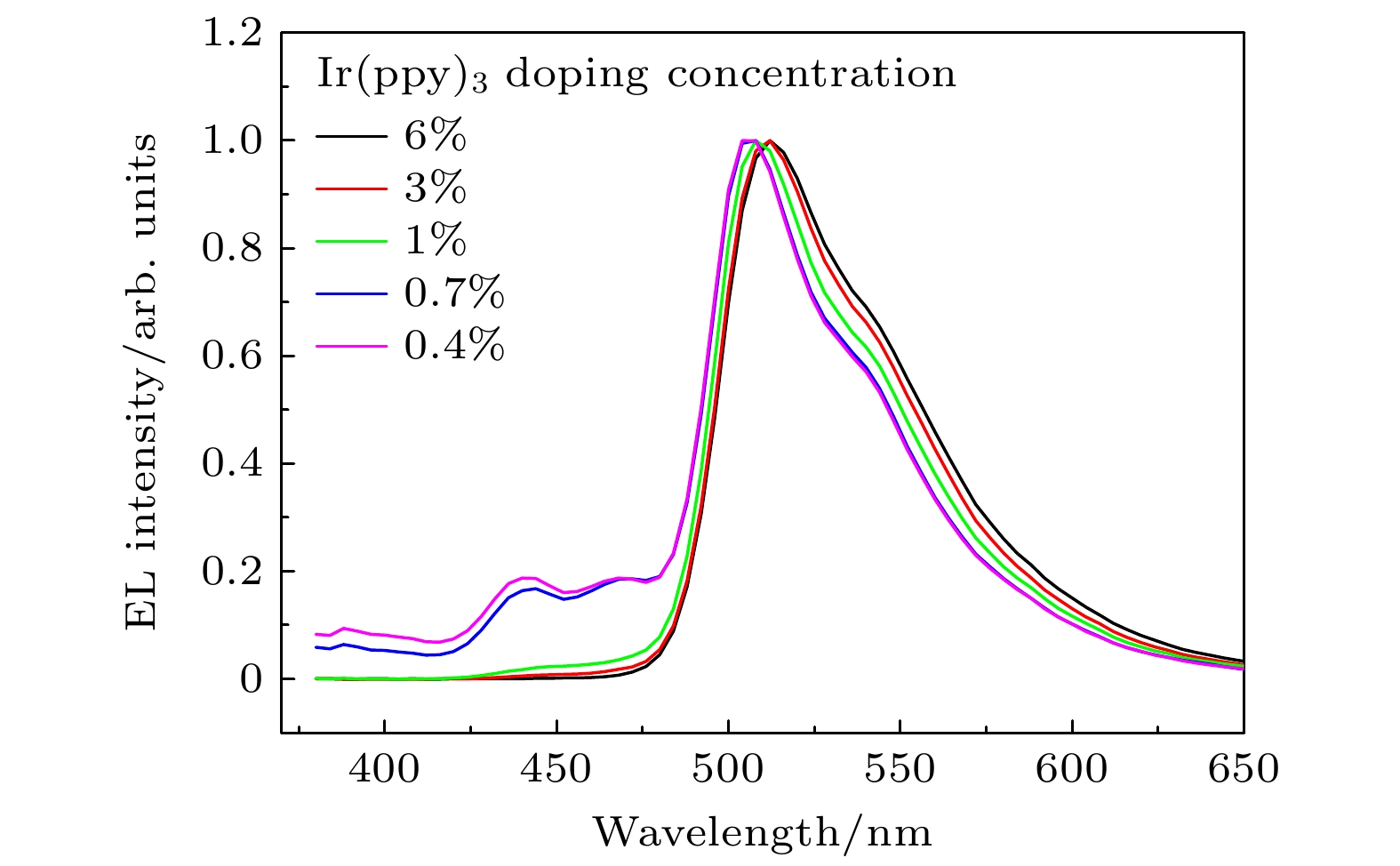 Although phosphorescent organic light-emitting devices (OLEDs) can have an internal quantum efficiency (IQE) of 100%, the IQE usually decays at high current densities due to triplet-triplet annihilation. Phosphor-sensitized fluorescence can realize the energy transfer between phosphorescent emitter and fluorescent emitter, and can be used to suppress the efficiency fluctuations and adjust the color of the device. With this in mind, white light emission including different colors of phosphorescent emitter and fluorescent emitter can be expected. Herein, phosphor-sensitized fluorescent white OLEDs are fabricated by combining ultra-thin layer insertion and doping, in which laser dyes DCM (4-(Dicyanomethylene)-2-methyl-6-(4-dimethyl-aminostyryl)-4H-pyran), iridium complexes Ir(ppy)3 (tris(2-phenylpyridine)iridium), and biphenyl ethylene derivatives BCzVB (1,4-bis[2- (3-N-ethylcarbazoryl)vinyl]benzene) are used as red, green and blue emitters, respectively. By adjusting the doping concentration of Ir(ppy)3 phosphorescent green emitter in CBP (4,4’-N,N’-dicarbazole-biphyenyl) host, with ultra-thin layers of BCzVB fluorescent blue emitter on both sides of CBP:Ir(ppy)3 doping system and with ultra-thin layer of DCM fluorescent red emitter inserting in CBP:Ir(ppy)3 layer, the three colors can be balanced. White emissions are obtained in the device, the highest external quantum efficiency is 2.5% (current efficiency of 5.1 cd/A), the maximum brightness is 12400 cd/m2, and Commission Internationale de l'Eclairage (CIE) co-ordinates can reach the ideal white light equilibrium point (0.33, 0.33) at a current density of 1 mA/cm2. The acquisition of white light is attributed to the appropriate doping ratio of Ir(ppy)3 and the position of DCM, which effectively balances the emission ratio of three primary colors: red, green, and blue. The results indicate that the partially energy transfer of triplet excitons to singlet excitons by phosphor-sensitized fluorescence scheme can be used to realize high-efficiency white organic electroluminescent devices, thereby reducing energy consumption and providing more room for promoting OLED applications.