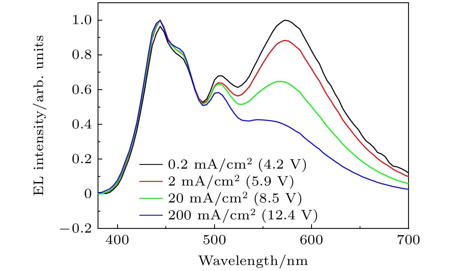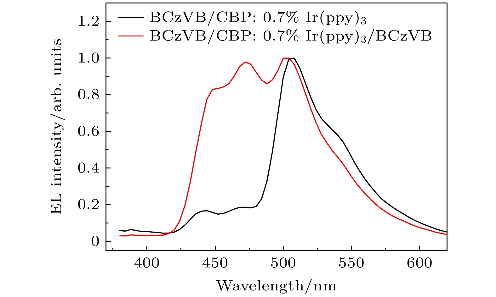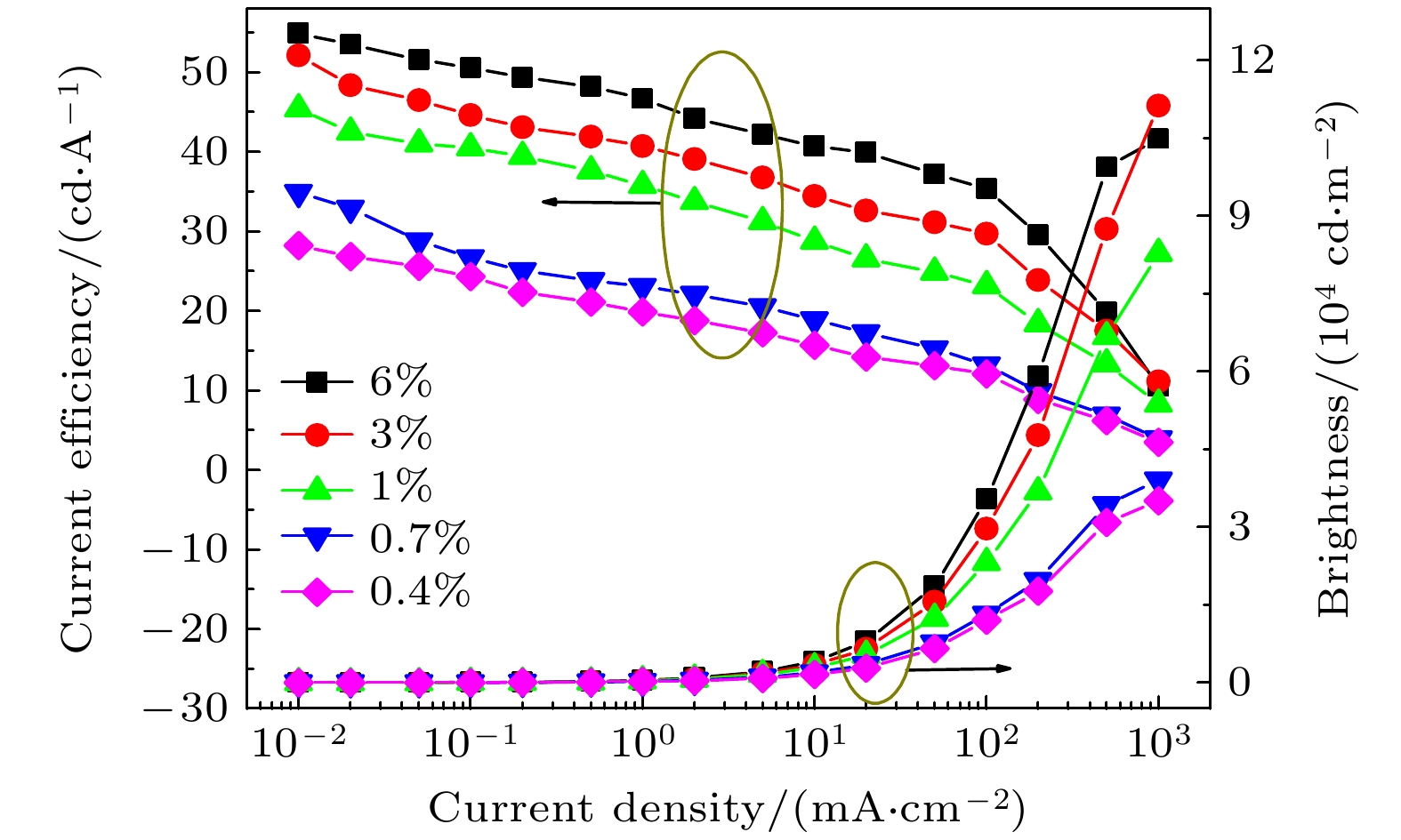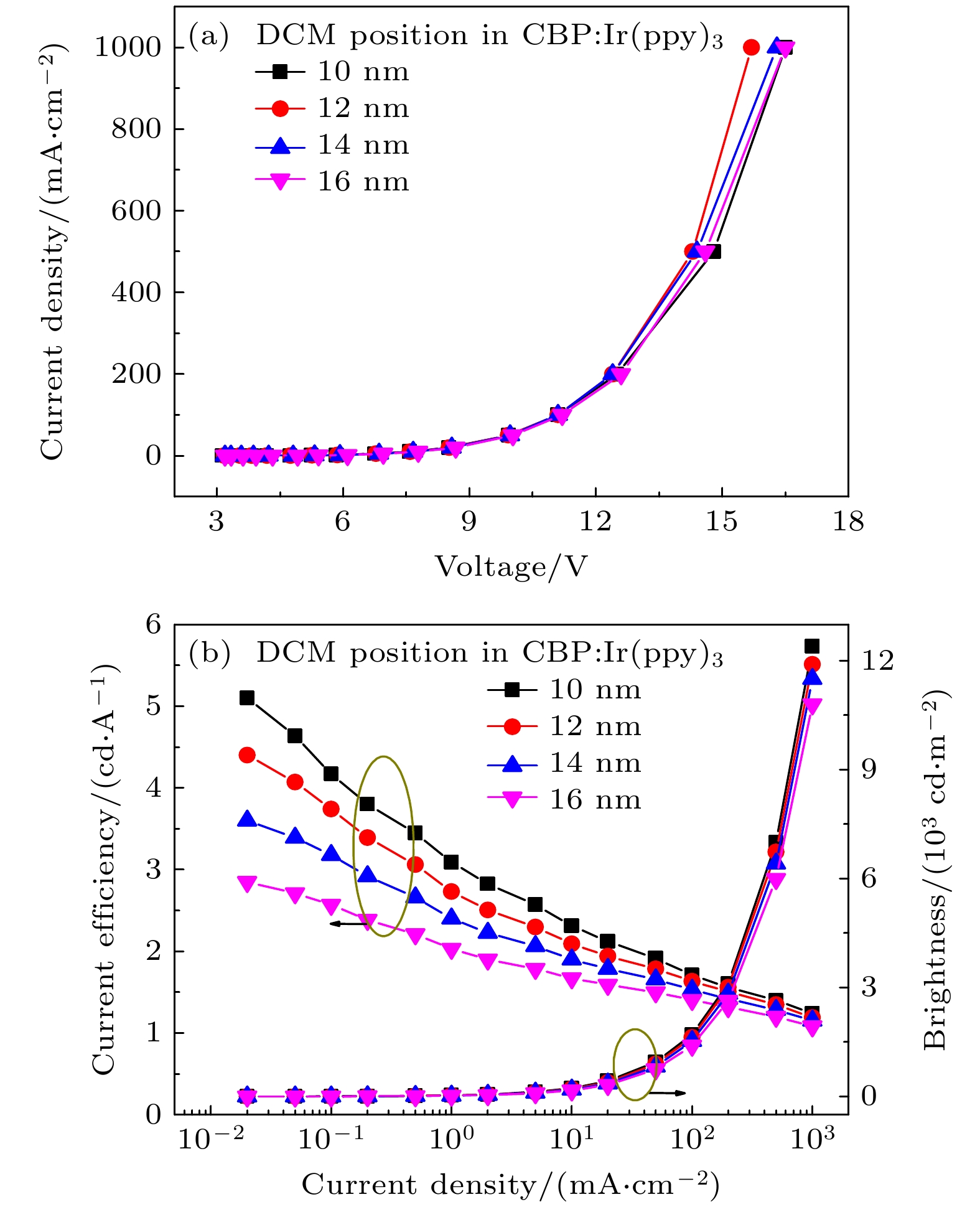 Although phosphorescent organic light-emitting devices (OLEDs) can have an internal quantum efficiency (IQE) of 100%, the IQE usually decays at high current densities due to triplet-triplet annihilation. Phosphor-sensitized fluorescence can realize the energy transfer between phosphorescent emitter and fluorescent emitter, and can be used to suppress the efficiency fluctuations and adjust the color of the device. With this in mind, white light emission including different colors of phosphorescent emitter and fluorescent emitter can be expected. Herein, phosphor-sensitized fluorescent white OLEDs are fabricated by combining ultra-thin layer insertion and doping, in which laser dyes DCM (4-(Dicyanomethylene)-2-methyl-6-(4-dimethyl-aminostyryl)-4H-pyran), iridium complexes Ir(ppy)3 (tris(2-phenylpyridine)iridium), and biphenyl ethylene derivatives BCzVB (1,4-bis[2- (3-N-ethylcarbazoryl)vinyl]benzene) are used as red, green and blue emitters, respectively. By adjusting the doping concentration of Ir(ppy)3 phosphorescent green emitter in CBP (4,4’-N,N’-dicarbazole-biphyenyl) host, with ultra-thin layers of BCzVB fluorescent blue emitter on both sides of CBP:Ir(ppy)3 doping system and with ultra-thin layer of DCM fluorescent red emitter inserting in CBP:Ir(ppy)3 layer, the three colors can be balanced. White emissions are obtained in the device, the highest external quantum efficiency is 2.5% (current efficiency of 5.1 cd/A), the maximum brightness is 12400 cd/m2, and Commission Internationale de l'Eclairage (CIE) co-ordinates can reach the ideal white light equilibrium point (0.33, 0.33) at a current density of 1 mA/cm2. The acquisition of white light is attributed to the appropriate doping ratio of Ir(ppy)3 and the position of DCM, which effectively balances the emission ratio of three primary colors: red, green, and blue. The results indicate that the partially energy transfer of triplet excitons to singlet excitons by phosphor-sensitized fluorescence scheme can be used to realize high-efficiency white organic electroluminescent devices, thereby reducing energy consumption and providing more room for promoting OLED applications.